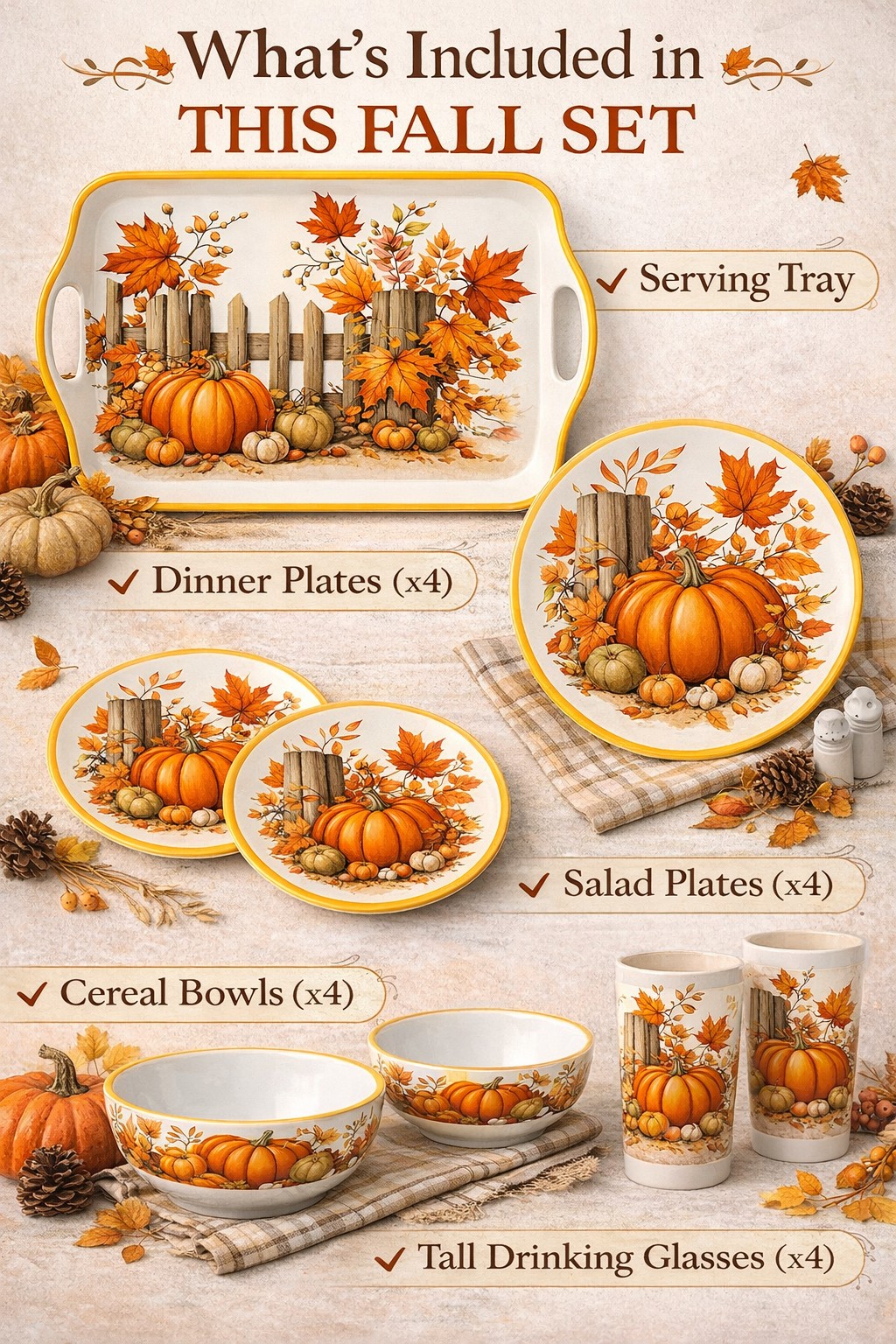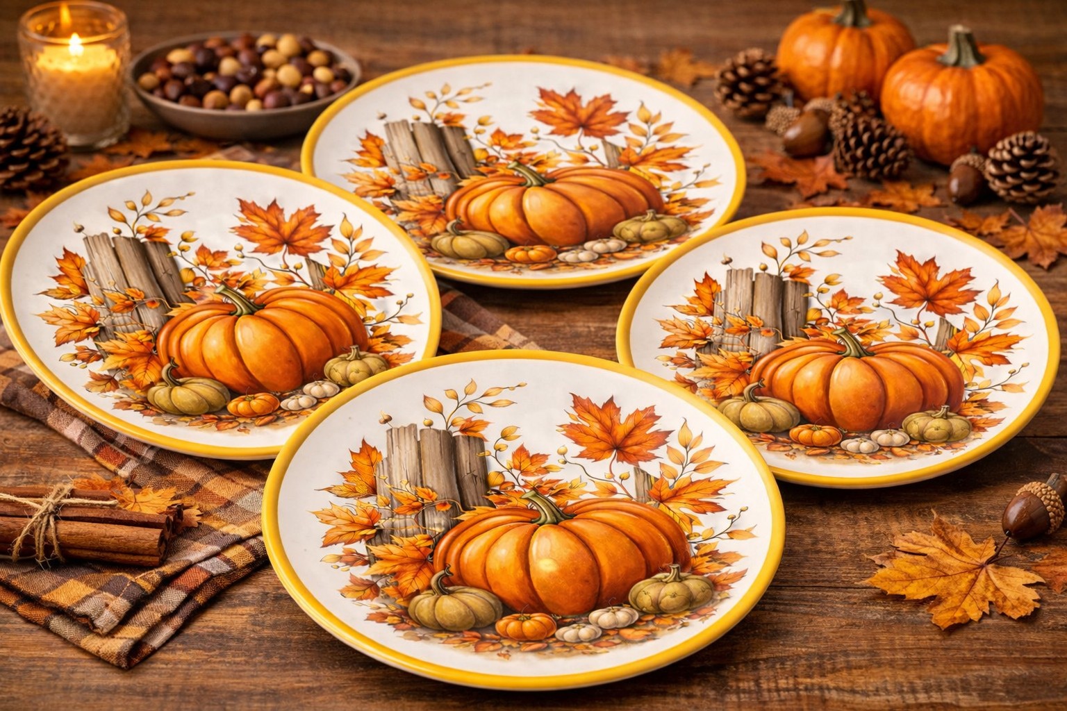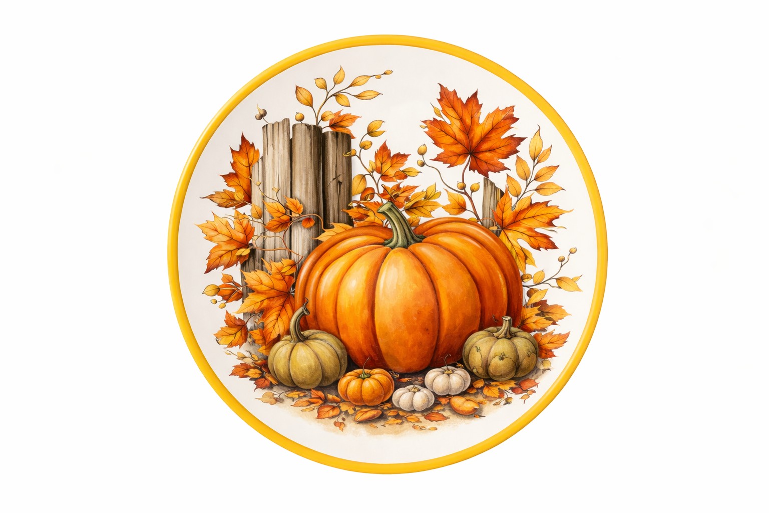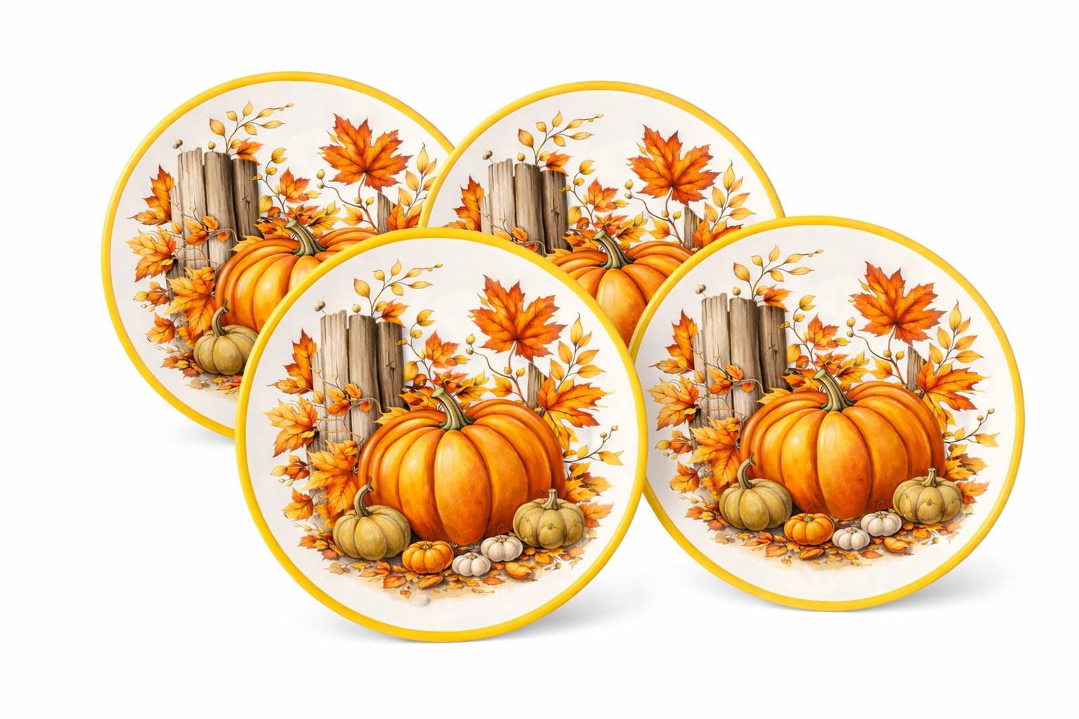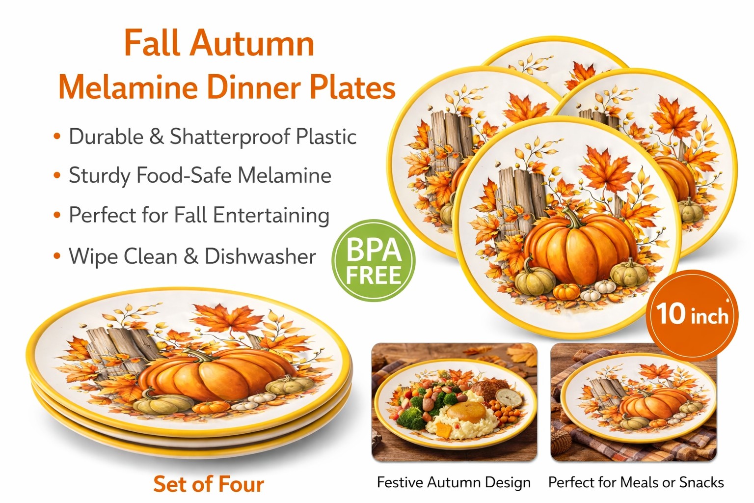 Fall Harvest Pumpkin Melamine Dinner Plates Set of 4 featuring an autumn harvest pumpkin design. Made of durable and lightweight melamine, this melamine dinner plates set is suitable for fall and Thanksgiving seasonal dining and everyday table use.