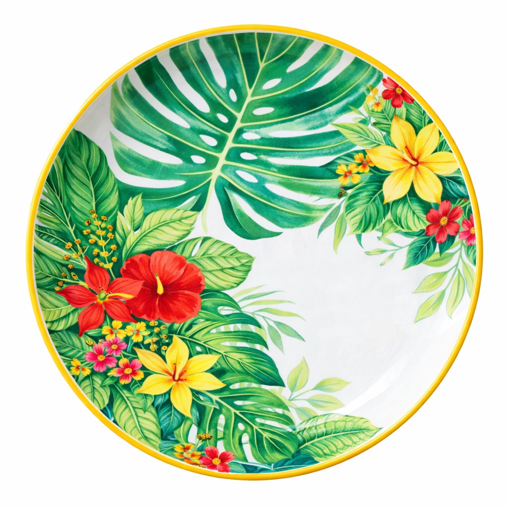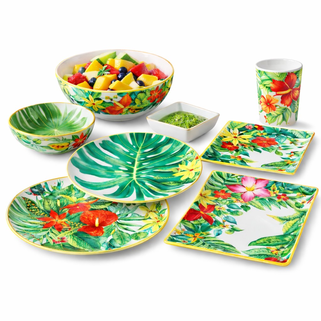 Includes plates, bowls, trays, and other matching items within the same tropical design.
