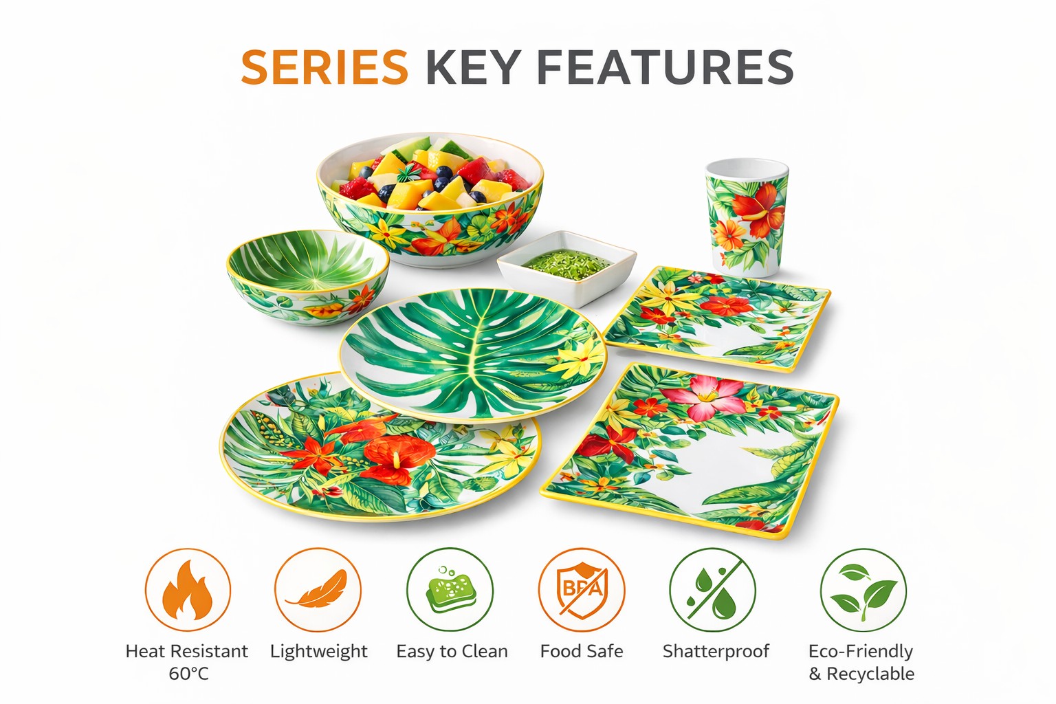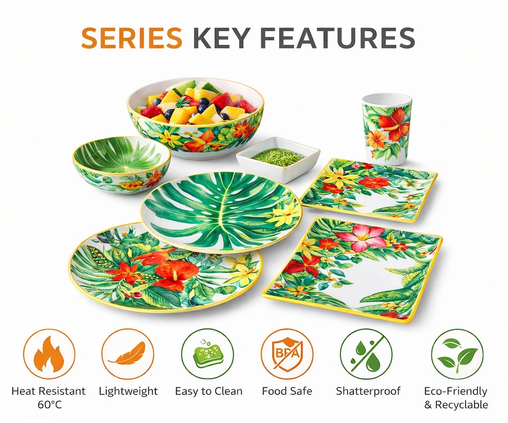 A complete collection of melamine tableware designed to create matching and harmonious tableware sets.