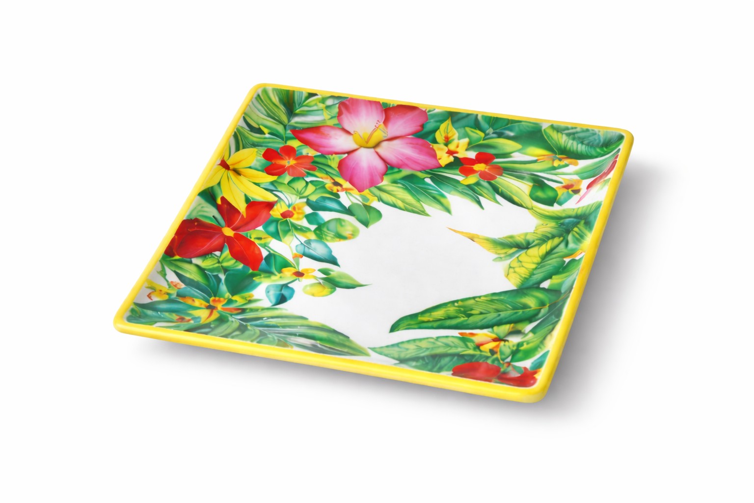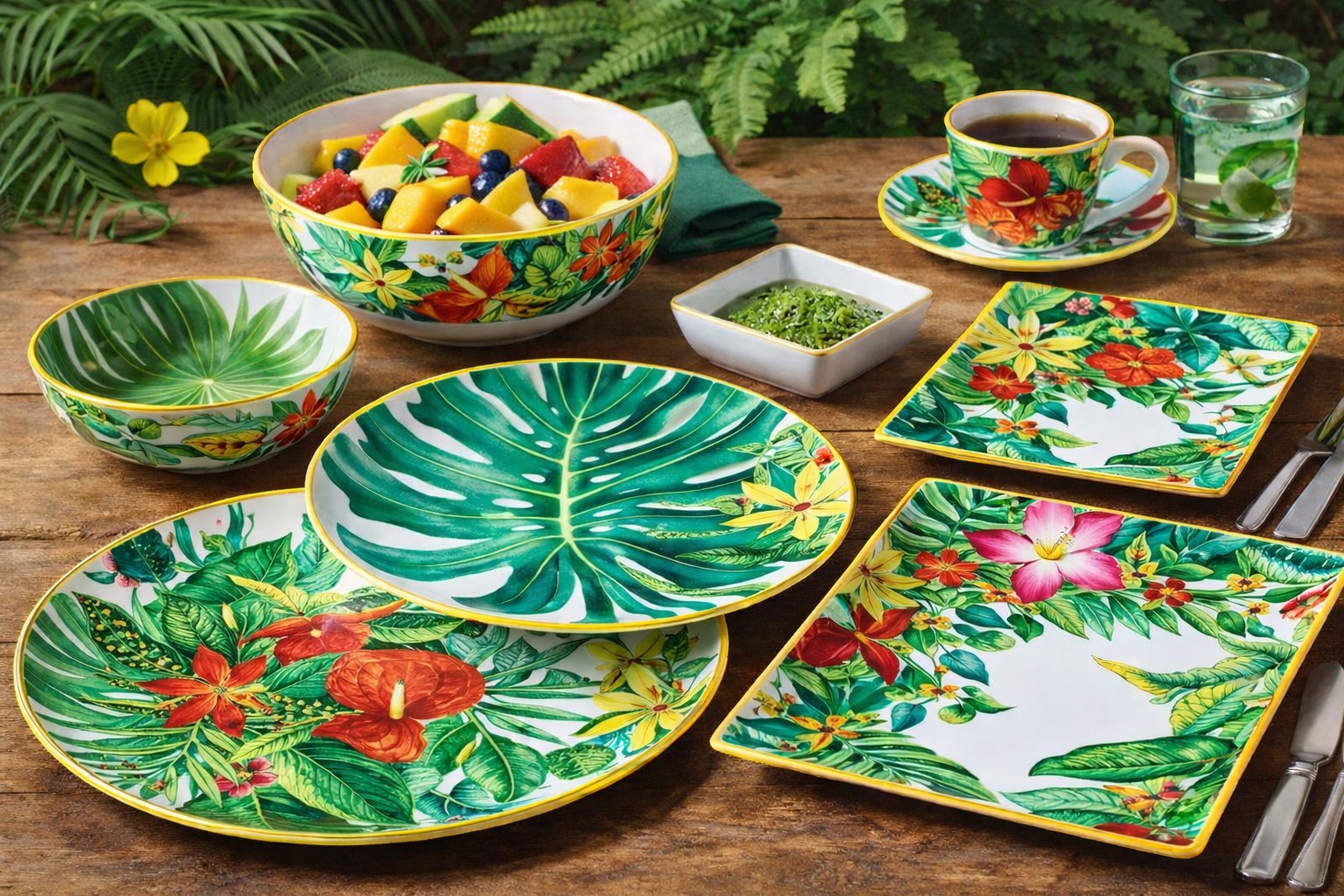 Vibrant tropical leaf and floral prints inspired by nature, ideal for colorful and coordinated table settings.