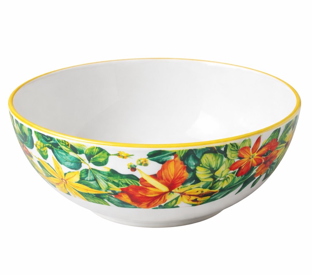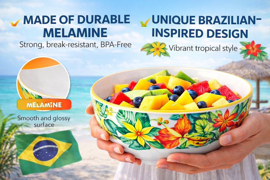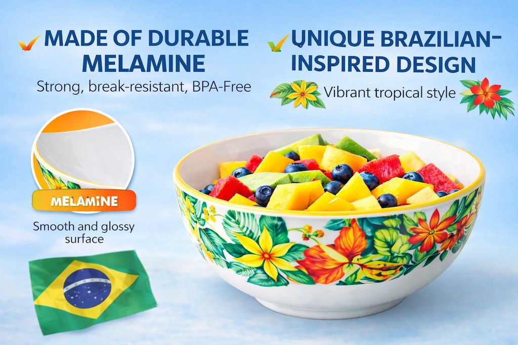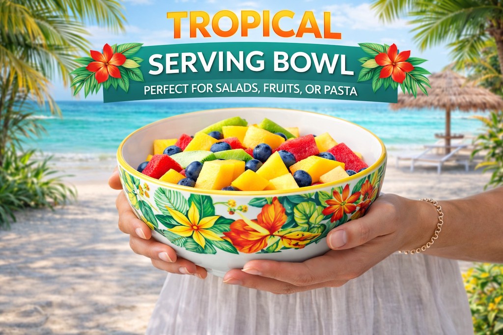Features vibrant tropical leaf and floral patterns that enhance table presentation.