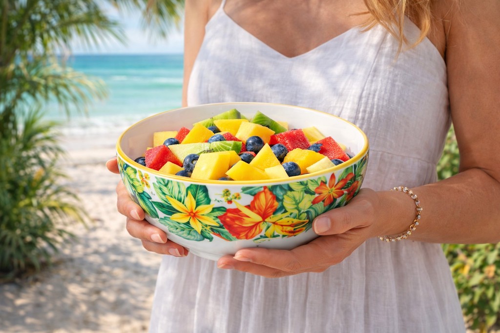 Designed to match plates, cups, trays, and other items from the same tropical series.