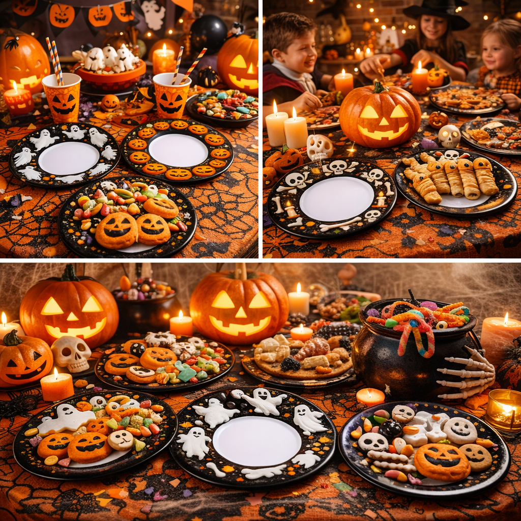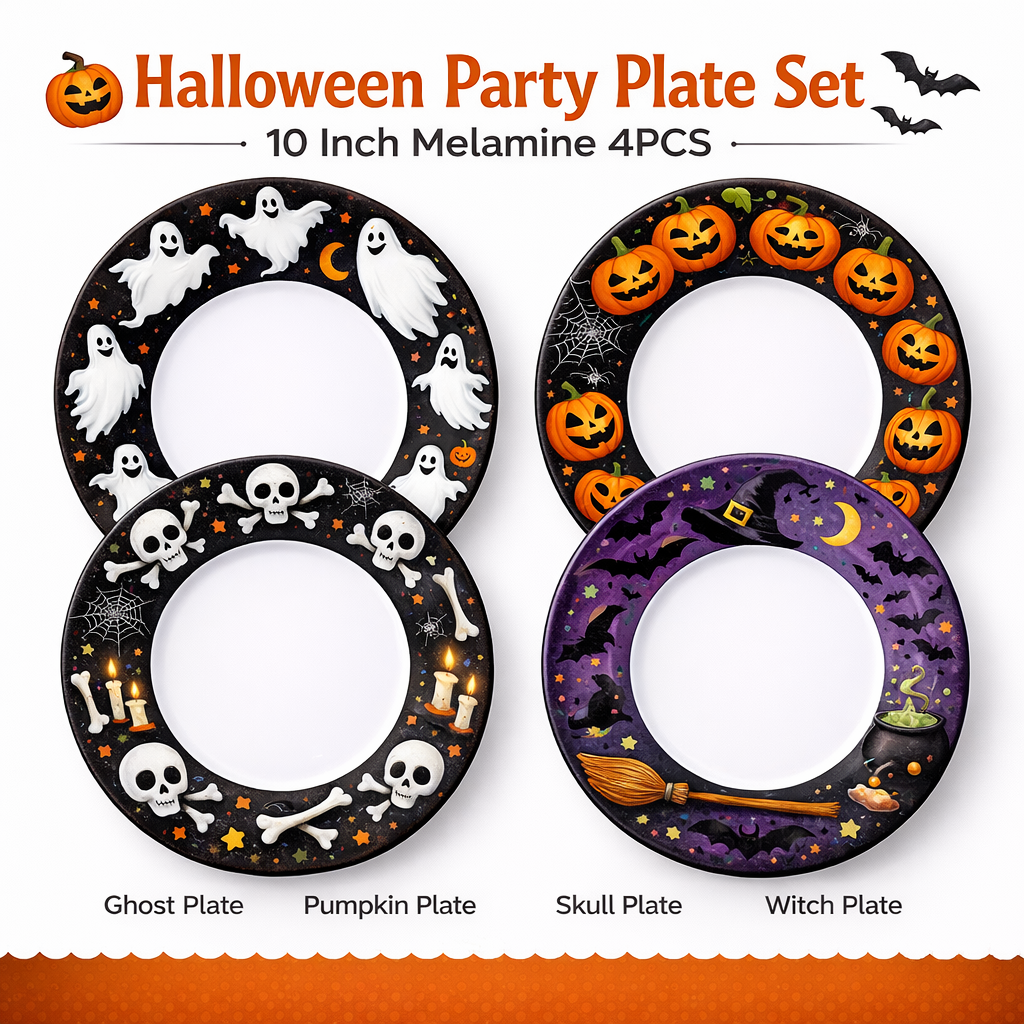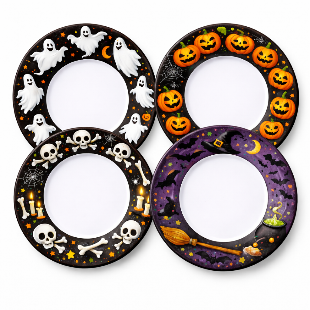 Includes 4 unique designs: Ghost, Pumpkin, Skull, and Witch plates—perfect for Halloween parties and themed events.