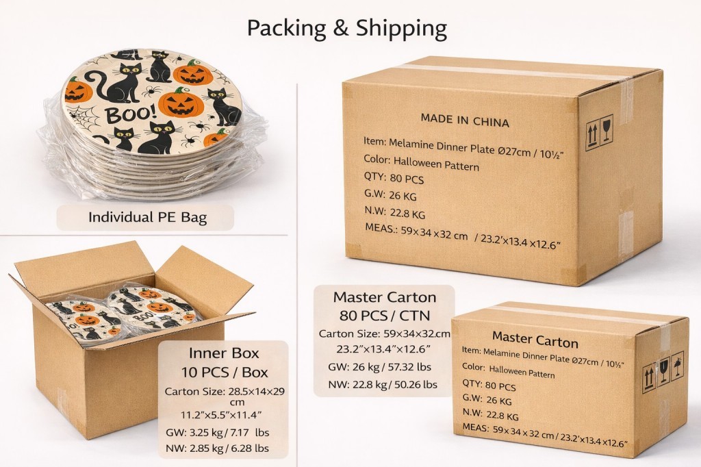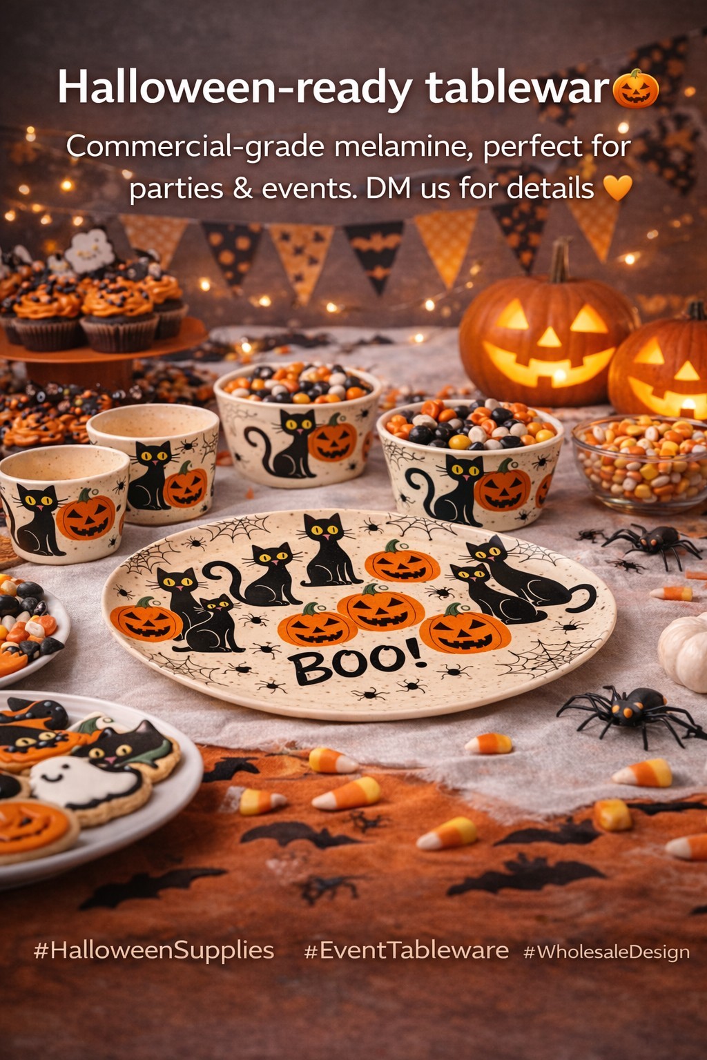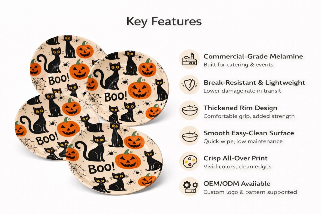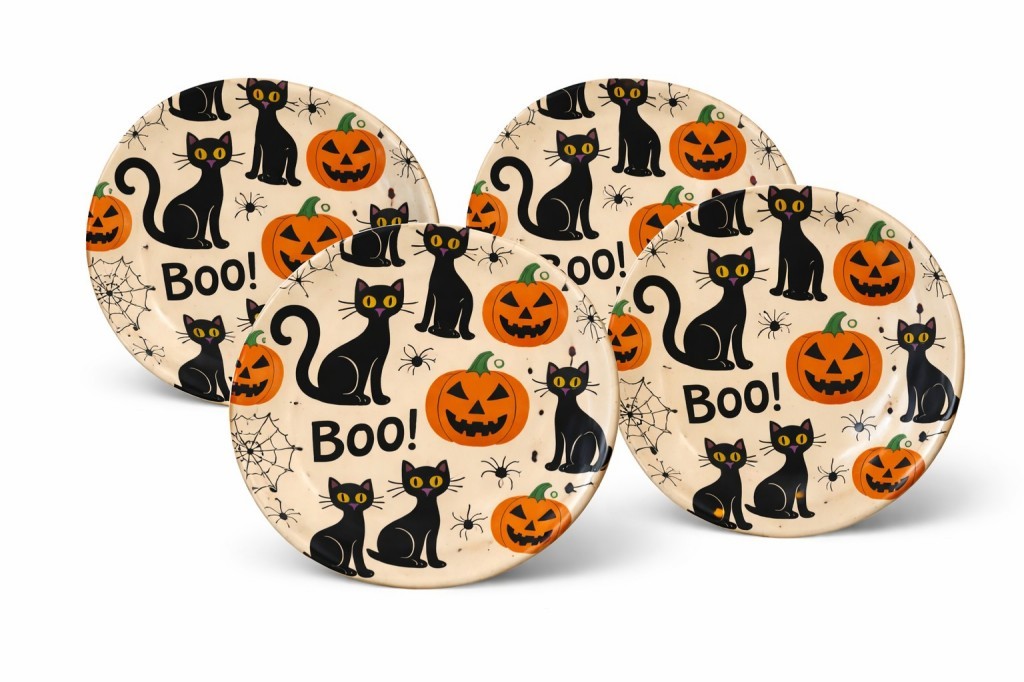Halloween Melamine Dinner Plate Large Black Cat Pumpkin Design
