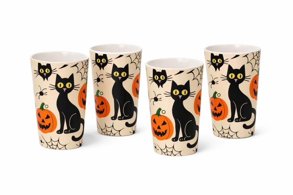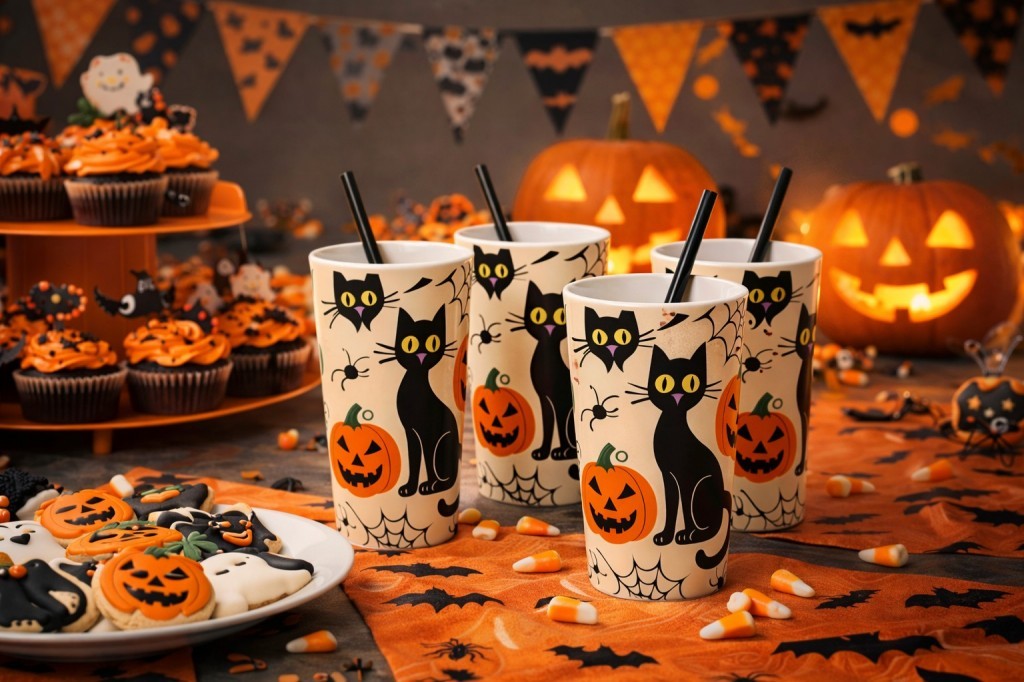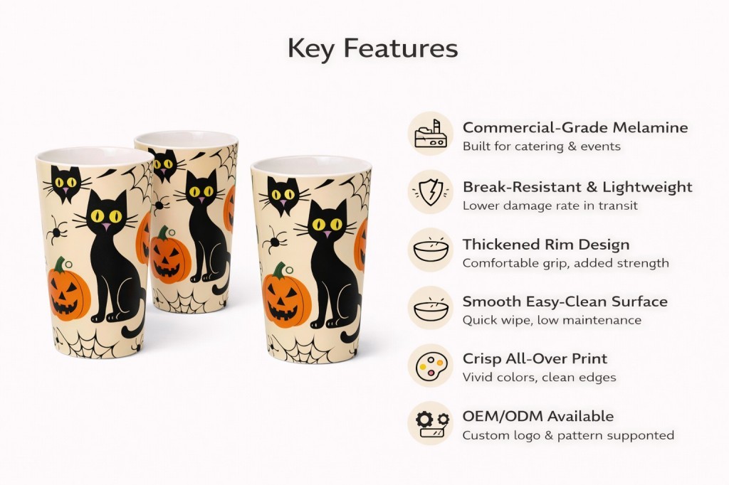 Halloween melamine cup for drinksCute black cat & pumpkin designDurable, lightweight melamine materialKid-friendly, shatter-resistantPerfect for parties & daily useReusable and easy to clean