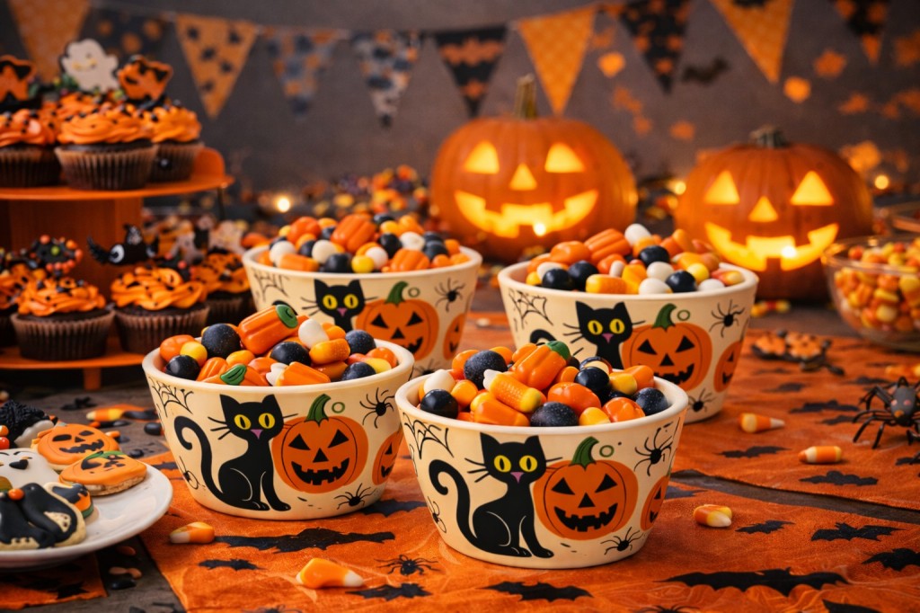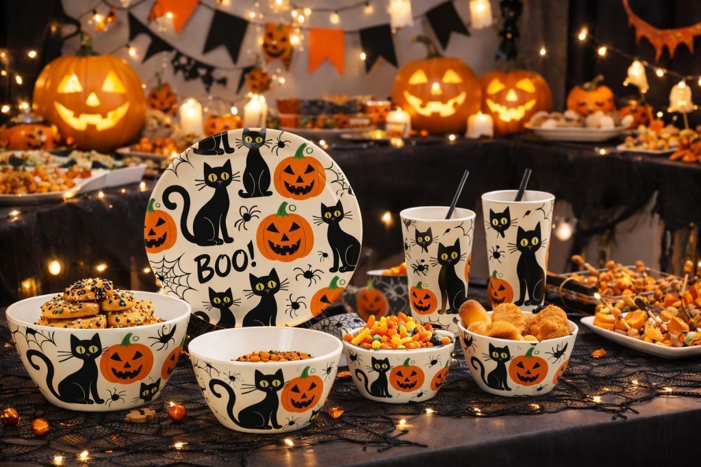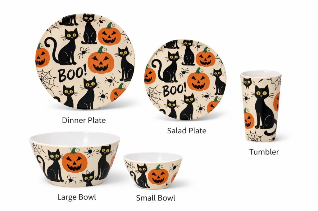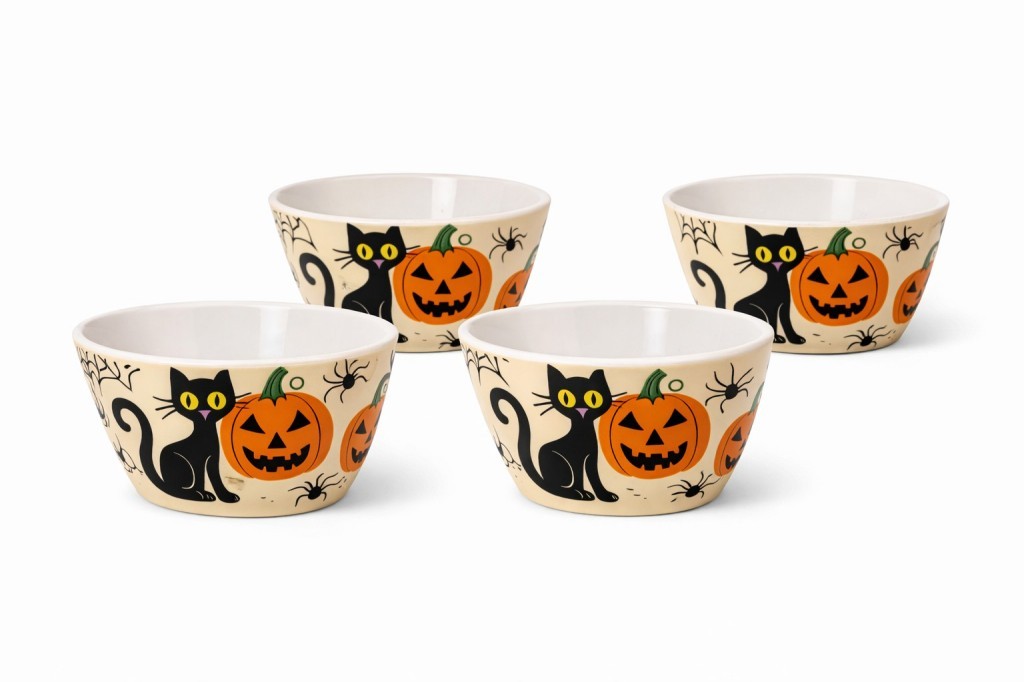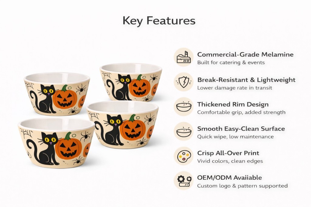 6-inch Halloween melamine salad bowlCute black cat & pumpkin designDurable, lightweight melamine materialKid-friendly, shatter-resistantPerfect for snacks, salads & partiesReusable and easy to clean