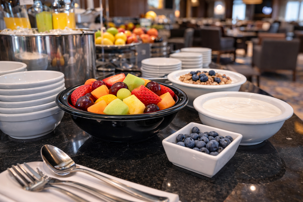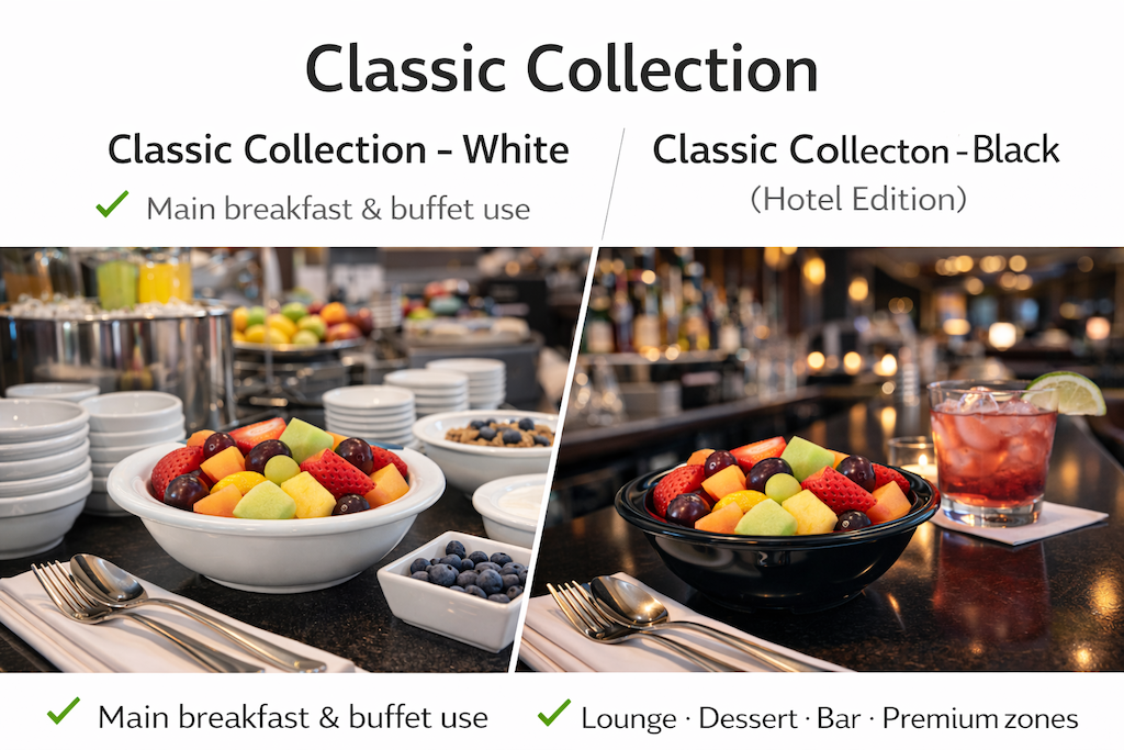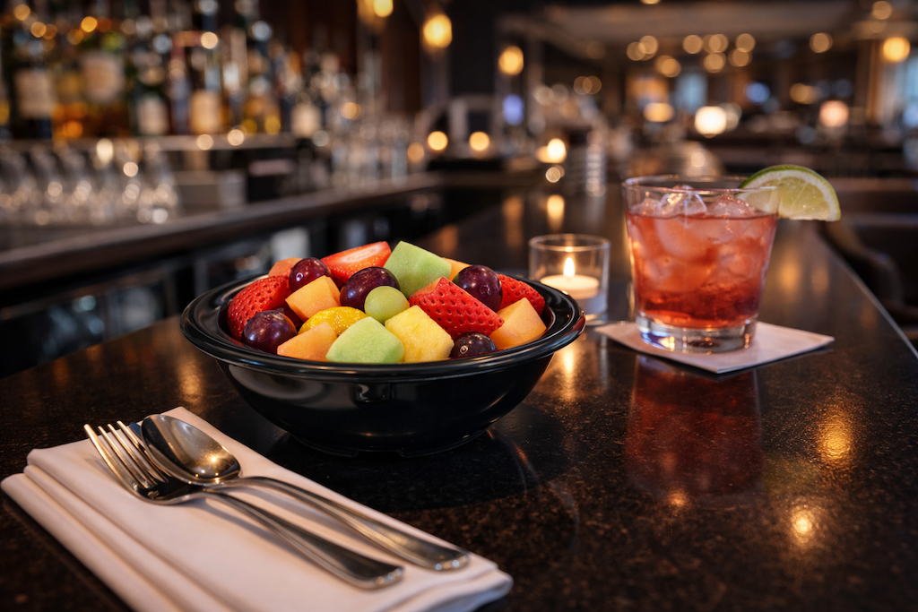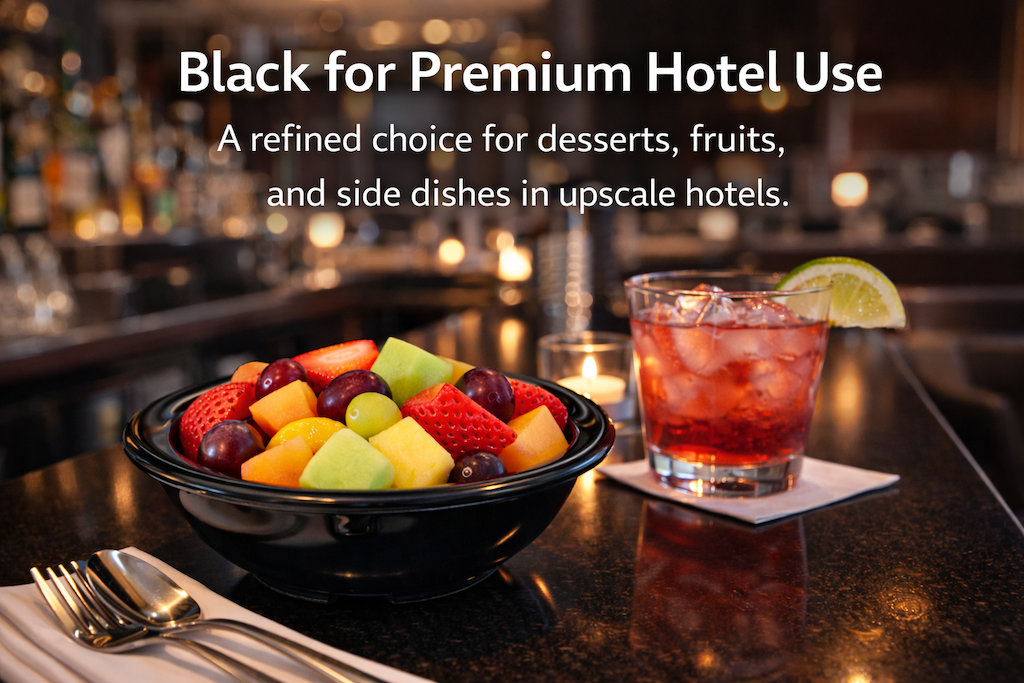 Designed specifically for upscale hotel environments, this black melamine bowl enhances food presentation with a modern and elegant look. Ideal for hotel breakfast premium sections, dessert service, lounges, and bar areas.