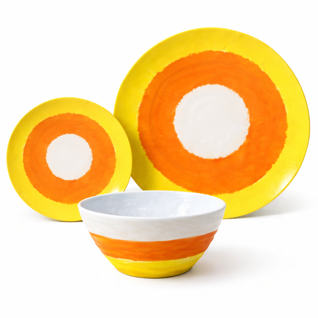 White, orange, and yellow layers inspired by classic Halloween candy corn for a festive look.