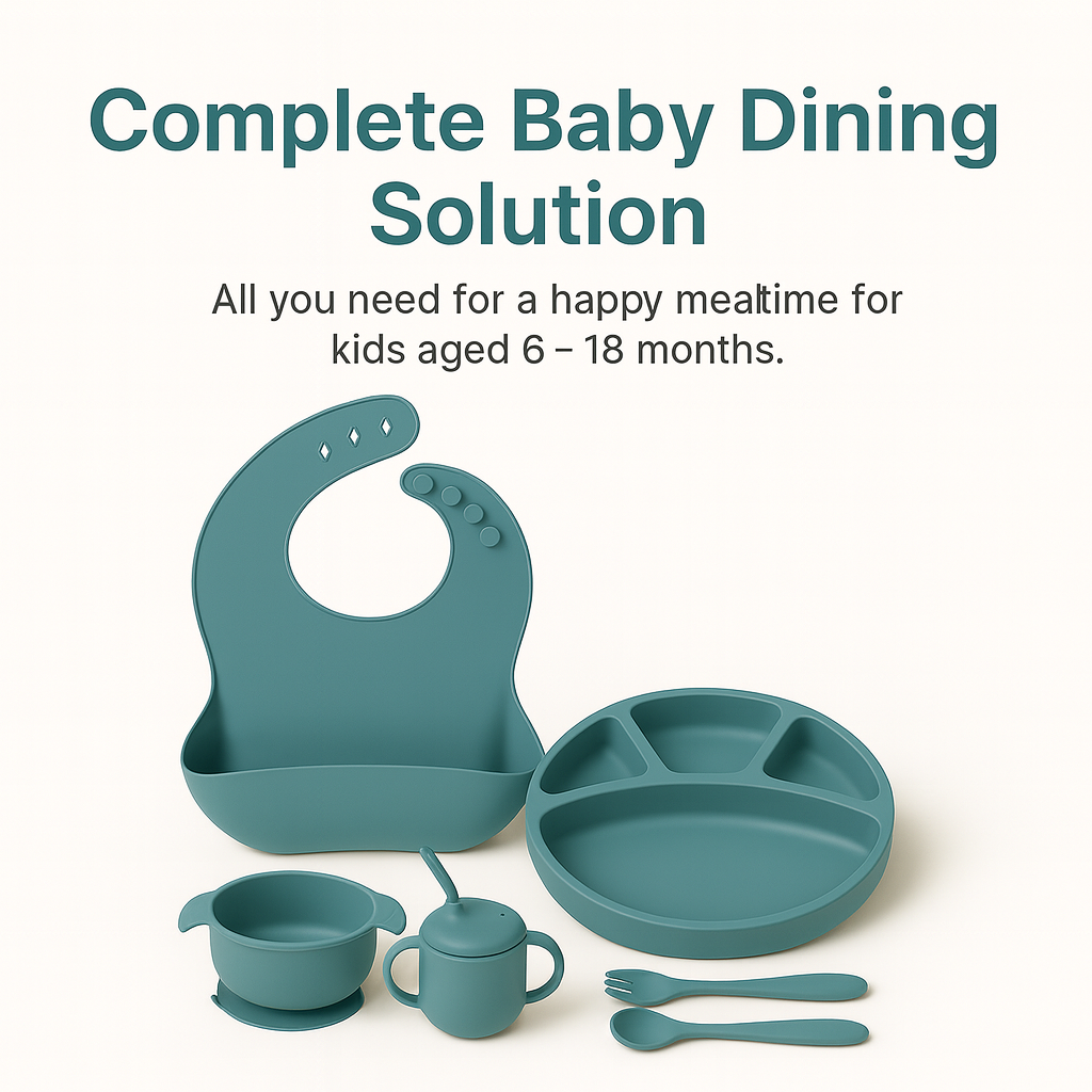 Pair the plate with matching bib, bowl, cup, and utensils — everything your baby