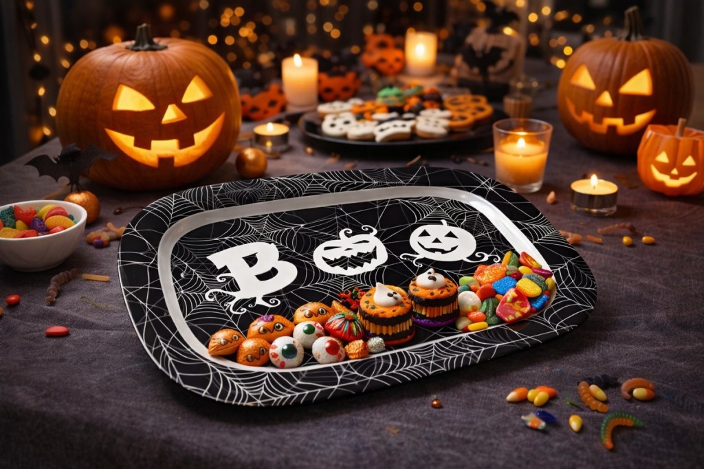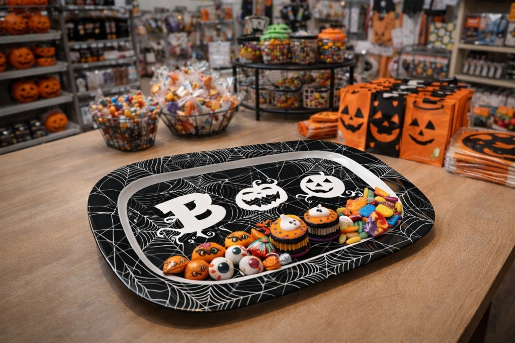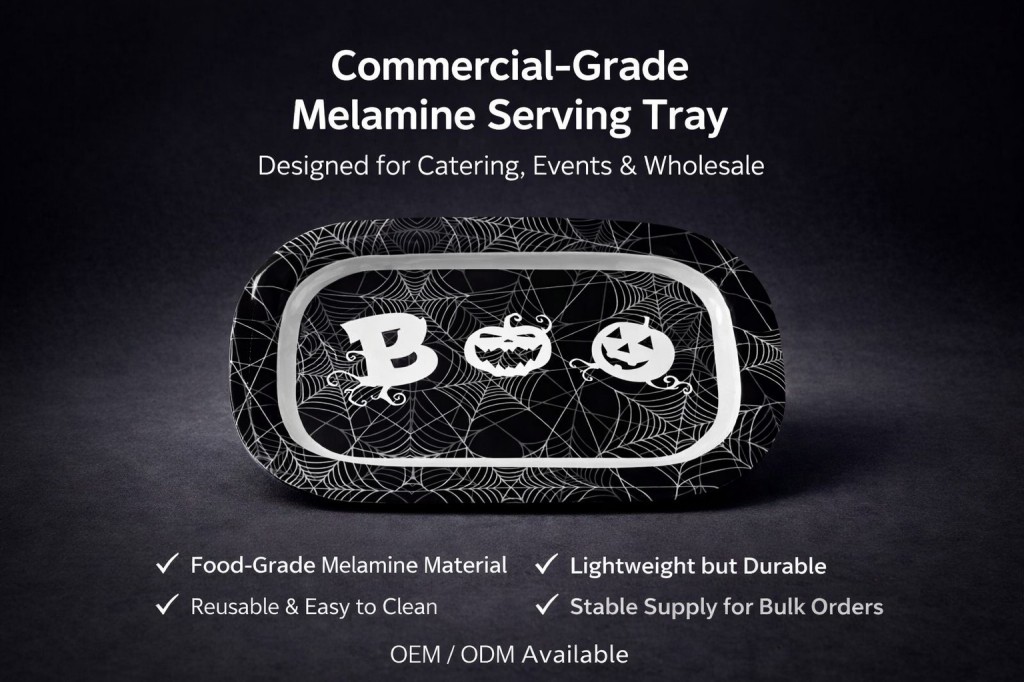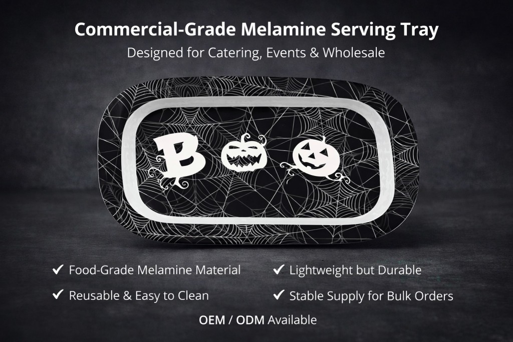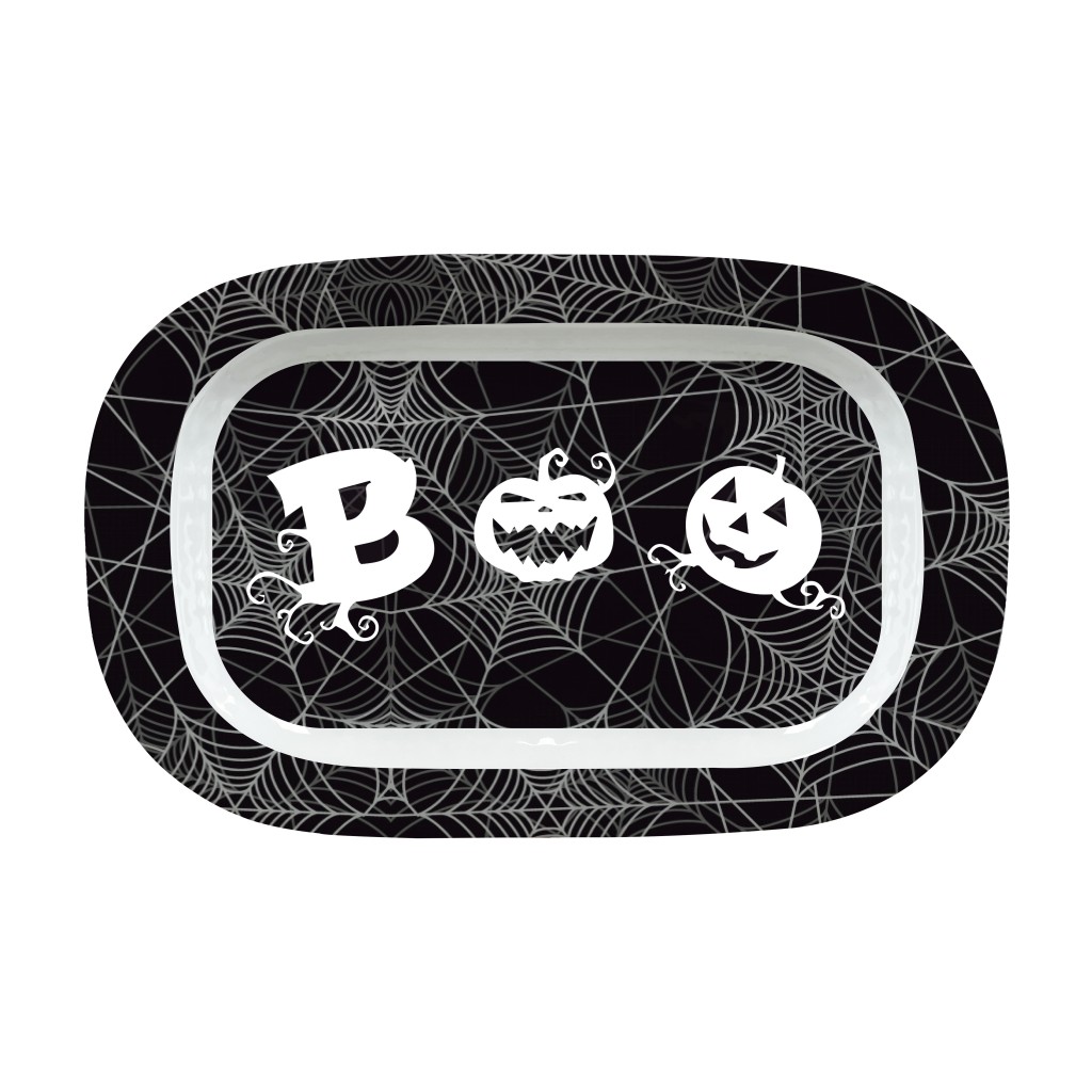 Halloween black & white spider web designLarge melamine serving tray for snacks and treatsPumpkin and spooky pattern add festive vibesDurable melamine, lightweight and shatter-resistantPerfect for Halloween parties and table decor