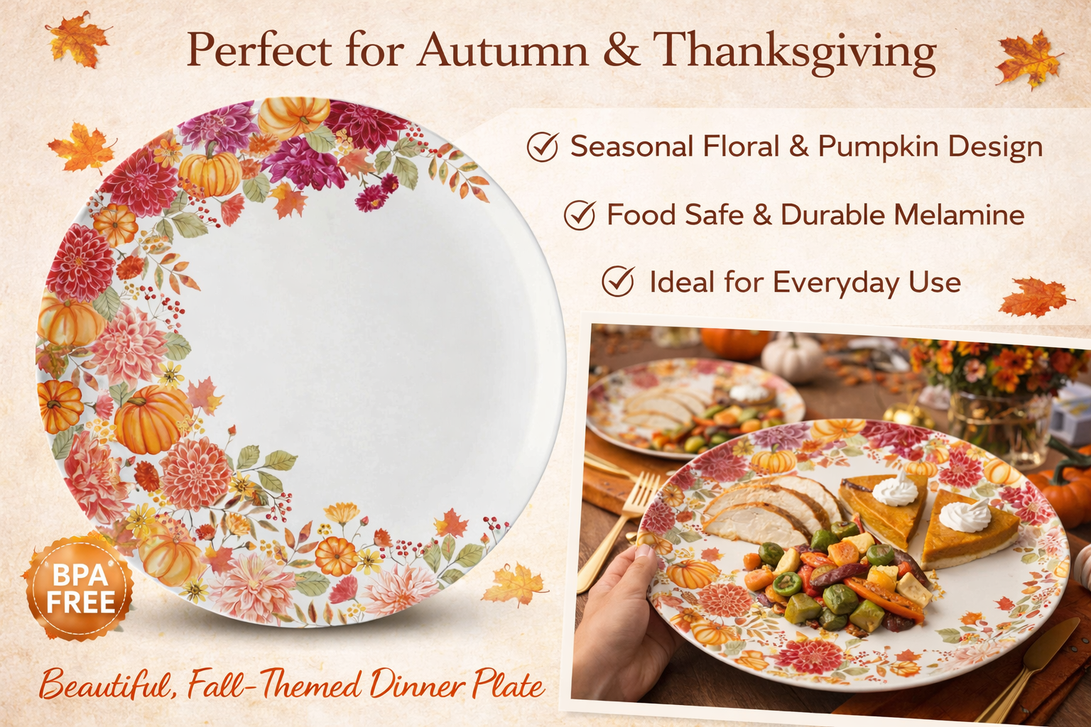 Seasonal Botanical ArtworkRich autumn florals and pumpkin illustrations create a warm, festive table accent.