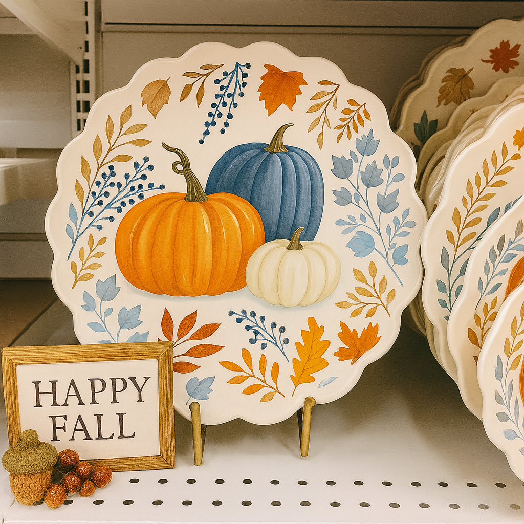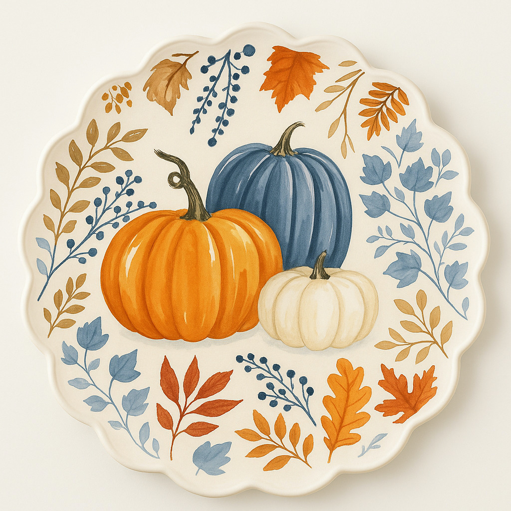 A refined color palette of soft ivory, warm pumpkin tones, and muted blue accents, paired with an elegant scalloped edge, delivers a festive yet modern look suitable for upscale environments.