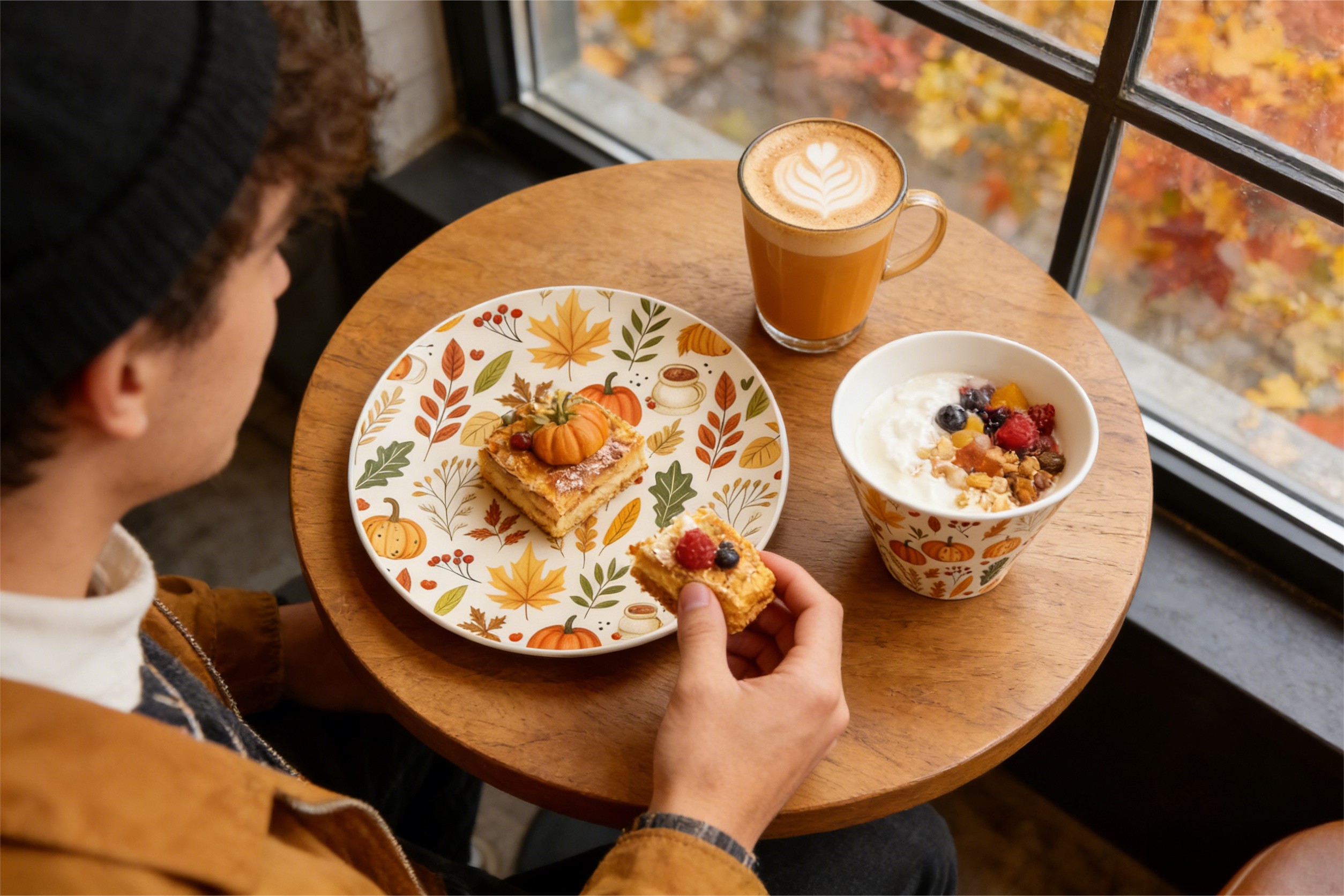 Pattern: Pumpkins, Leaves, Berries, Coffee Cup