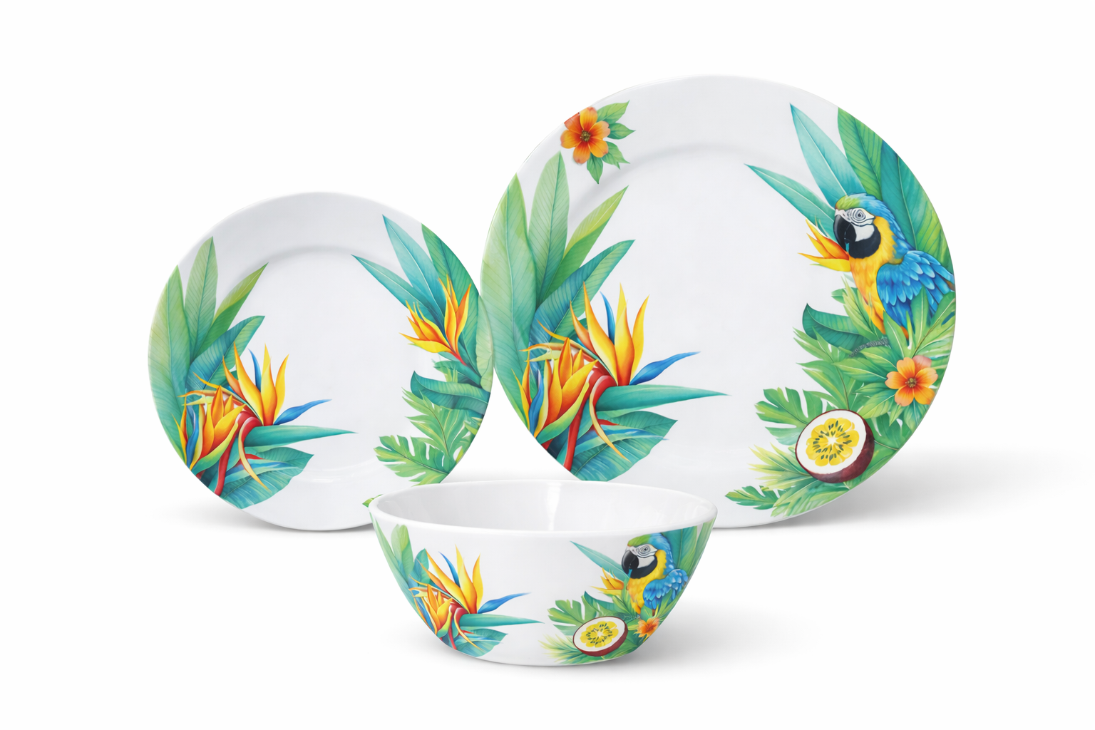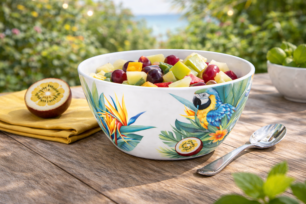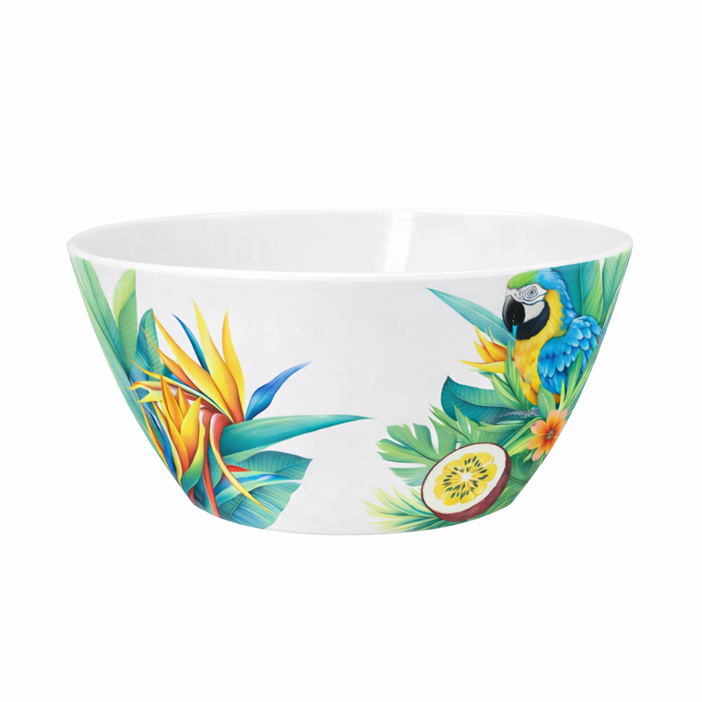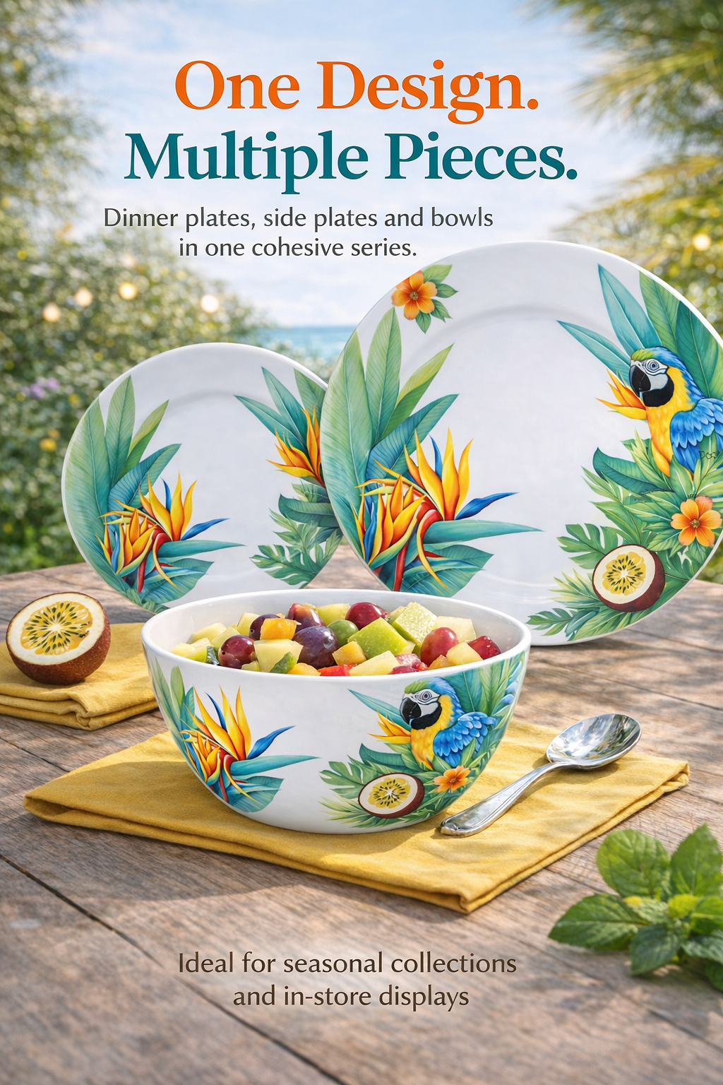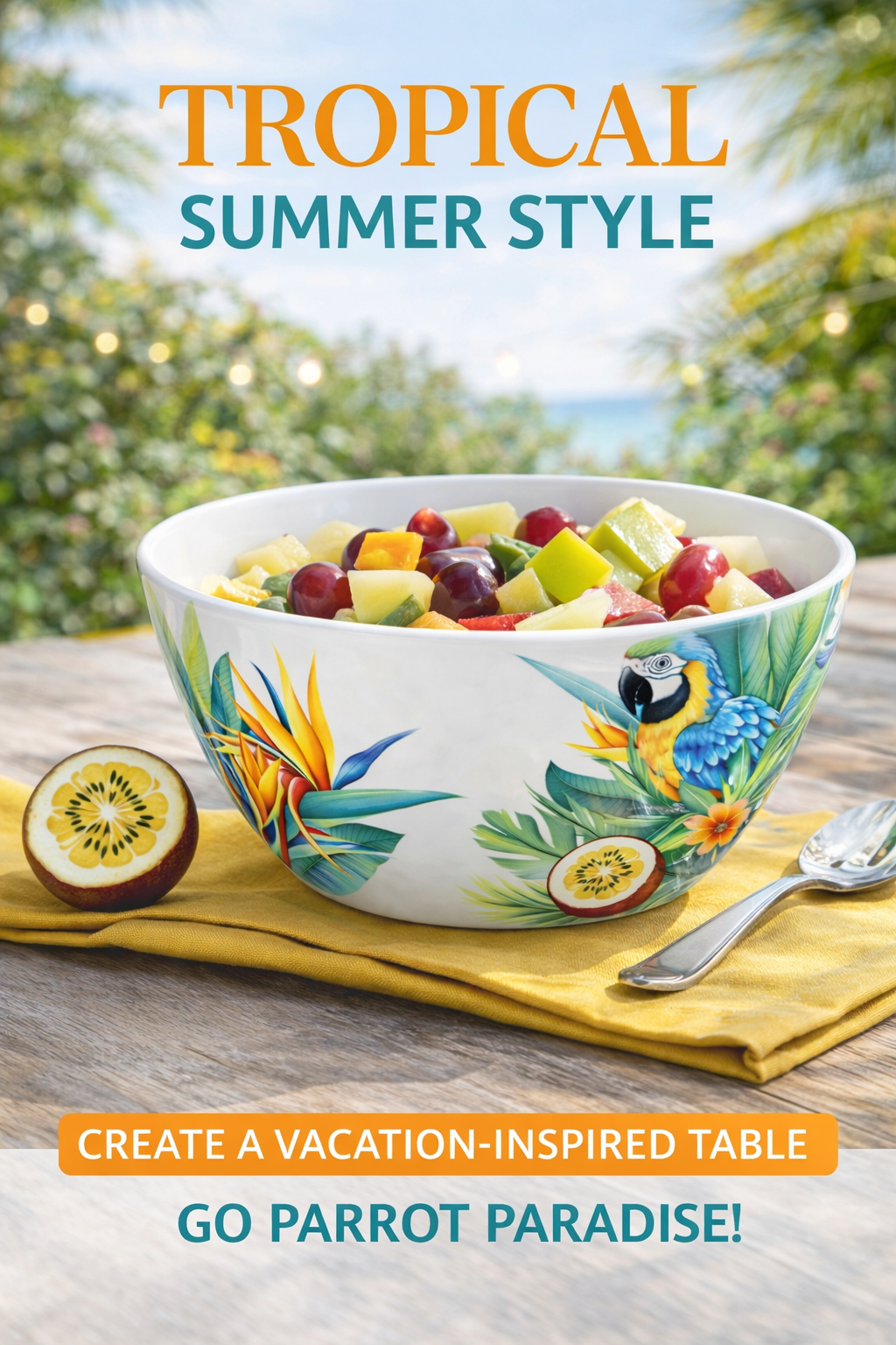 Bright parrot and tropical leaf artwork adds color to food presentation, ideal for resorts, themed restaurants, buffets, and outdoor dining concepts.