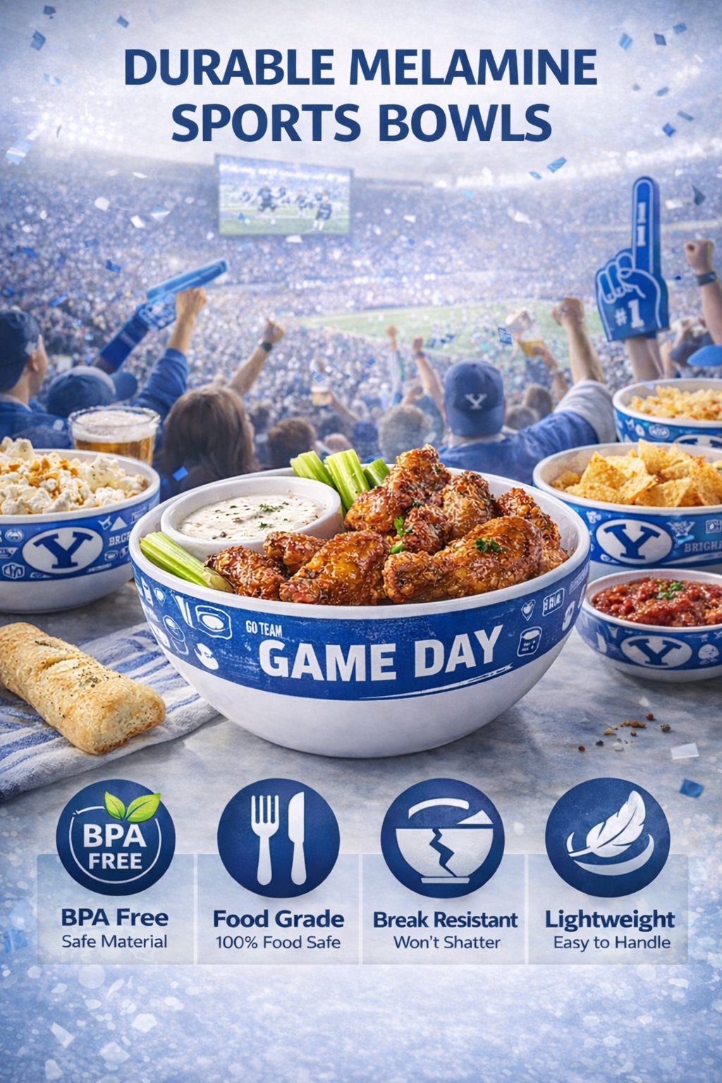 Perfect size for chips, popcorn, salads, wings, and party snacks during football, basketball, and other sports events.