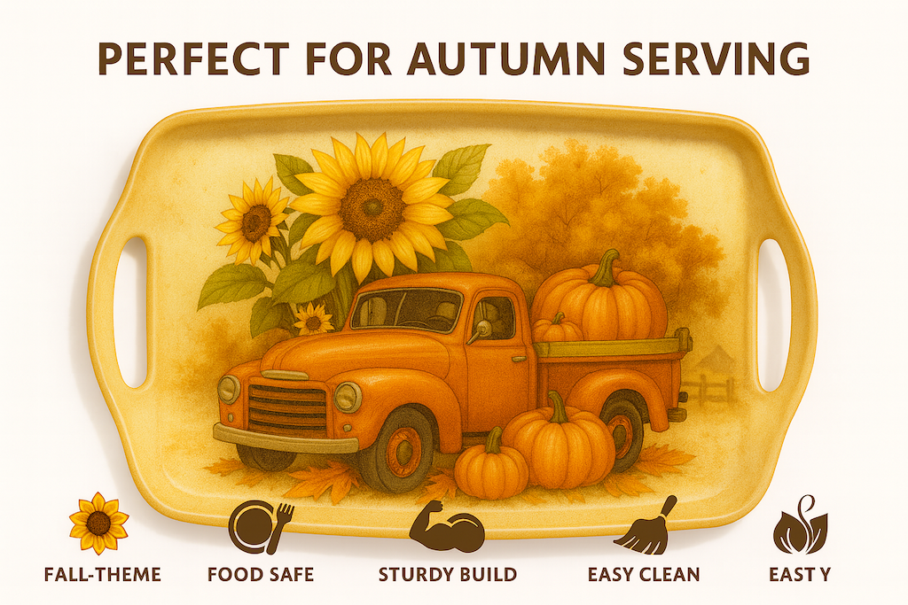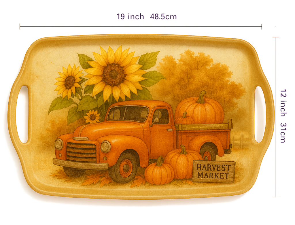 Bring warmth and charm to your seasonal displays with this melamine serving handled tray featuring a vintage orange truck loaded with pumpkins and surrounded by vibrant sunflowers. Made from high-quality melamine, this tray is both durable and lightweight, making it ideal for serving snacks, drinks, or showcasing as part of your autumn or Thanksgiving decor.