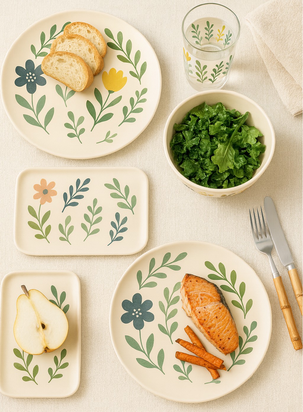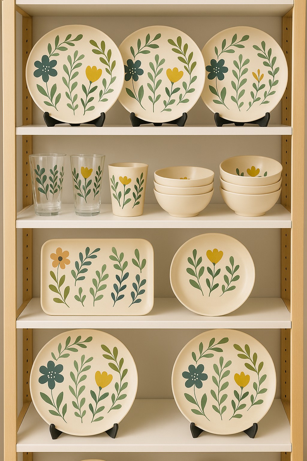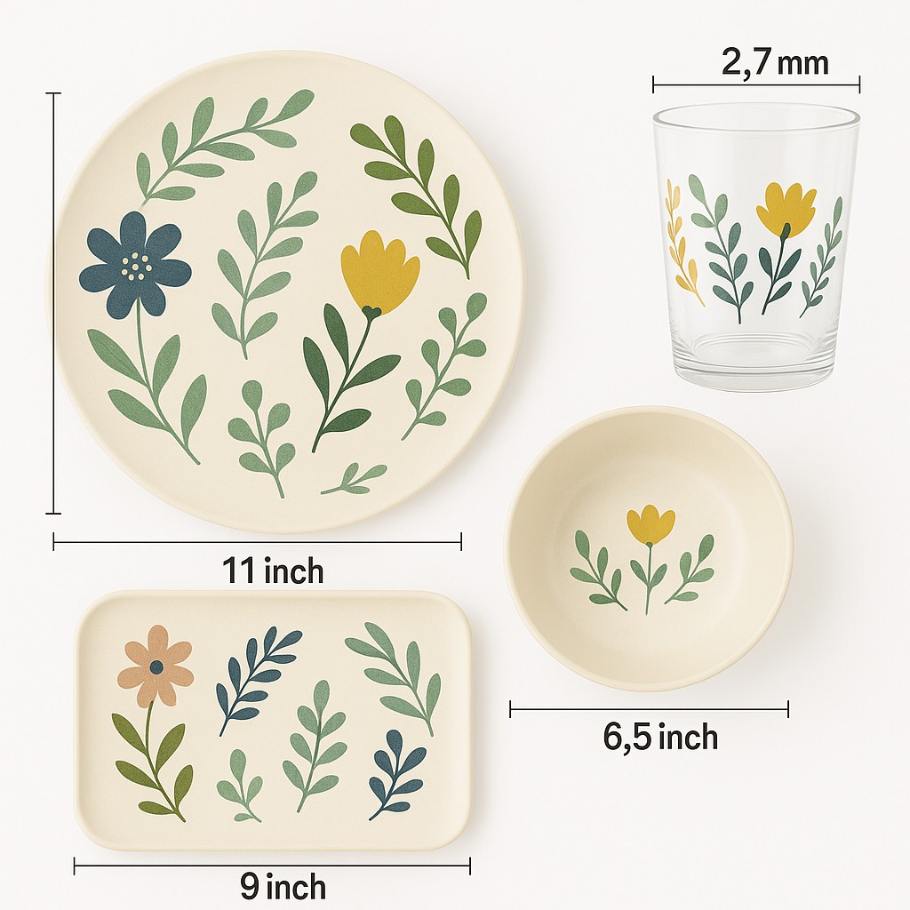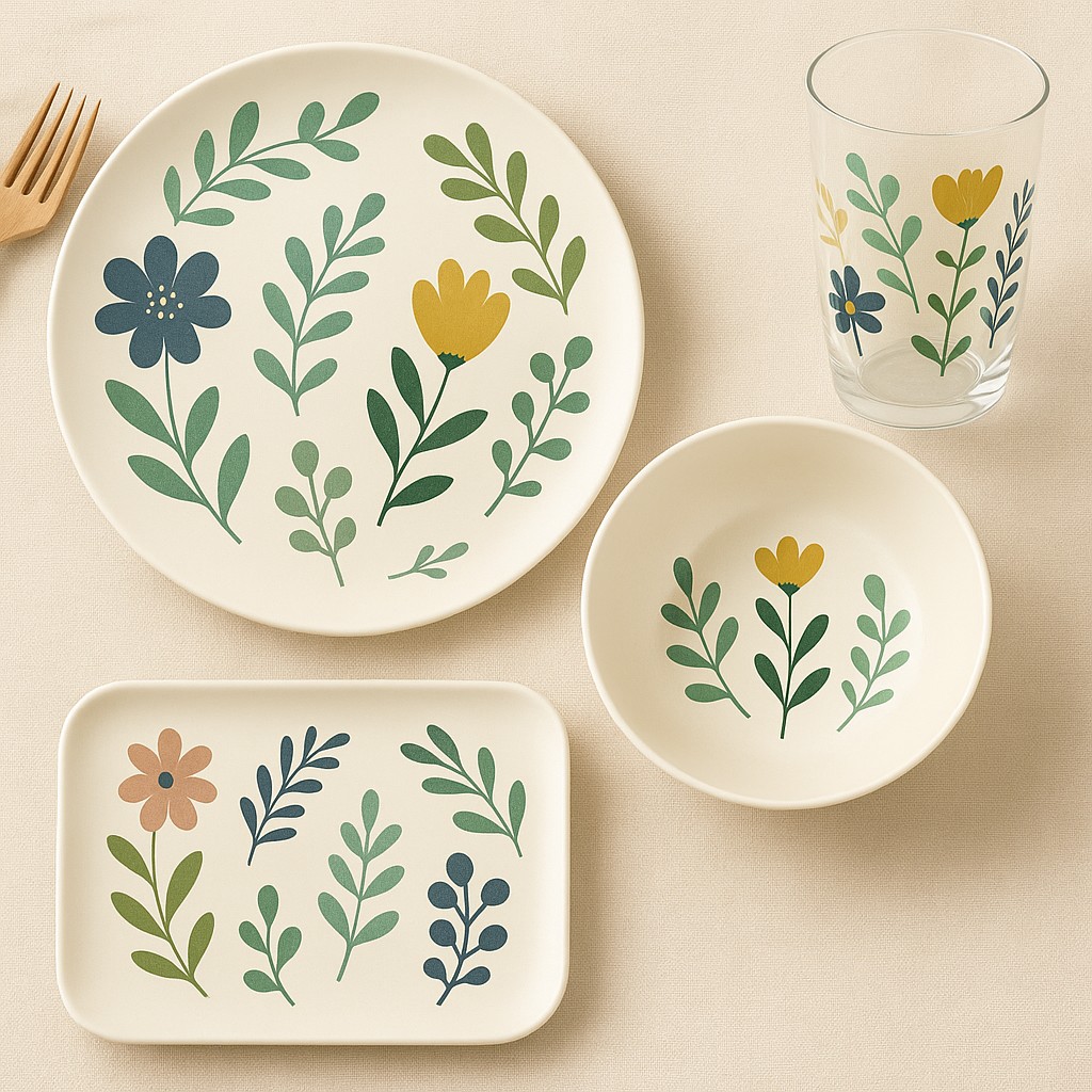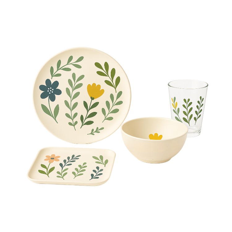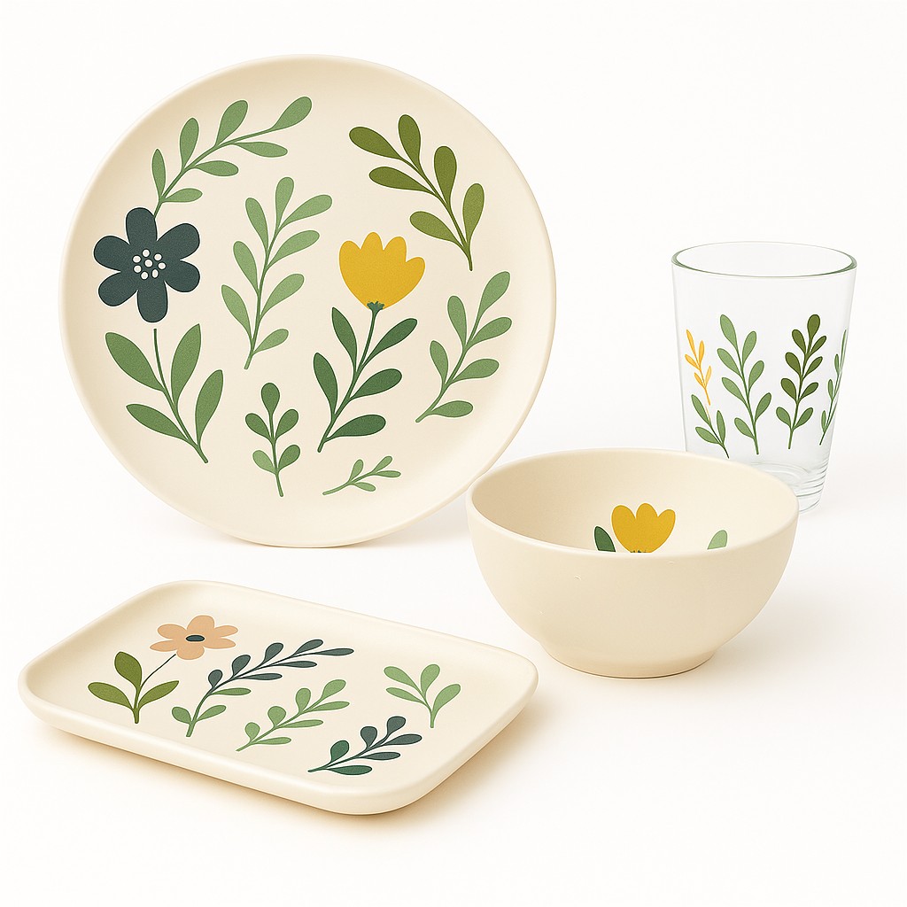 This floral melamine dinnerware set with acrylic cup features a soft botanical design inspired by nature, bringing a fresh and calming look to everyday dining. The coordinated set includes a melamine dinner plate, bowl, rectangular serving tray, and a matching acrylic cup for a complete table setting.