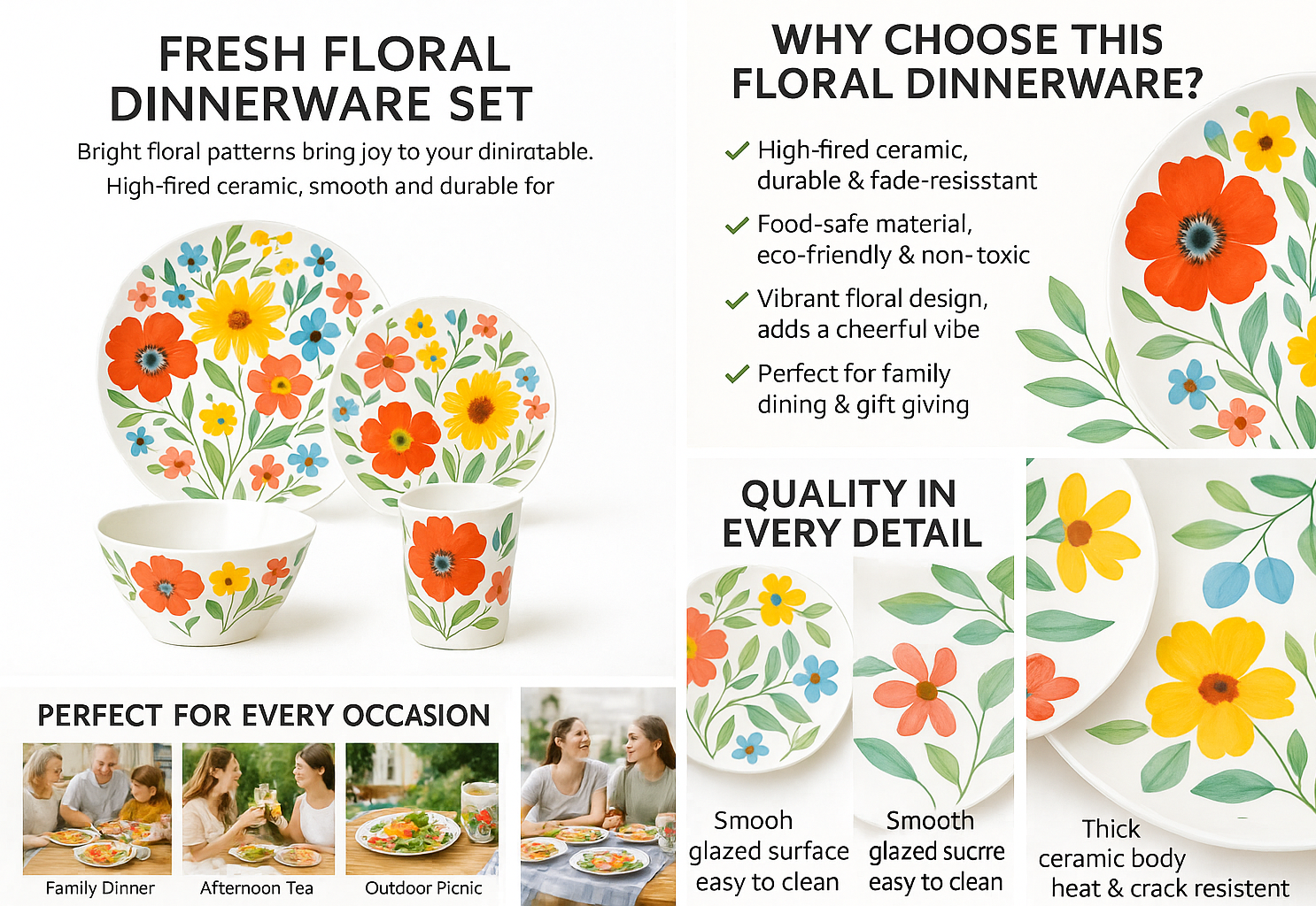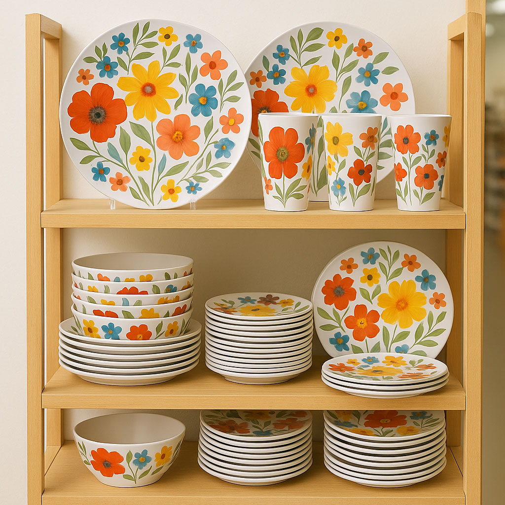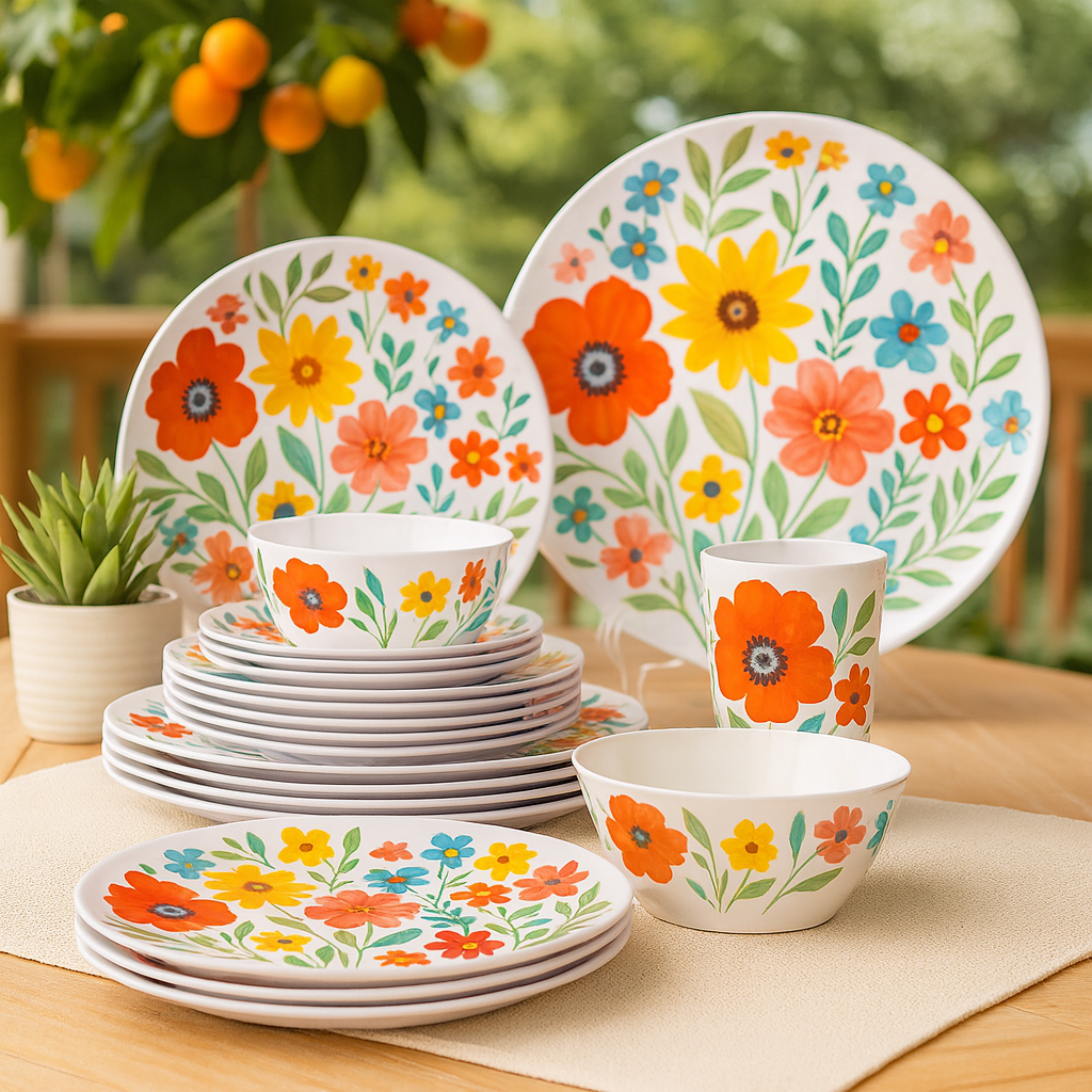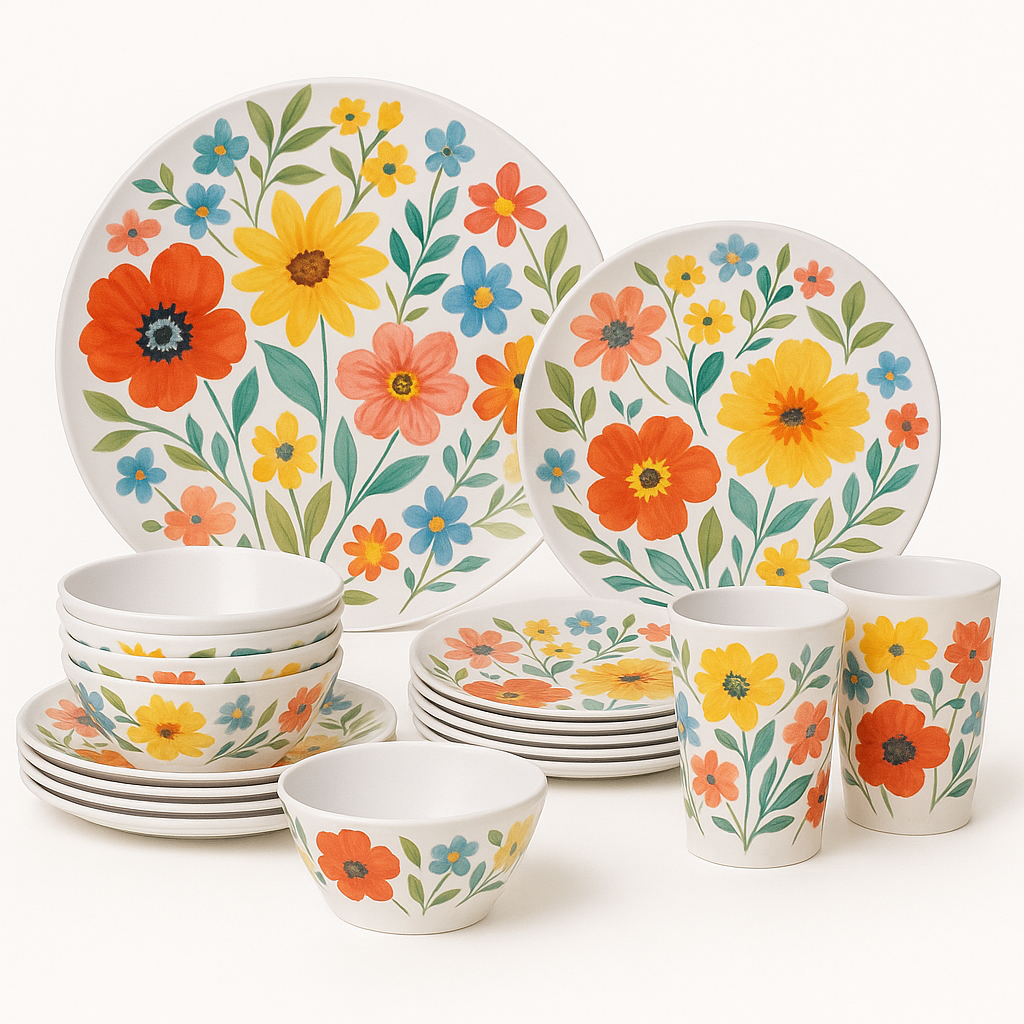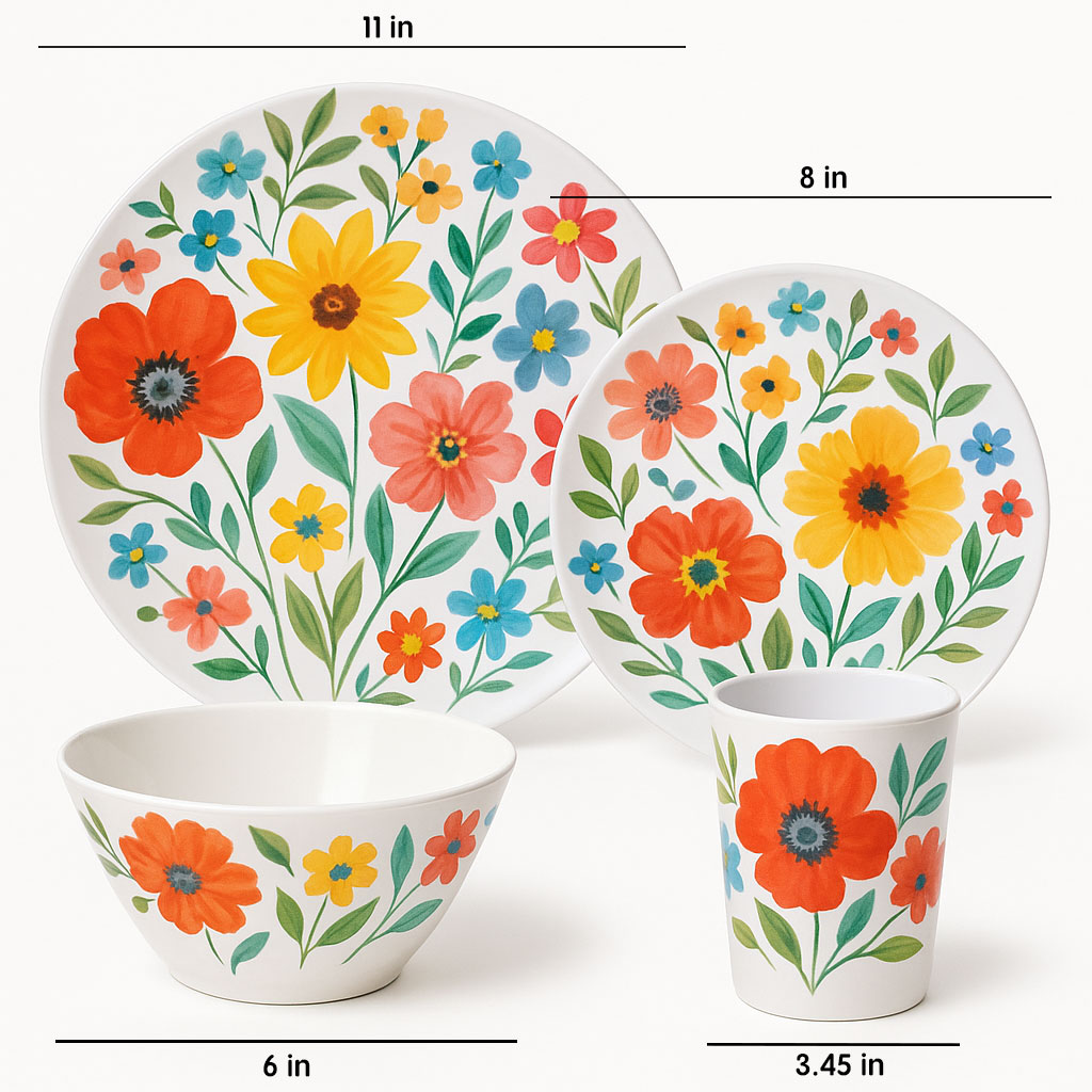 This floral melamine dinnerware set features a bright and cheerful flower pattern that brings a fresh, joyful touch to everyday dining. The coordinated set includes dinner plates, salad plates, a bowl, and a cup, making it perfect for complete table settings.