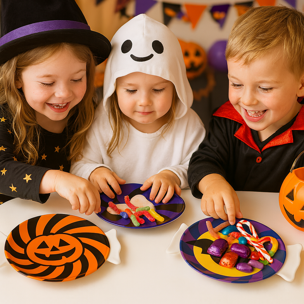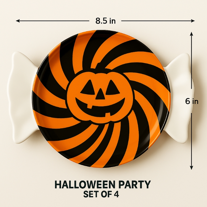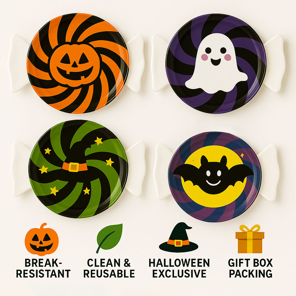 Bring extra fun to your Halloween party with this adorable 4-Pack Halloween Candy Plate Set!