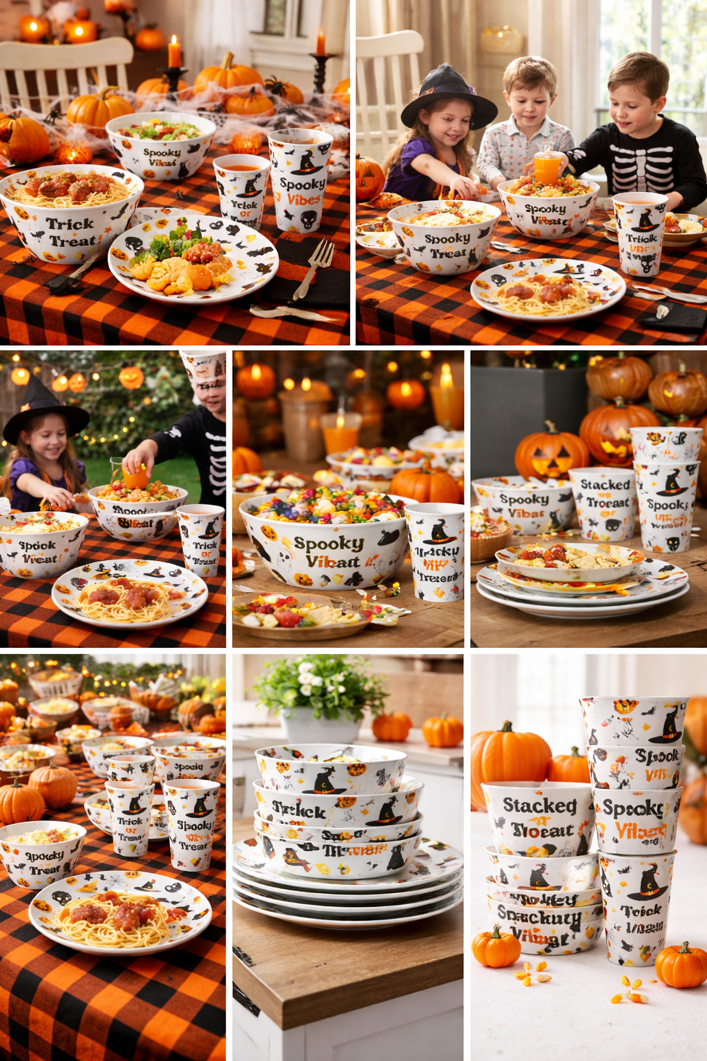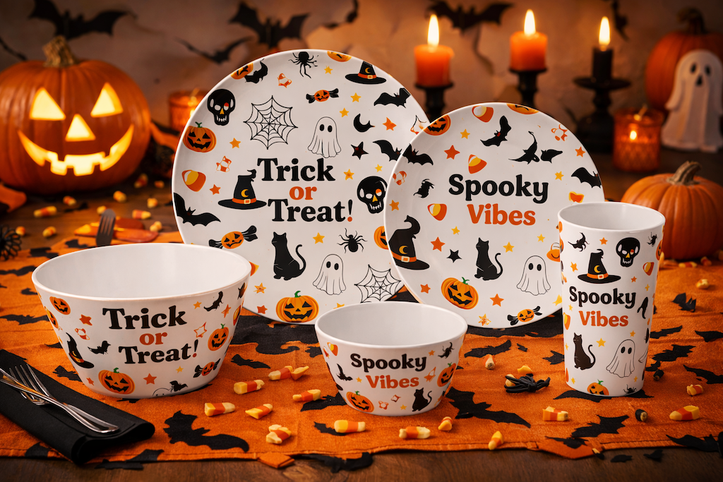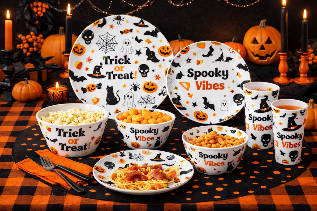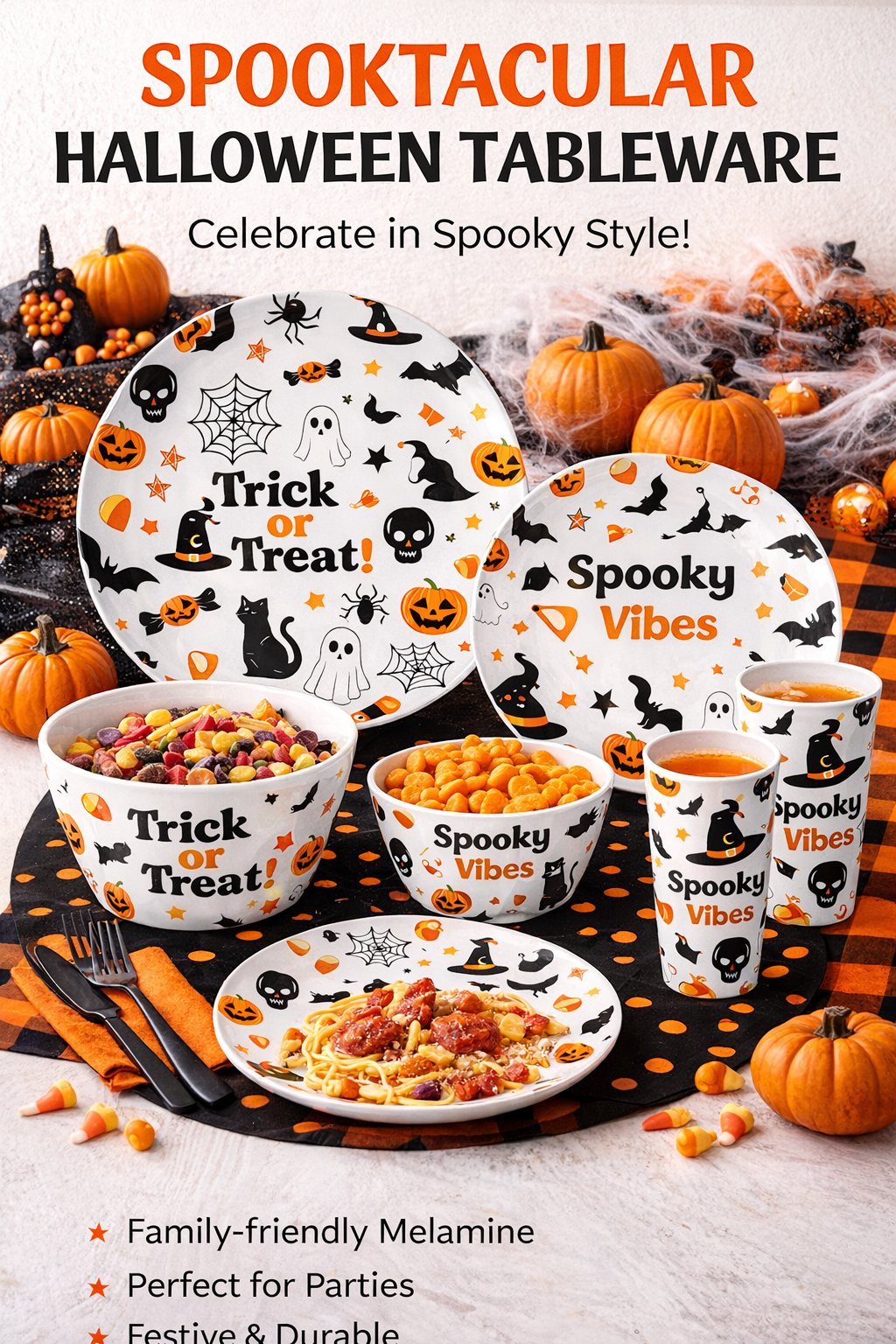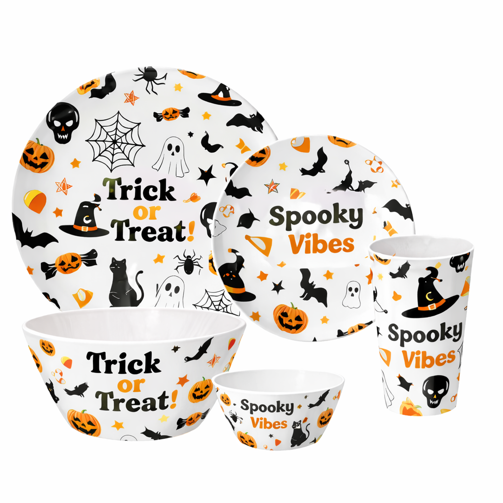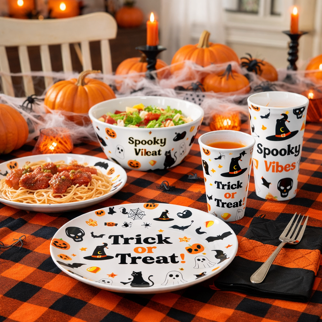 Includes matching plates, bowls, and cups, perfect for Halloween parties, events, and seasonal promotions.