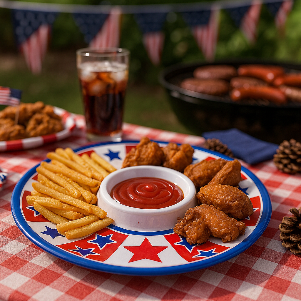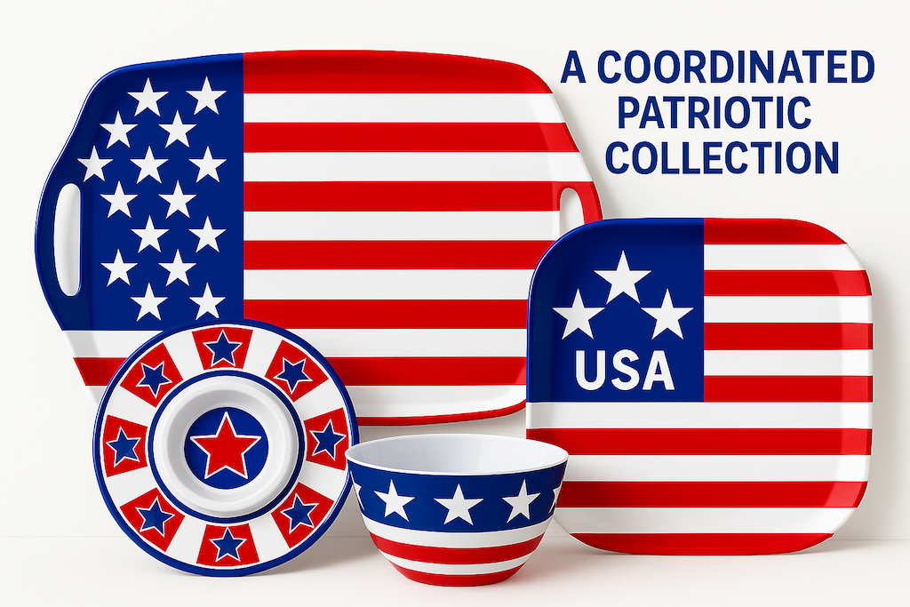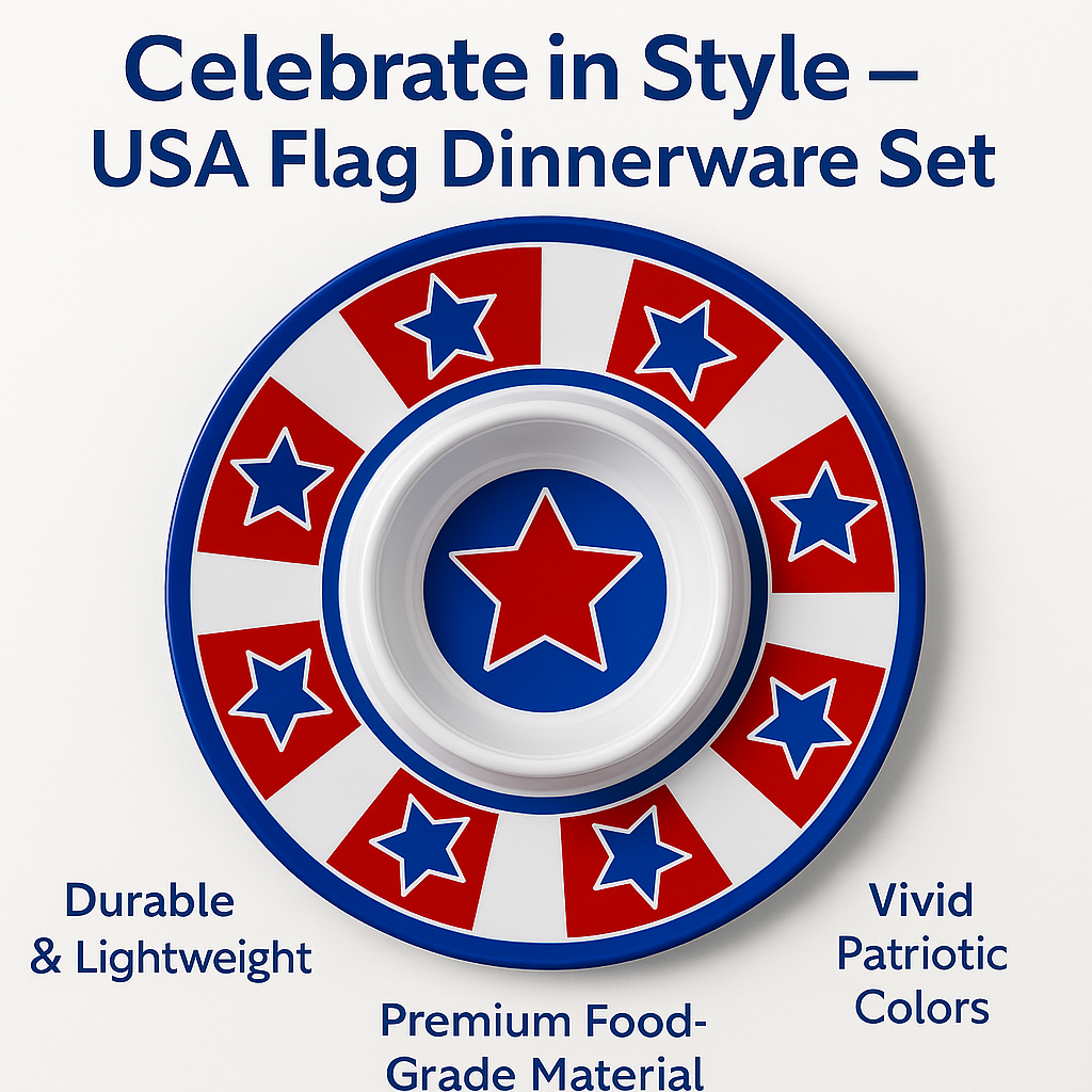 Perfect for Independence Day celebrations, summer BBQs, and patriotic events, this 14.5-inch melamine chip & dip platter features a bold red, white, and blue starburst design. Made from durable, food-safe melamine, it's lightweight yet sturdy—ideal for outdoor parties and commercial reuse. The central dip bowl is surrounded by ample space for chips, veggies, or snacks. Great for restaurants, event planners, and seasonal retailers looking for eye-catching serveware with American spirit.