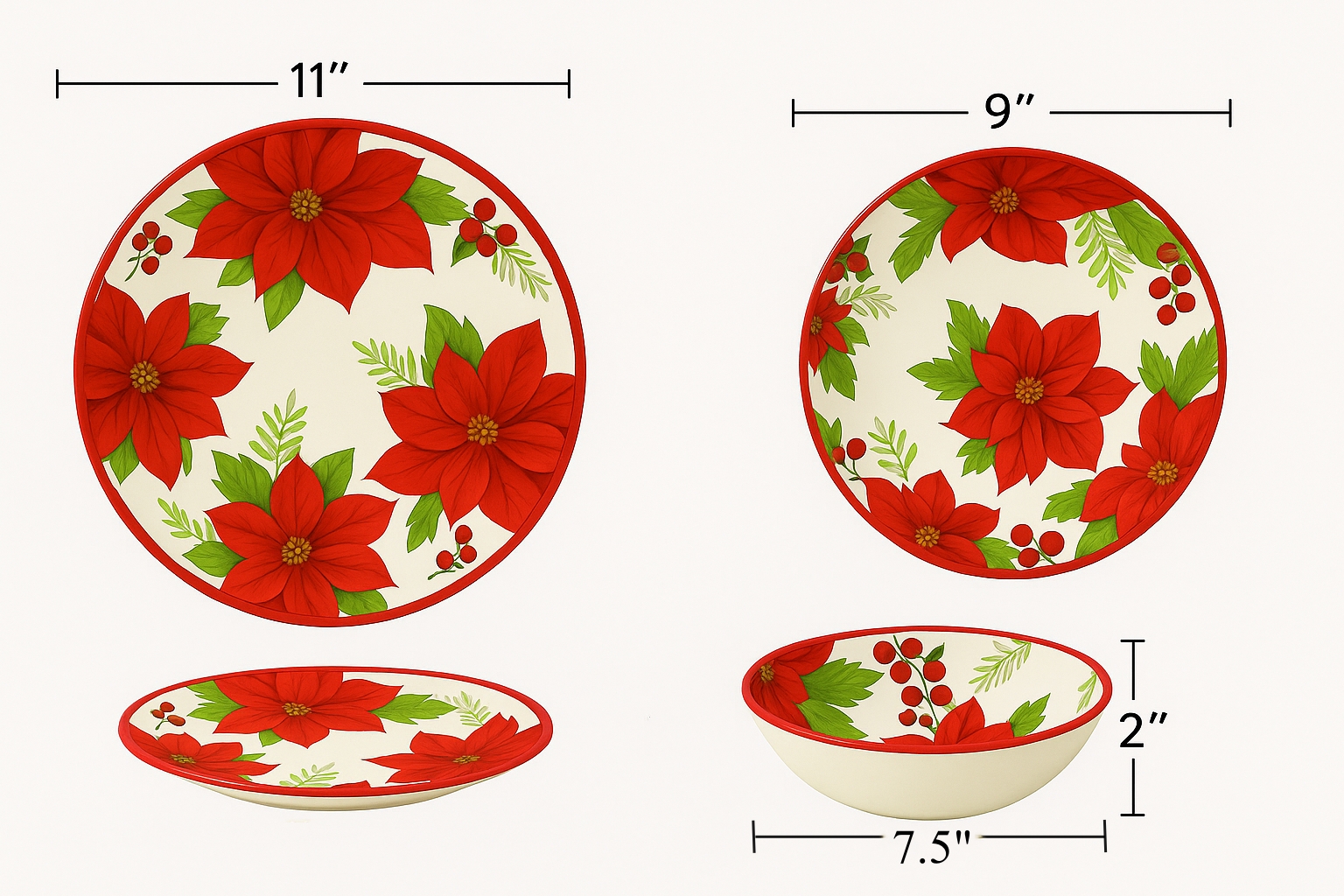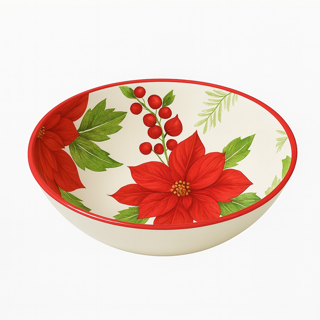 This poinsettia melamine dinnerware set features a classic red floral design inspired by holiday traditions, bringing a festive and elegant touch to your table. The coordinated set includes matching melamine plates and a serving bowl, perfect for seasonal meals and celebrations.