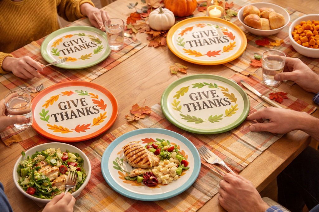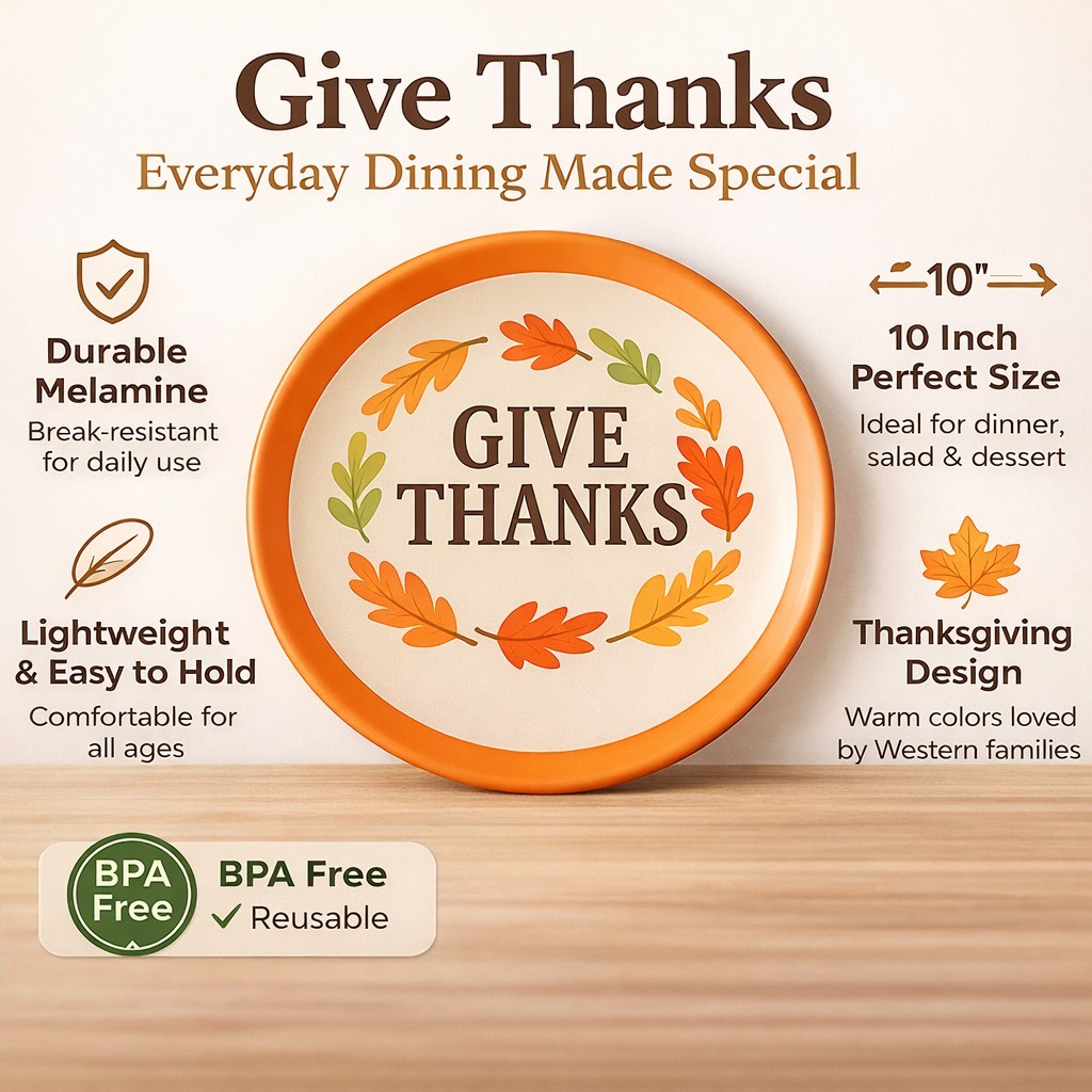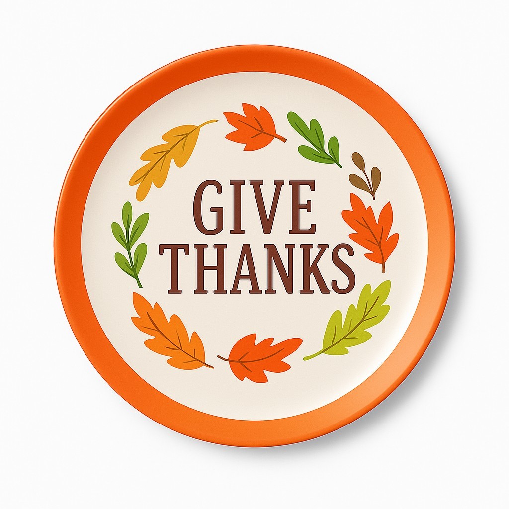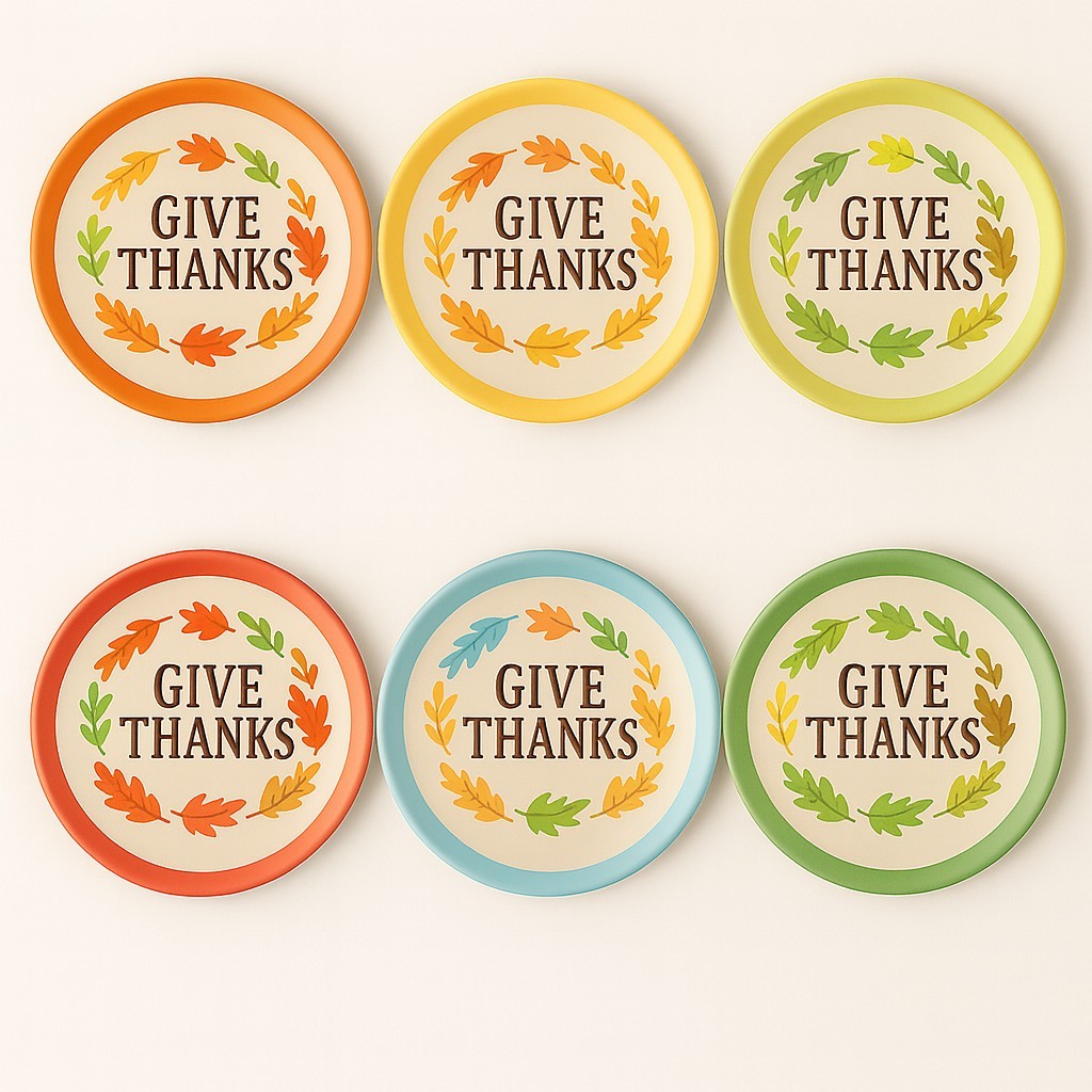 Thanksgiving Theme Design: Features a “Give Thanks” message with fall leaf accents, perfect for Thanksgiving tables
