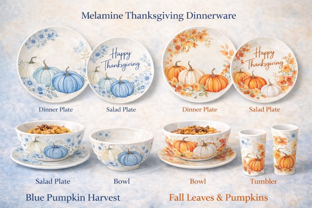Coordinated design across plates, bowls, and cups for a consistent Thanksgiving dining presentation.