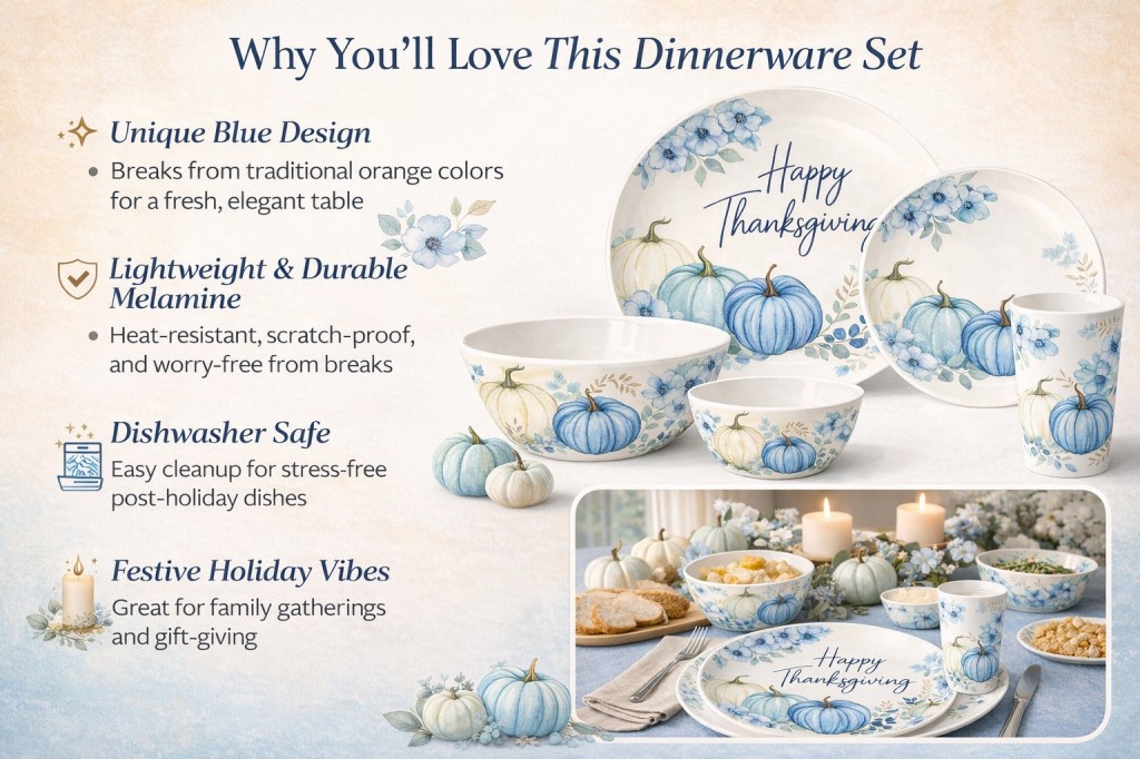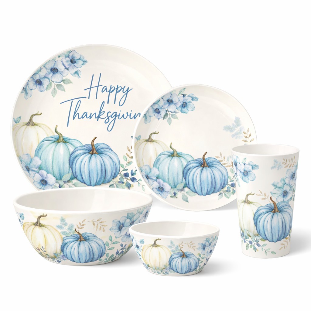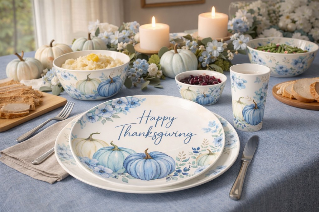 Features elegant pumpkin and floral patterns in soft blue and white tones, creating a warm and festive Thanksgiving table setting.