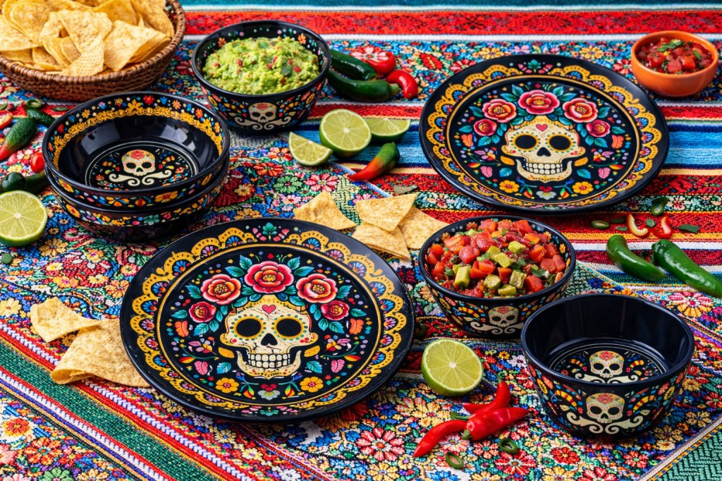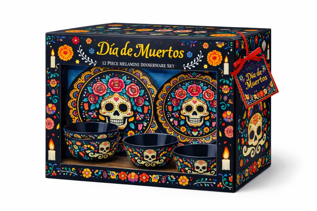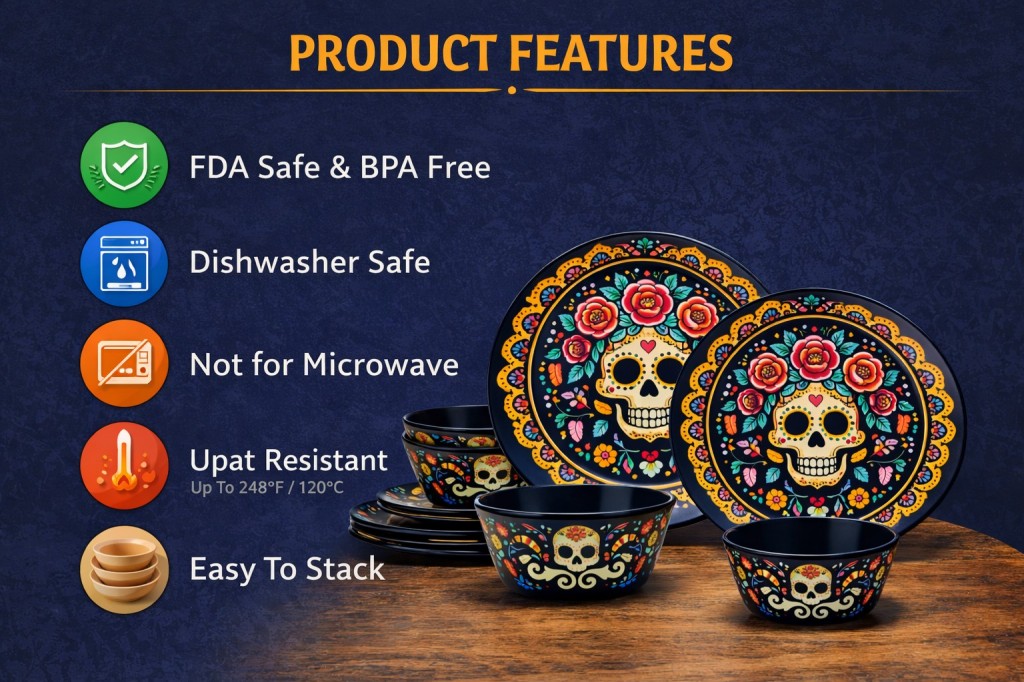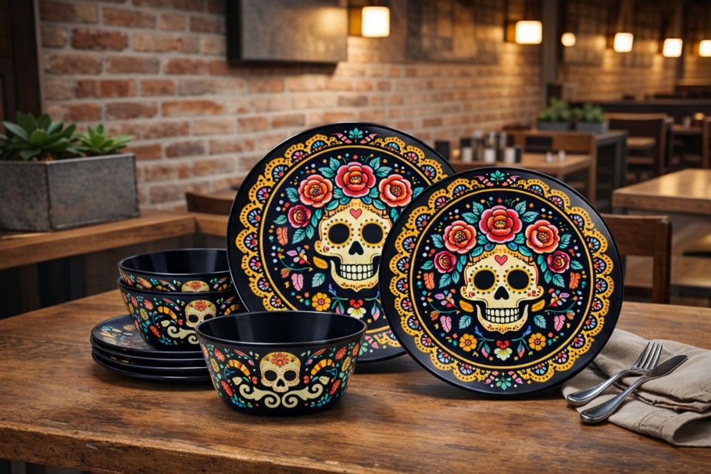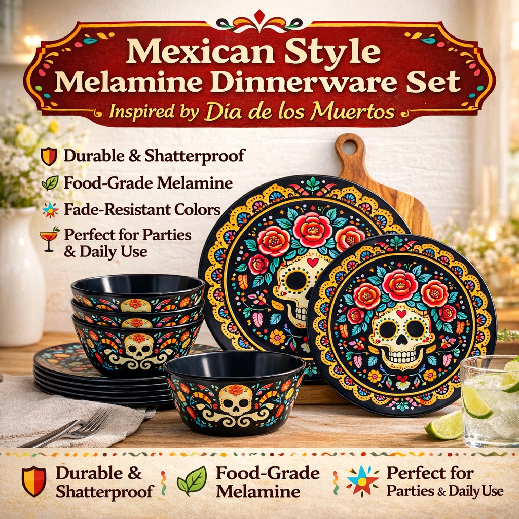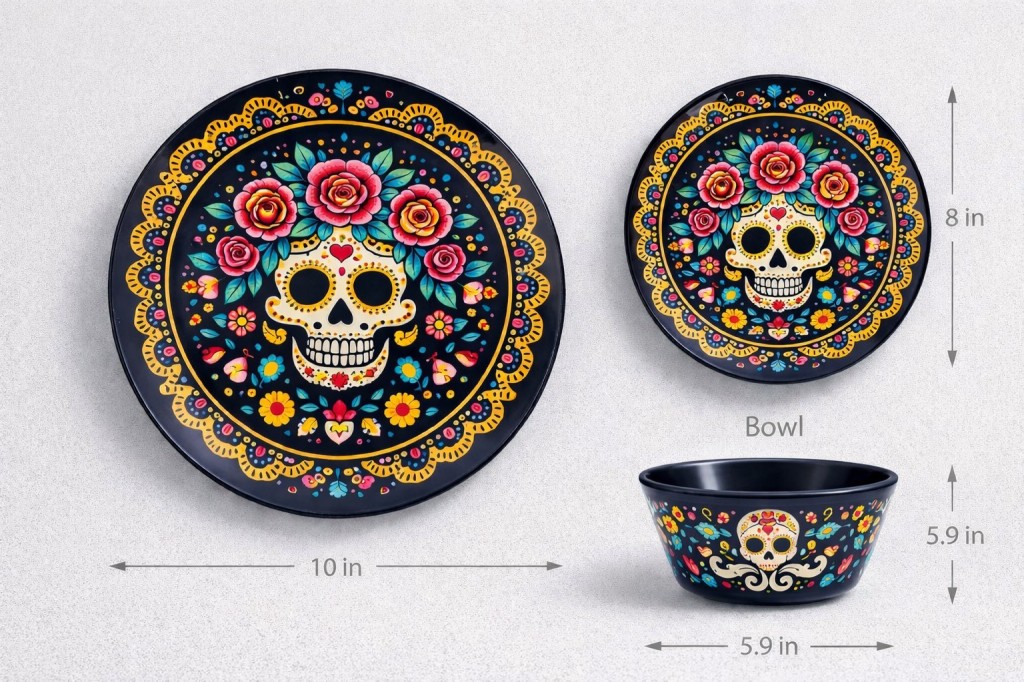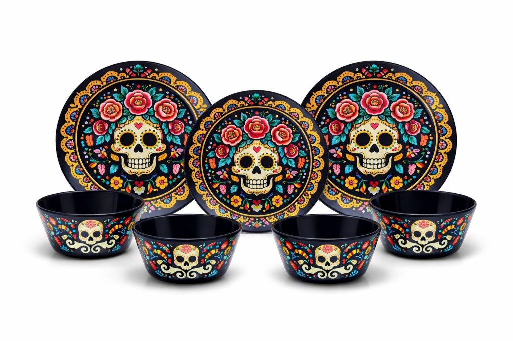 Dia de los Muertos Sugar Skull Floral Melamine Dinnerware Set