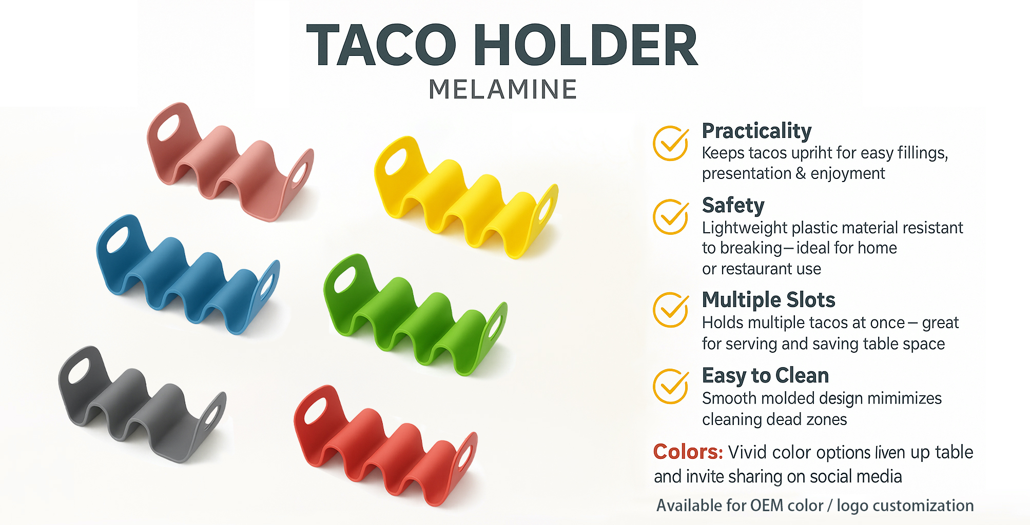 Engineered for modern food-service operations, our commercial-grade melamine taco holders deliver exceptional stability, durability, and visual appeal. The seamless, shatter-resistant construction keeps tacos upright for clean, efficient filling and presentation—ideal for high-volume kitchens, catering programs, and fast-casual service.