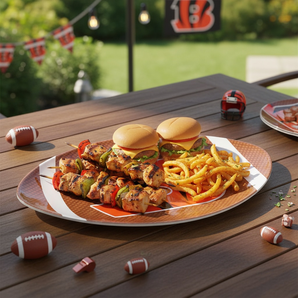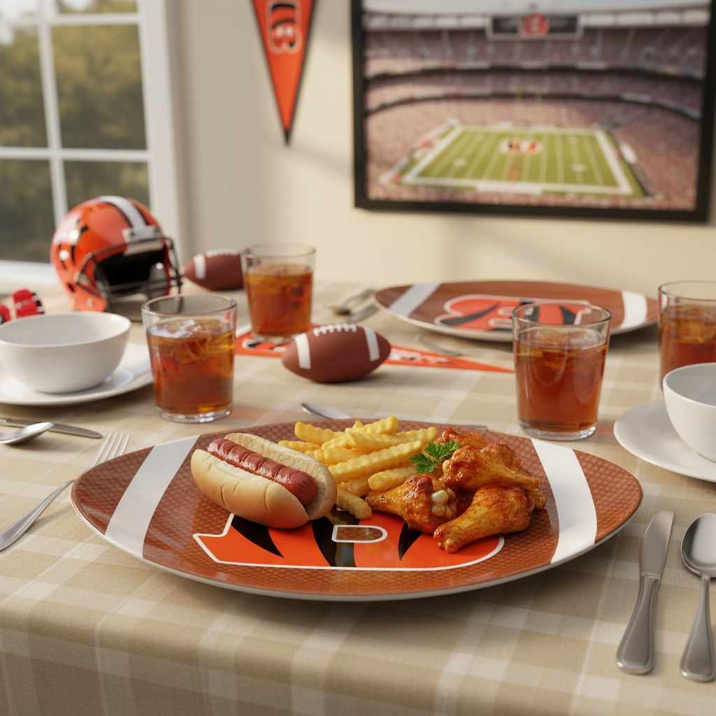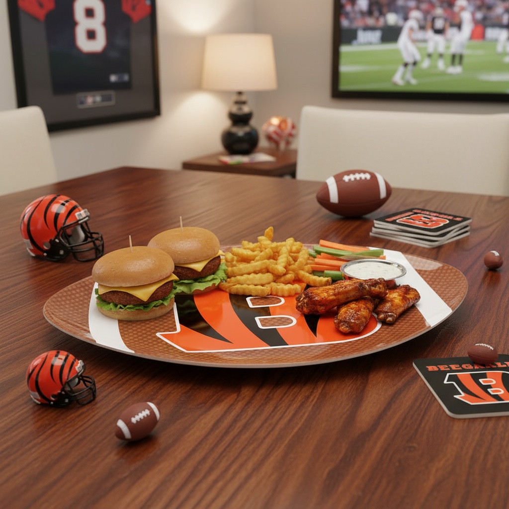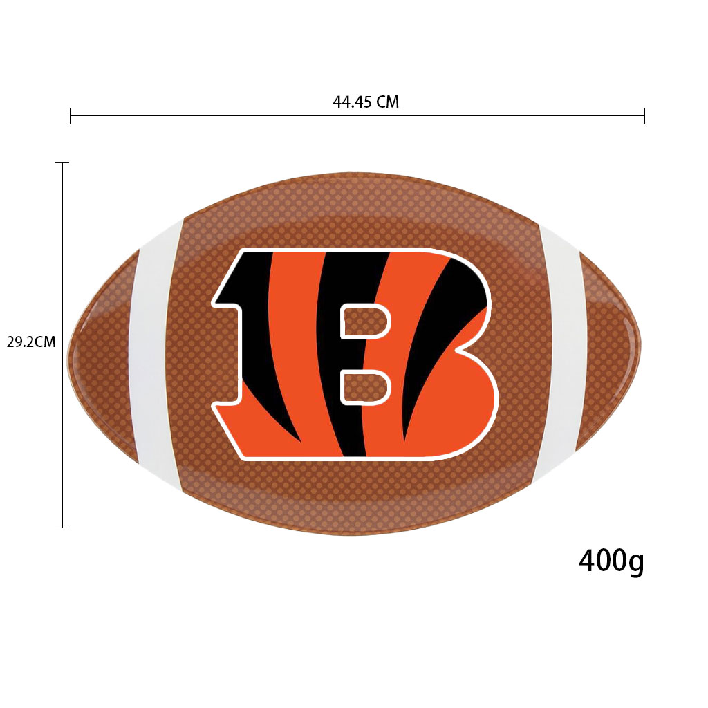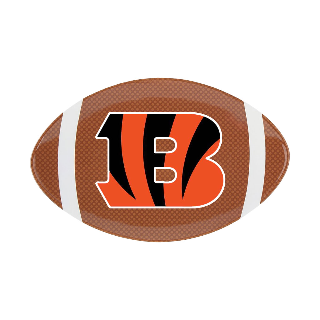 Officially licensed NFL melamine plate in the shape of a football, featuring the iconic Cincinnati Bengals "B" logo. Made of durable, lightweight, and shatter-resistant melamine, this plate is perfect for game day parties, tailgating, or everyday use for any passionate football fan.