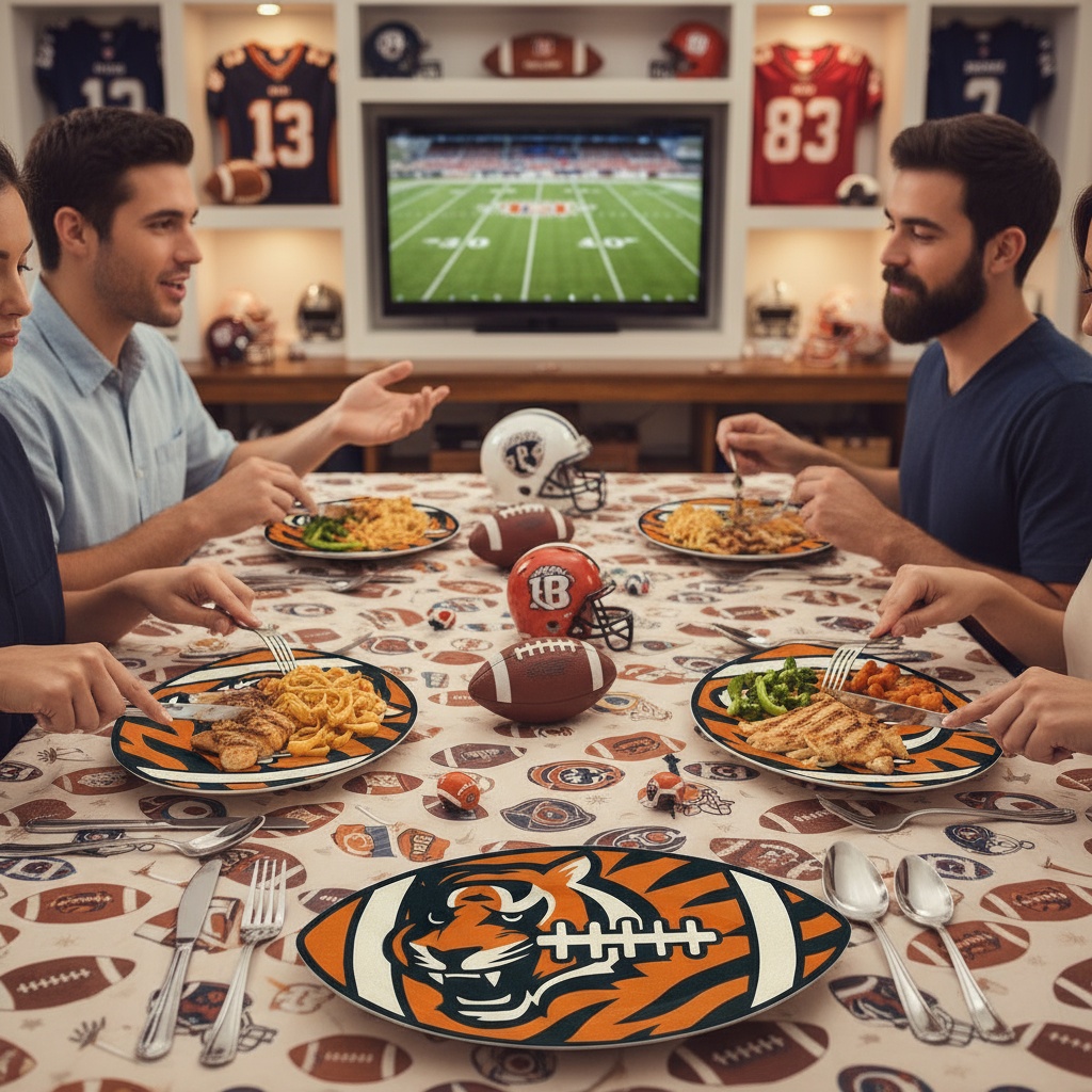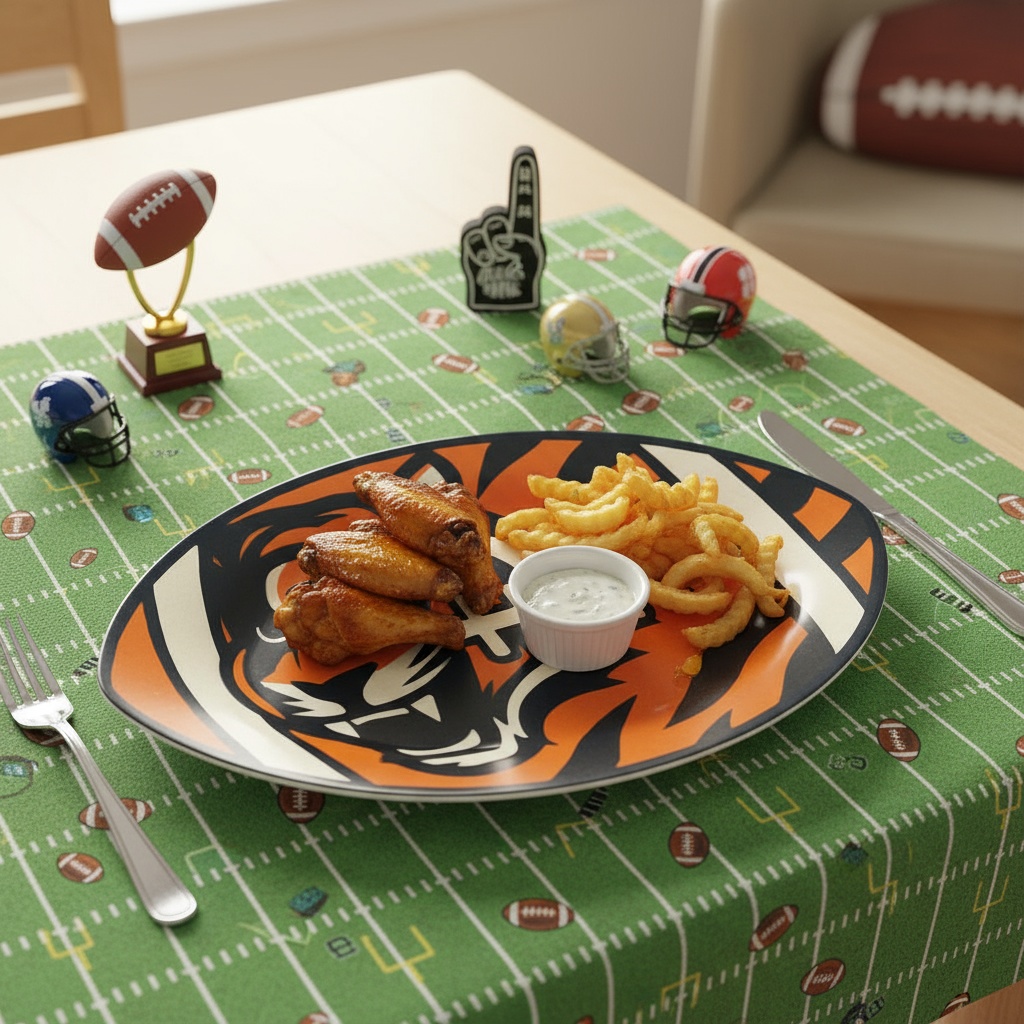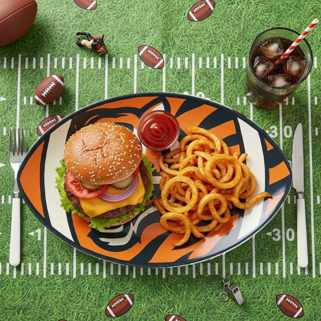 Command attention at your next game day gathering with this bold and officially licensed NFL Cincinnati Bengals serving platter! Featuring a fierce tiger head graphic across a football-shaped 17" surface, this tray is made from BPA-free melamine and is built for fan-worthy feasts—wings, sliders, snacks and more.