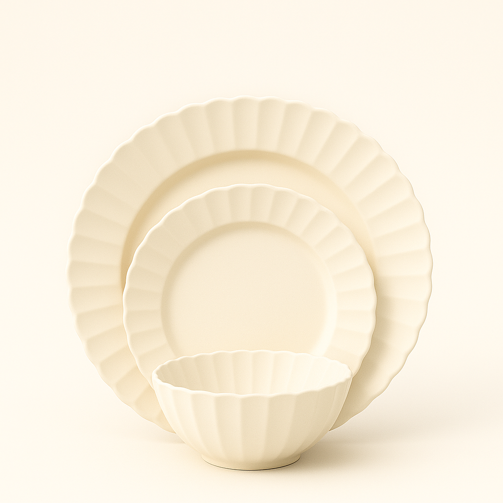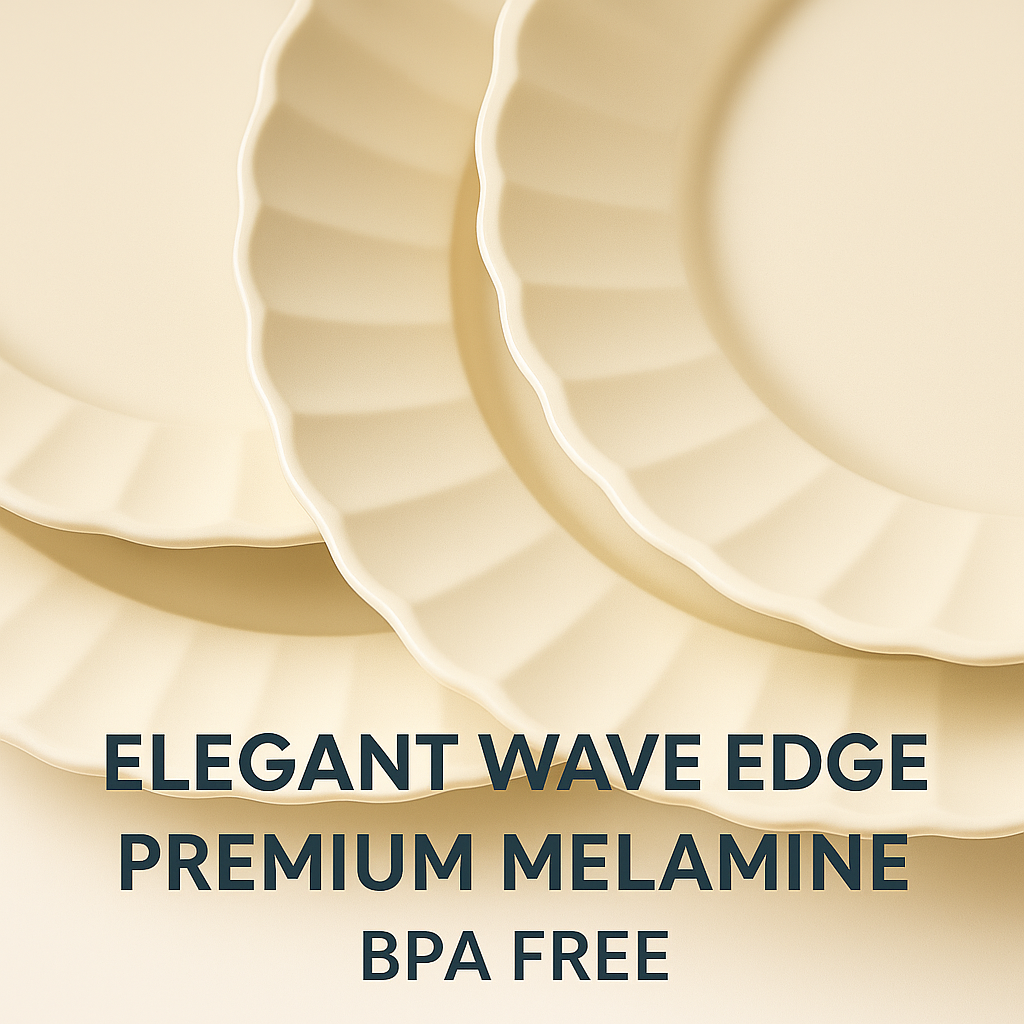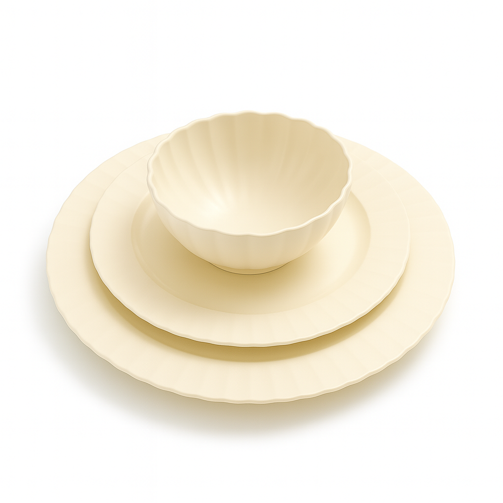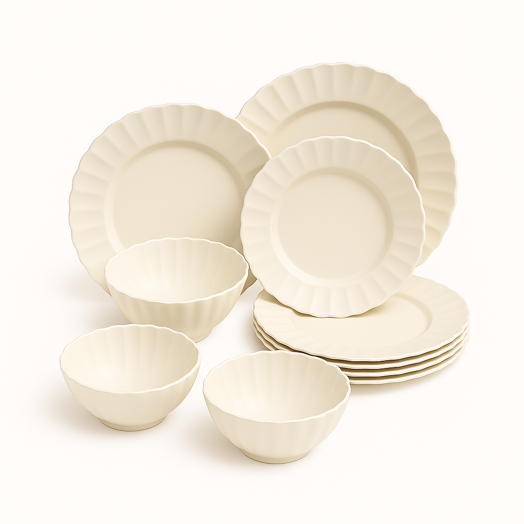 This 12 Pieces melamine dinnerware set features a minimalist ribbed edge design in an elegant cream white tone. Lightweight, durable, and shatter-resistant, it’s ideal for daily meals, outdoor dining, or commercial use. Perfect for family tables, restaurants, or cafes.