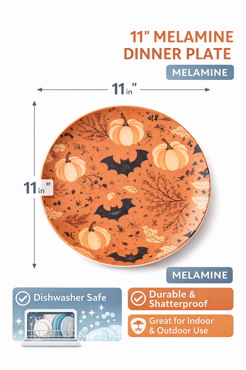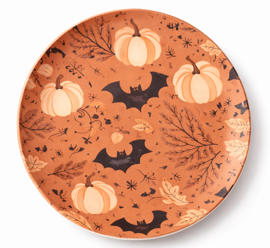 Fall & Halloween melamine dinner plate featuring pumpkin and bat seasonal design