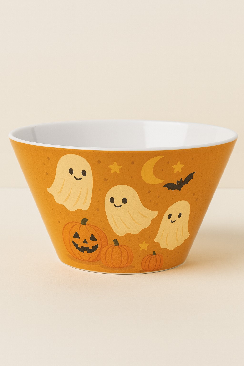 Design: Cute Halloween-themed ghosts, pumpkins, stars, bat, and moon