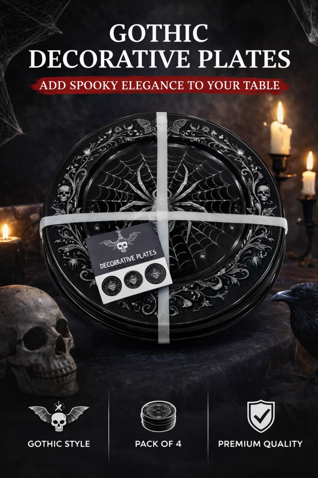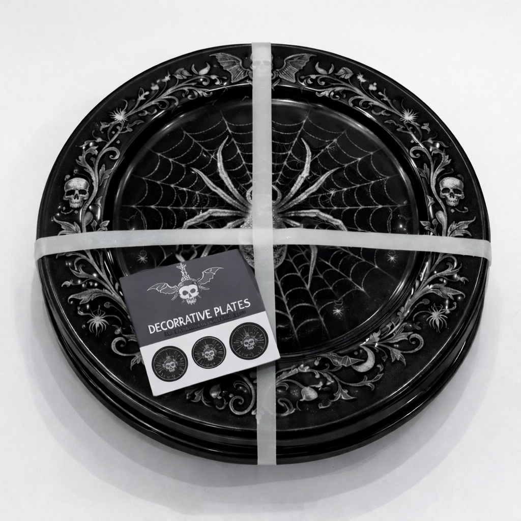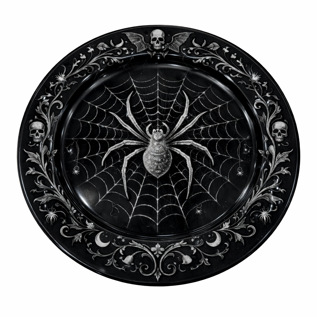Detailed spider web and skull elements create a bold gothic look, perfect for Halloween table settings and seasonal displays.