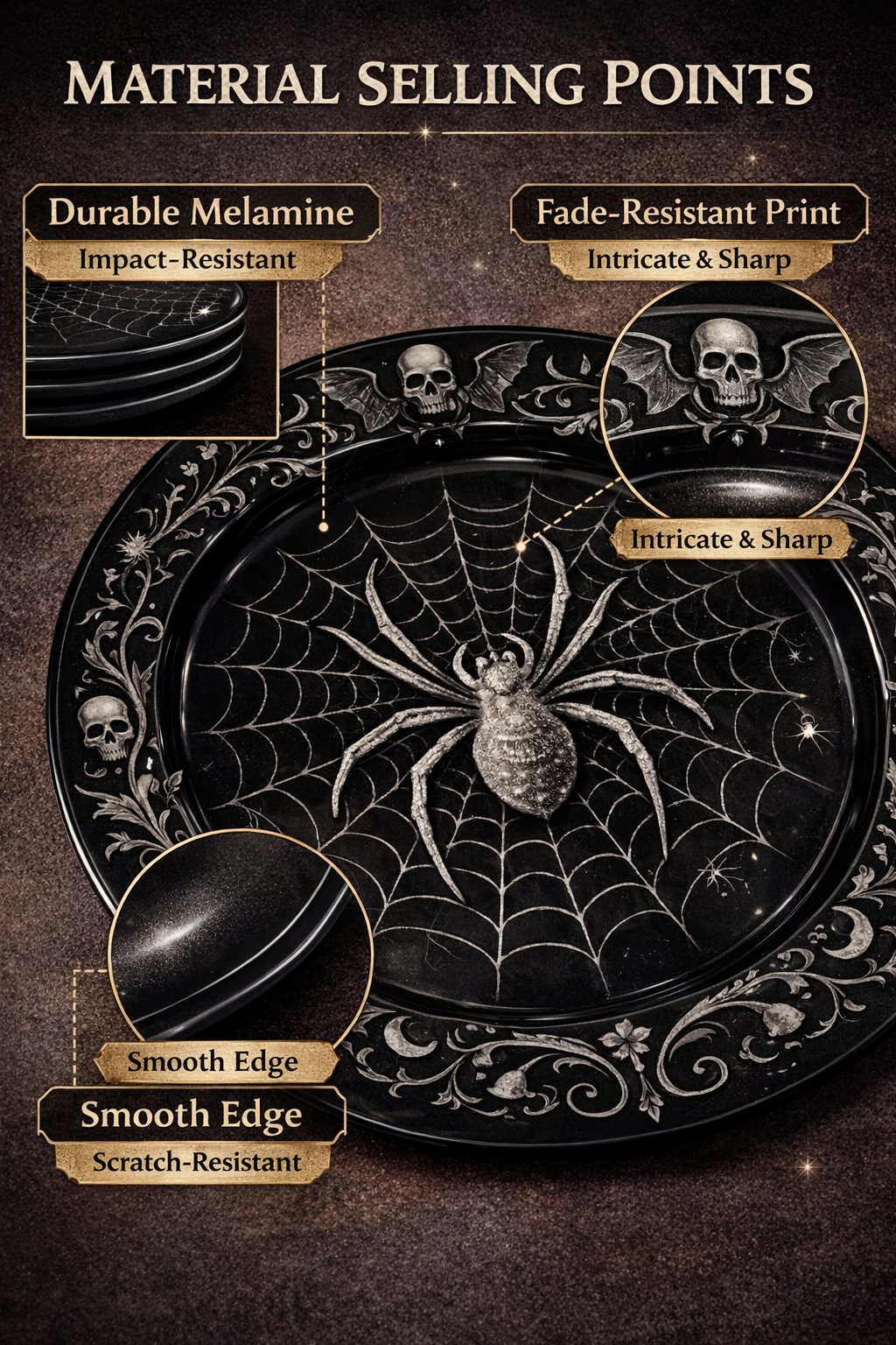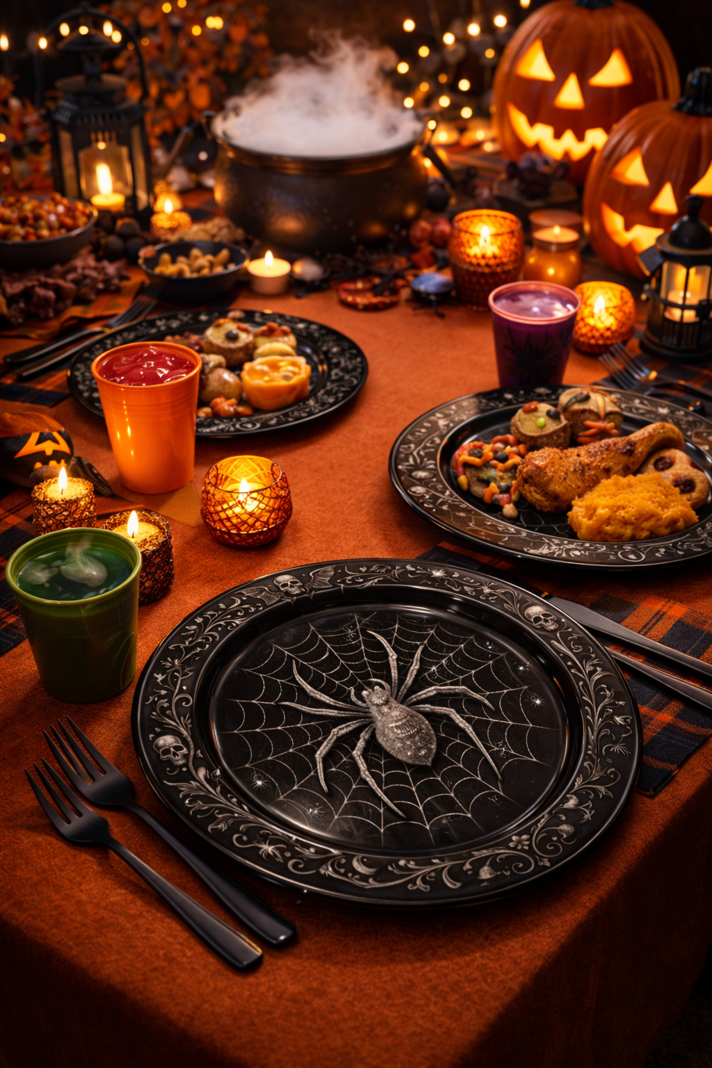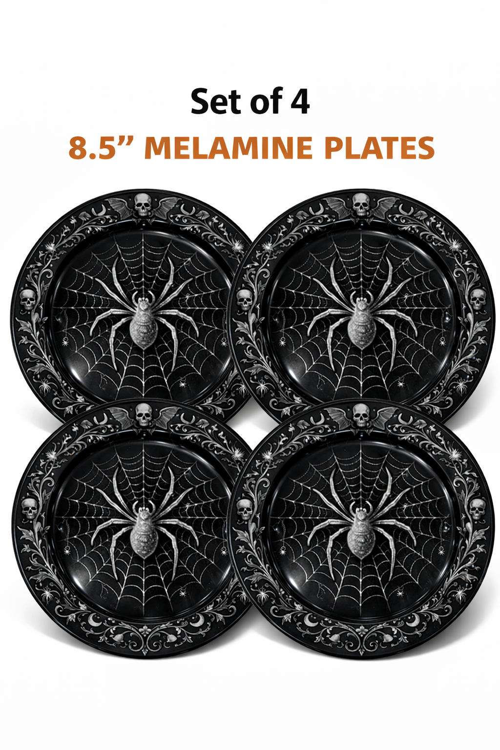 Detailed spider web and skull elements create a bold gothic look, perfect for Halloween table settings and seasonal displays.