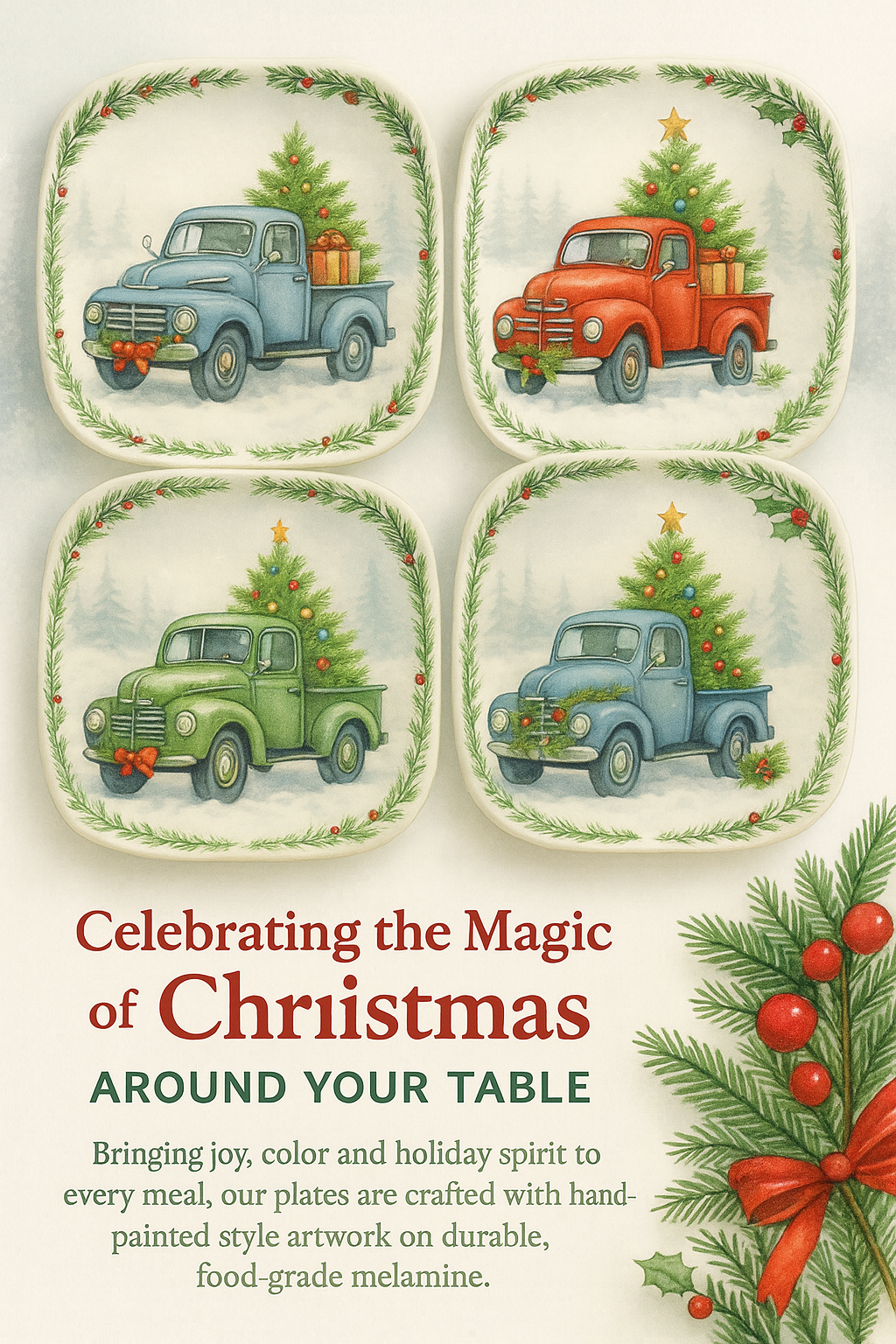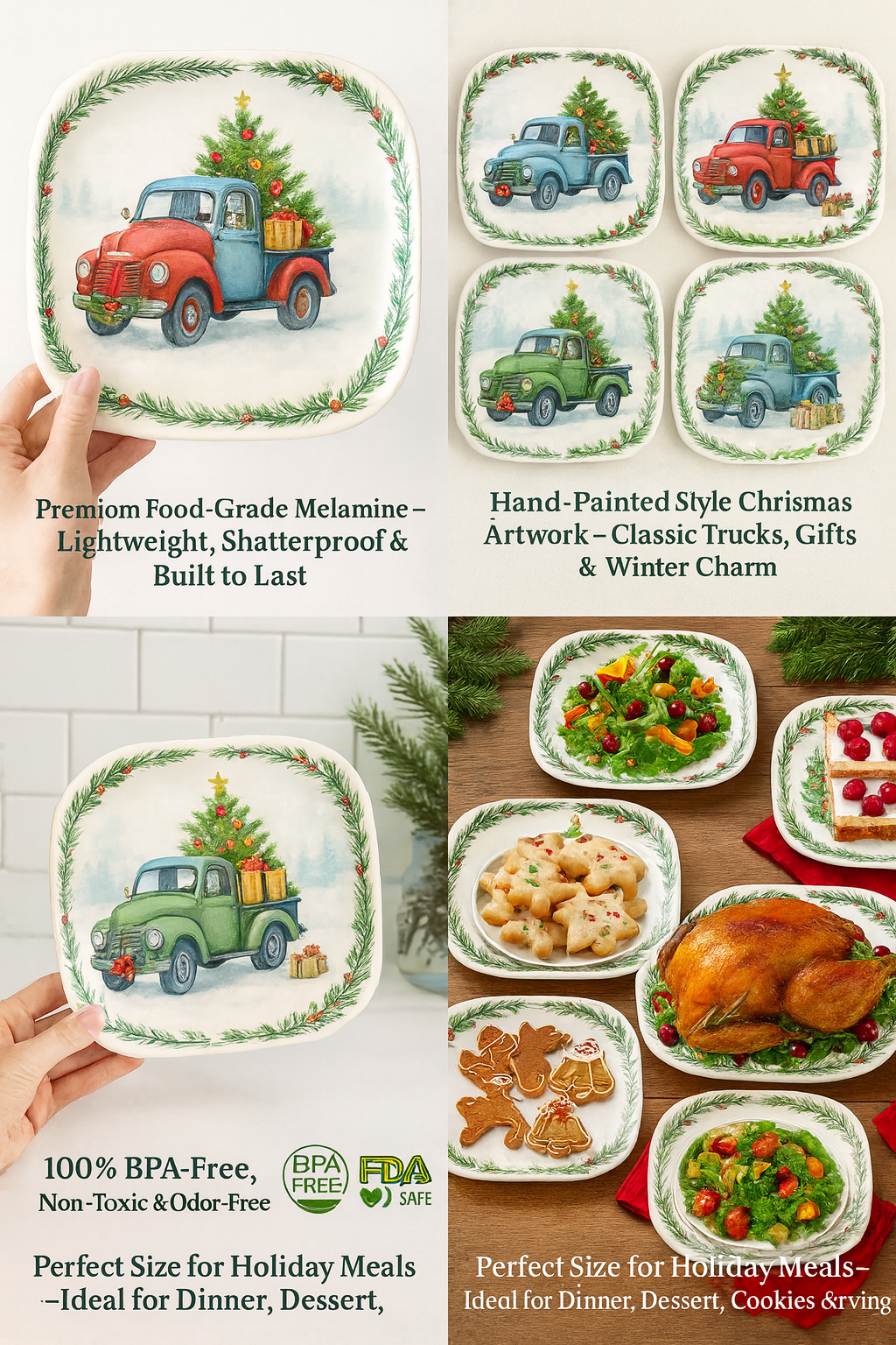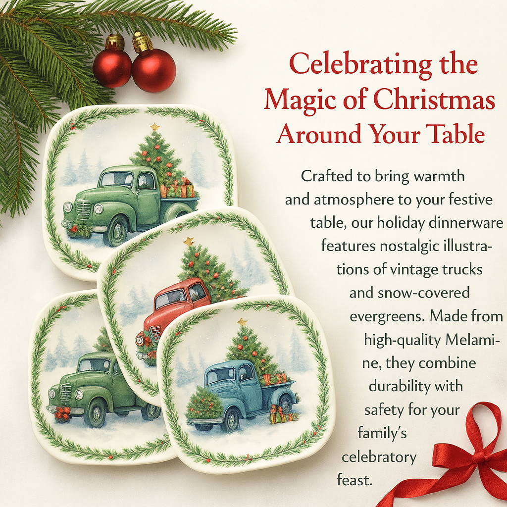 Set of 4 8 inch melamine Christmas appetizer plates featuring vintage truck designs with festive trees, gifts, and pine borders. Made of BPA-free melamine, these plates are shatterproof, lightweight, and dishwasher safe (top rack). Ideal for holiday dinners, seasonal displays, and gift sets.