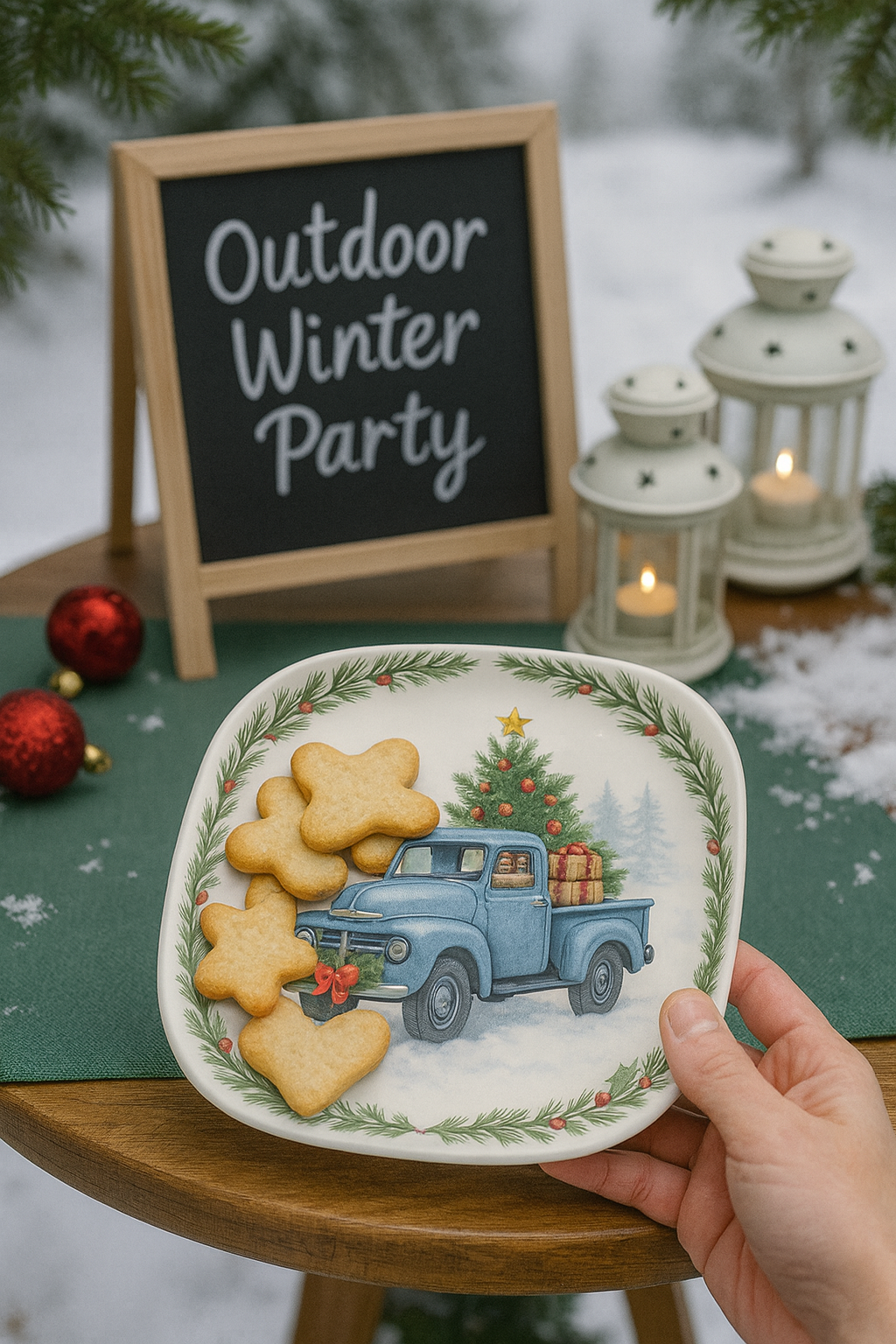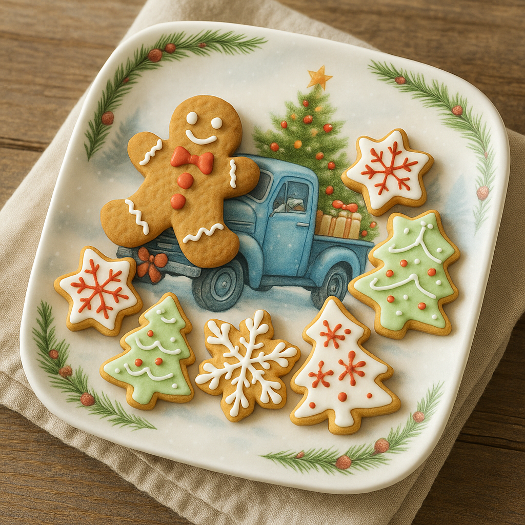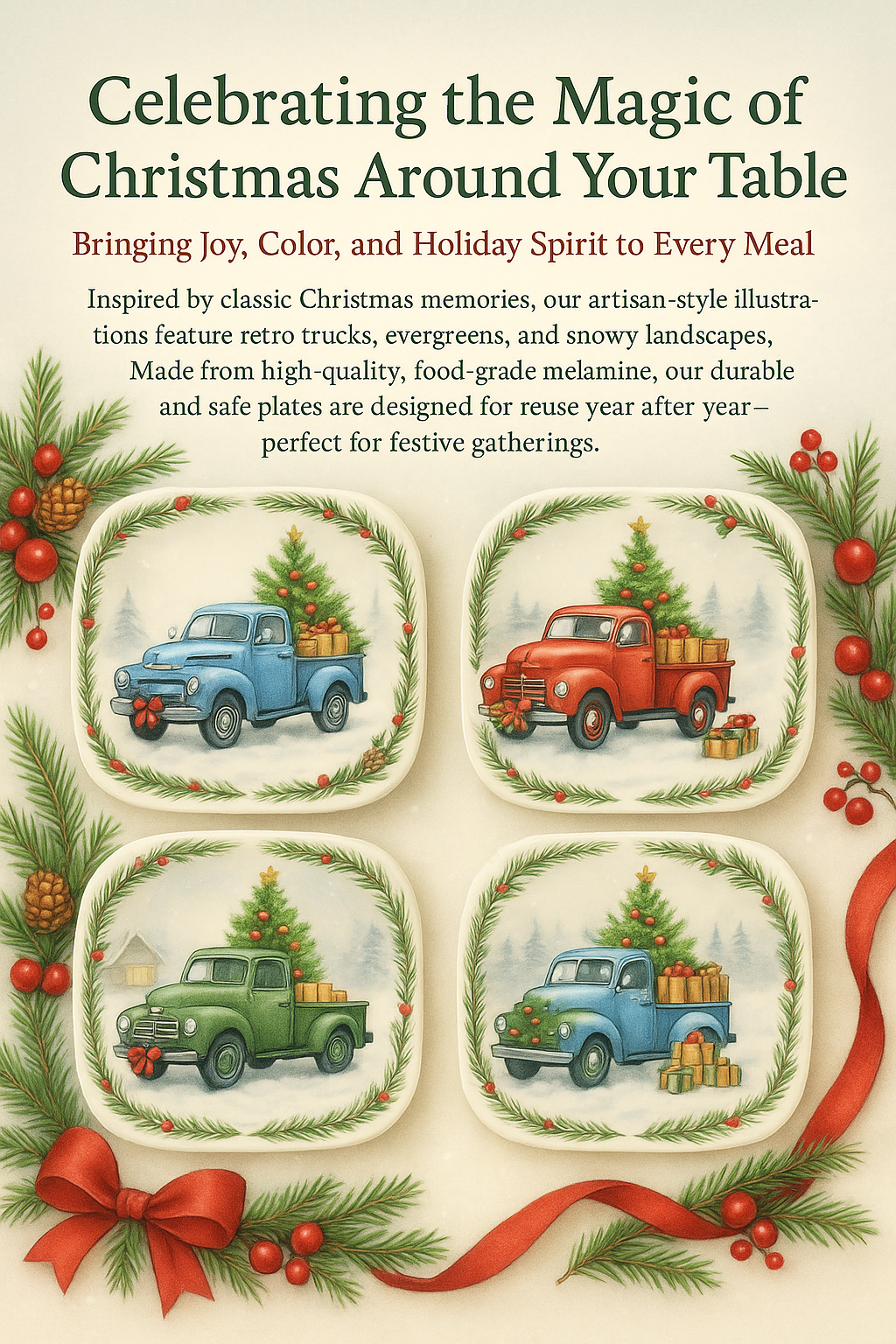 Set of 4 8 inch melamine Christmas appetizer plates featuring vintage truck designs with festive trees, gifts, and pine borders. Made of BPA-free melamine, these plates are shatterproof, lightweight, and dishwasher safe (top rack). Ideal for holiday dinners, seasonal displays, and gift sets.