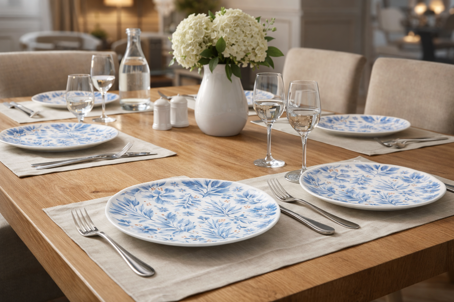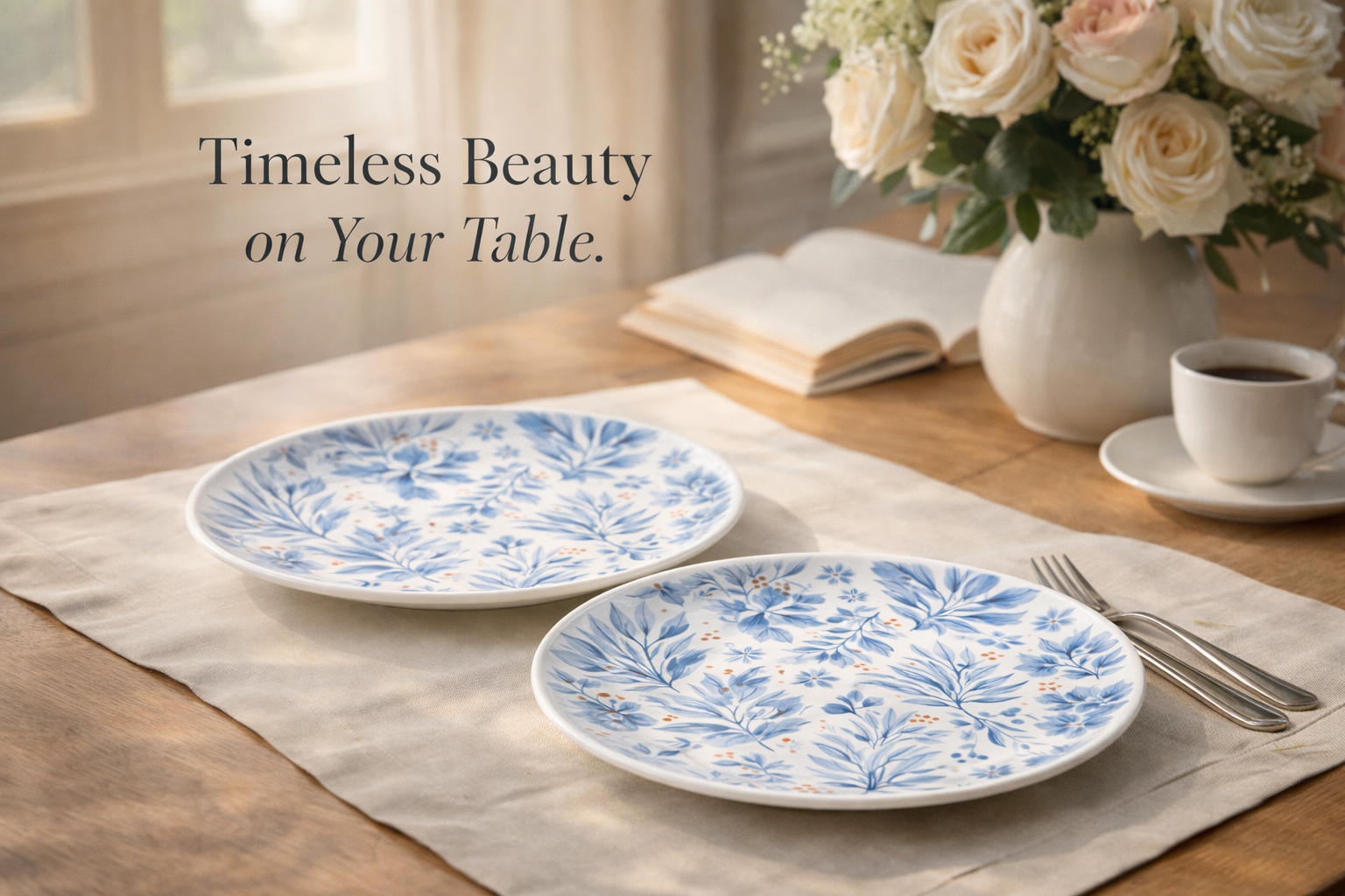 A refined blue-and-white botanical pattern inspired by classic European tableware, featuring soft leaves and delicate details for a calm, elegant look.