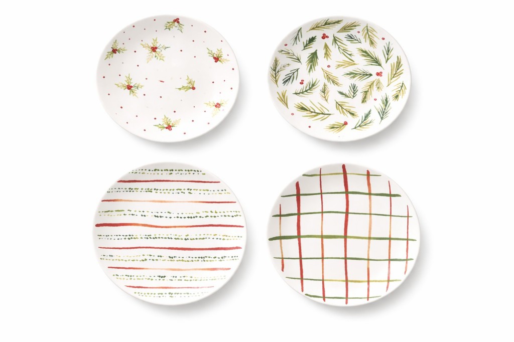 Features greenery, holly, pine branches, stripes and plaid designs.