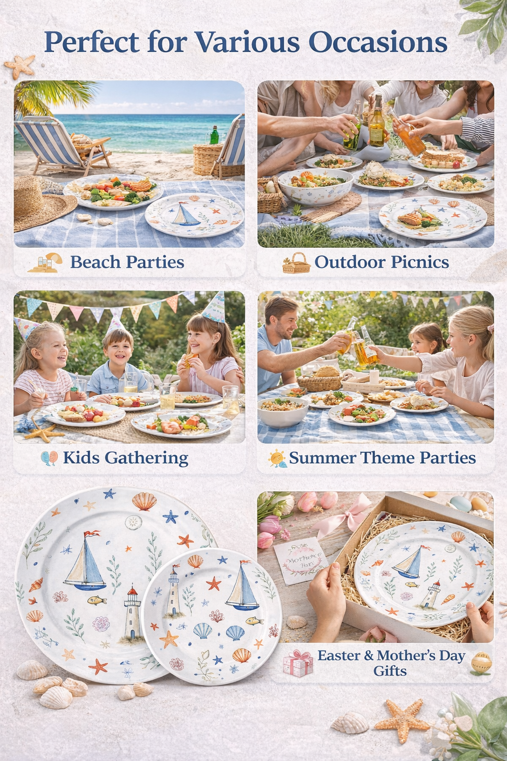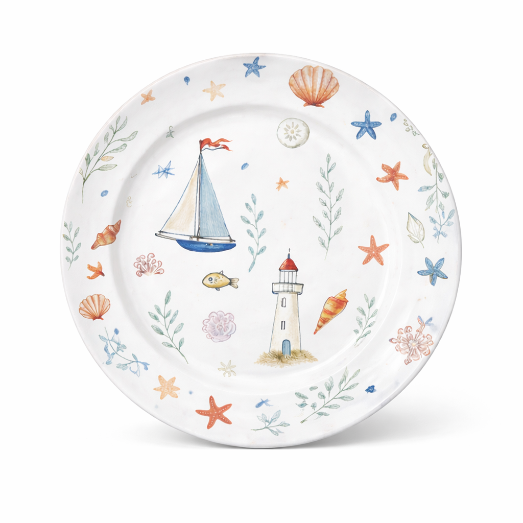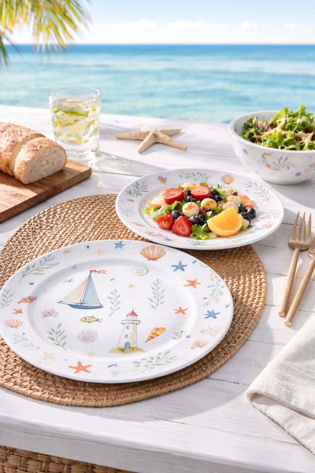 Features delicate nautical illustrations inspired by the sea, including sailboats, lighthouses, shells, and starfish—bringing a relaxed coastal feel to your table.