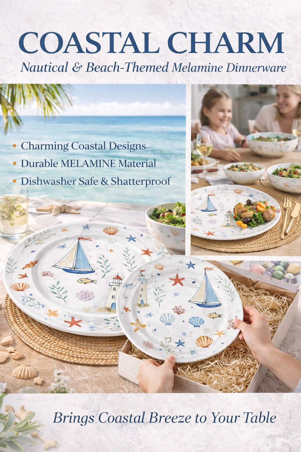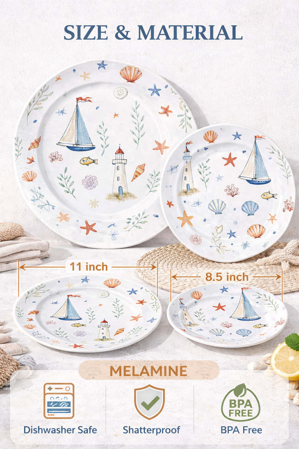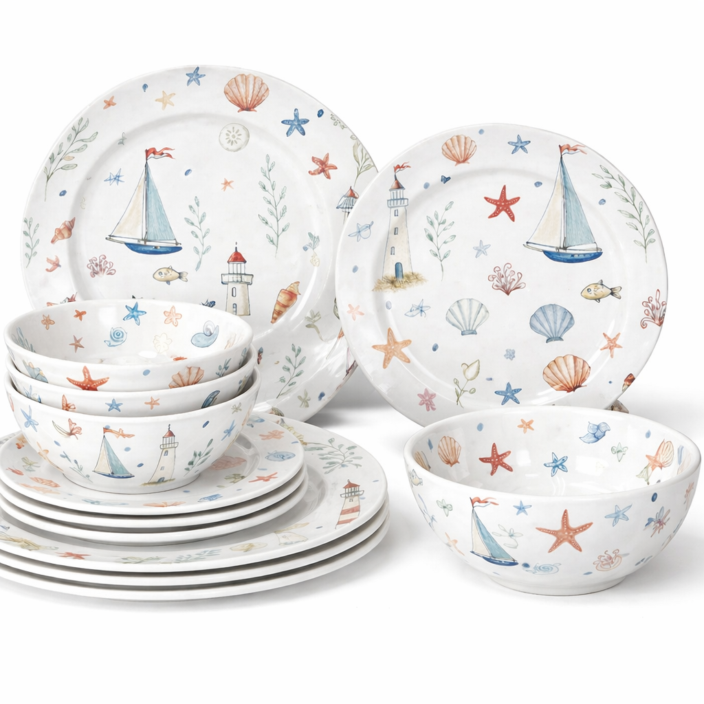 Features delicate nautical illustrations inspired by the sea, including sailboats, lighthouses, shells, and starfish—bringing a relaxed coastal feel to your table.