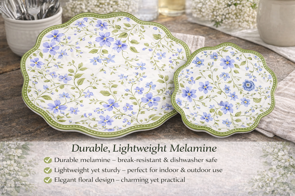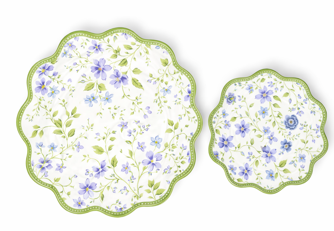 Soft blue florals with a scalloped green edge create a fresh, spring-ready table look.