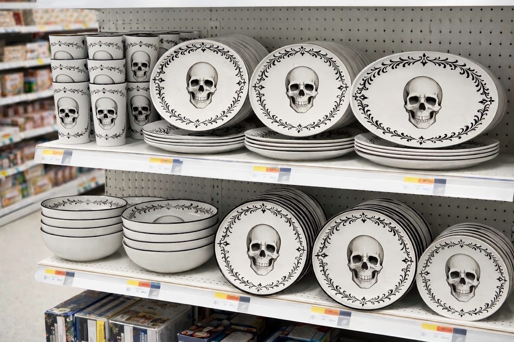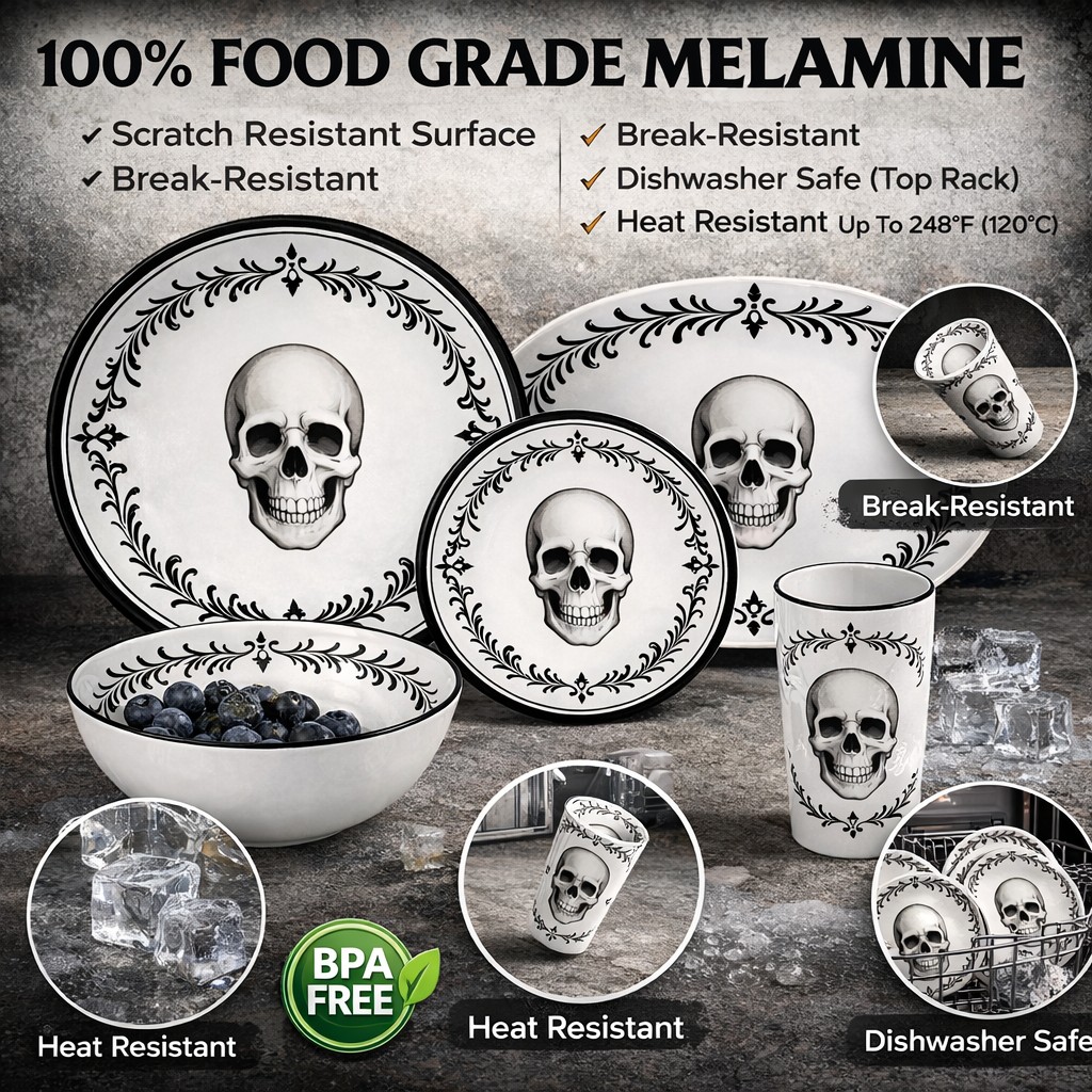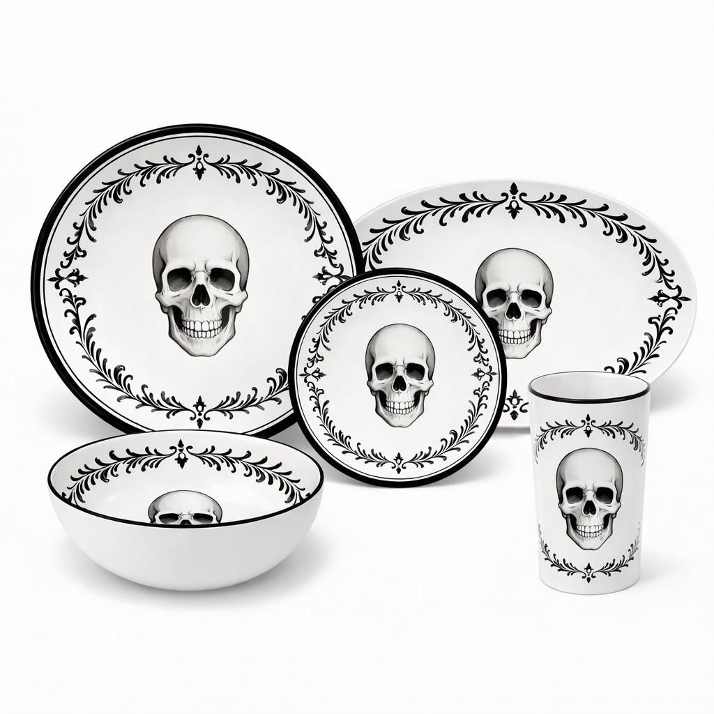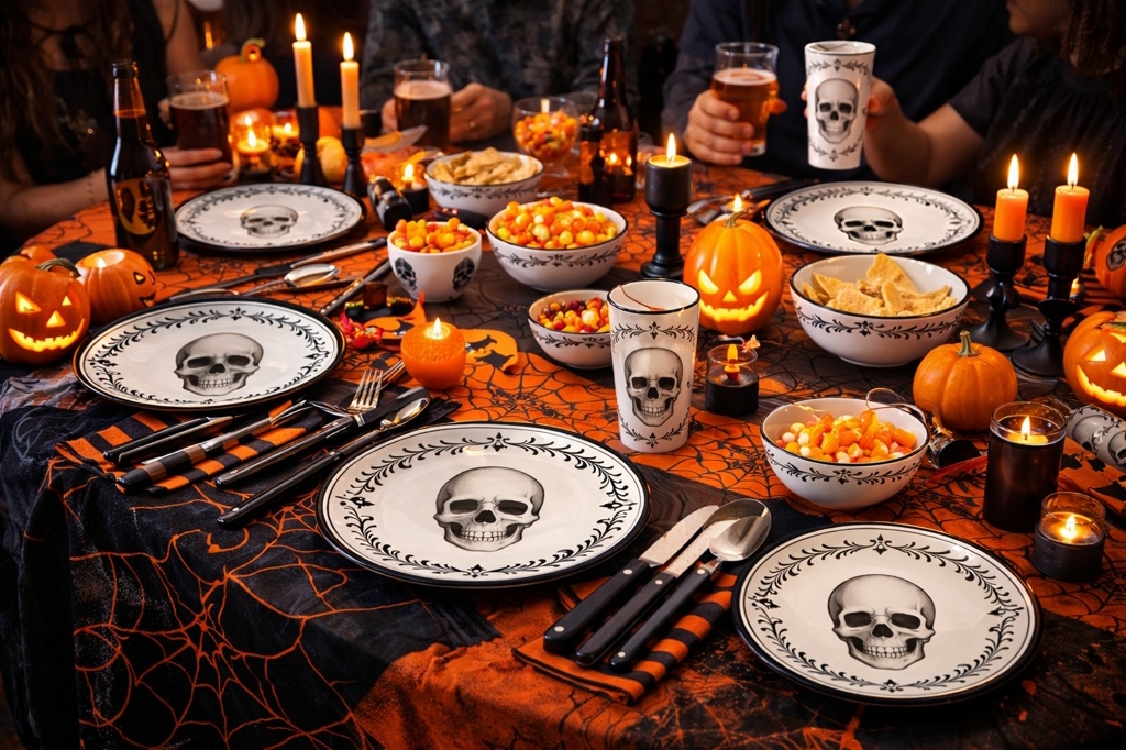 Includes dinner plates, salad plates, bowls, serving platter, and tumbler — perfect for a cohesive Halloween table setting.