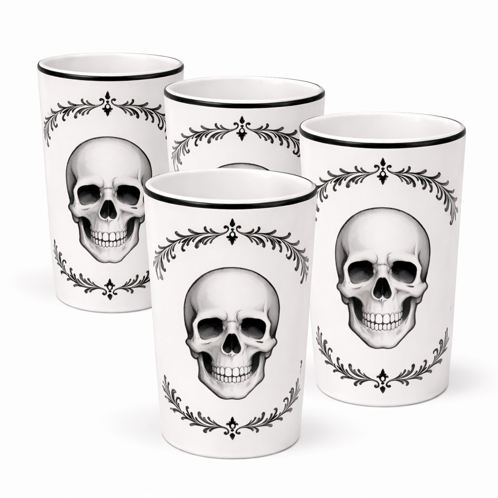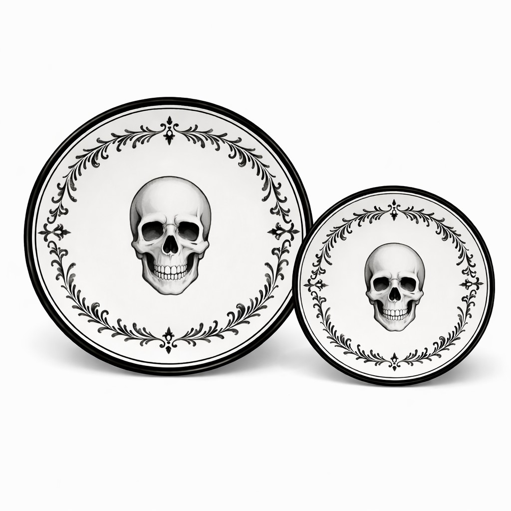 Black & white vintage skull artwork with elegant scroll detailing — bold Halloween table decor.