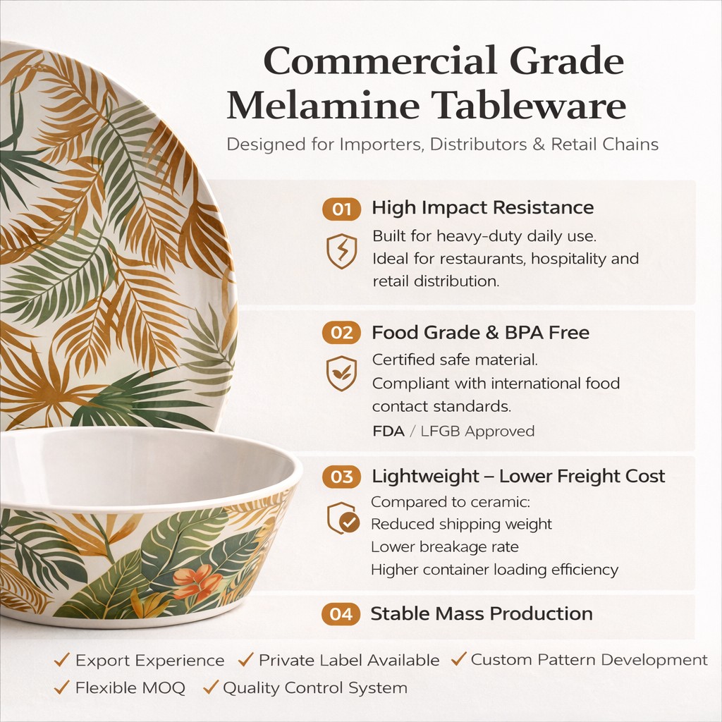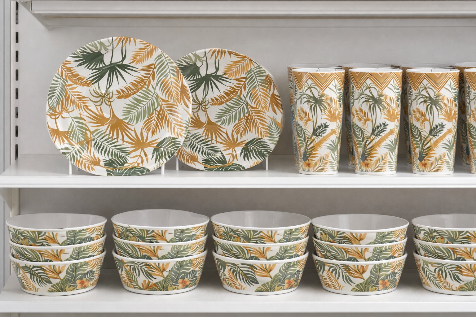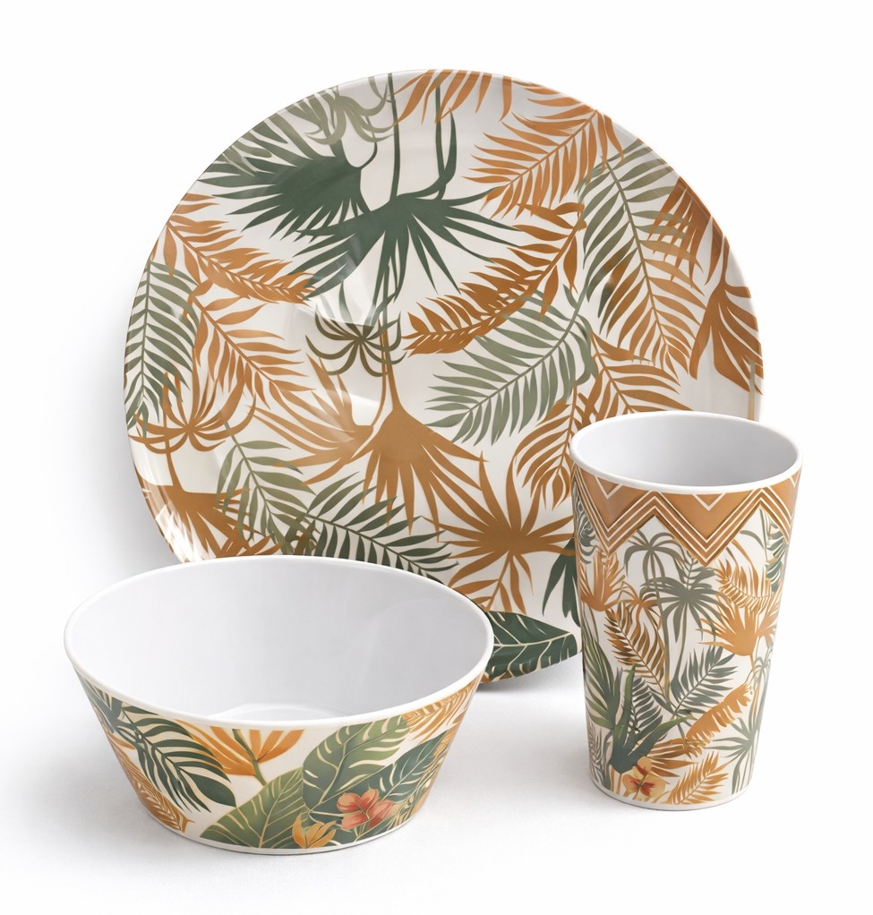Inspired by Latin tropical nature, this melamine dinnerware features vibrant leaf patterns that bring warmth and color to everyday dining.