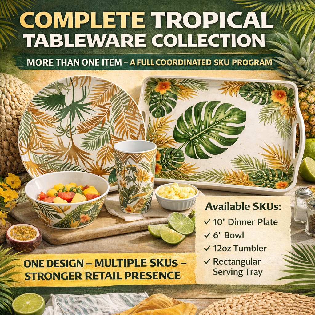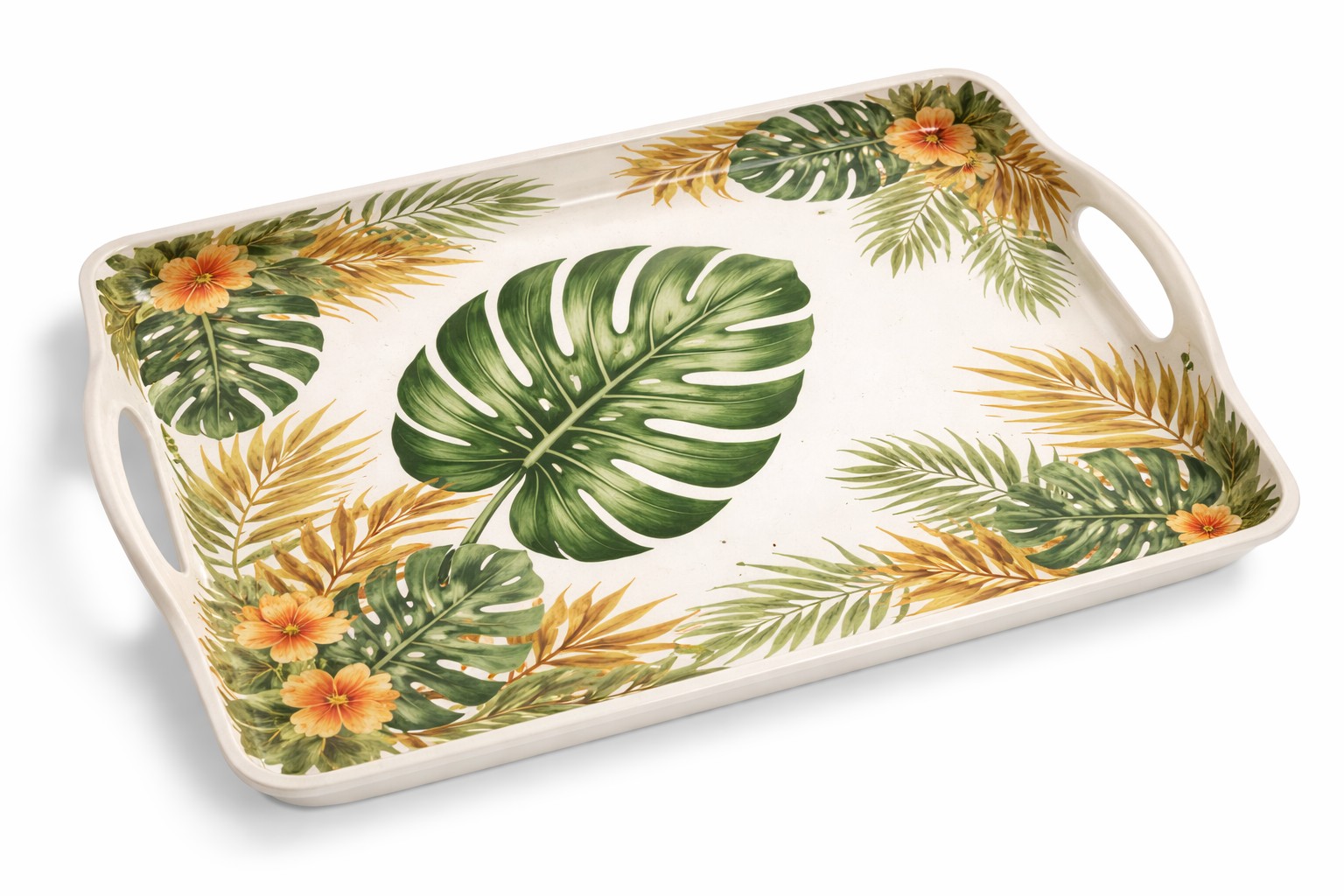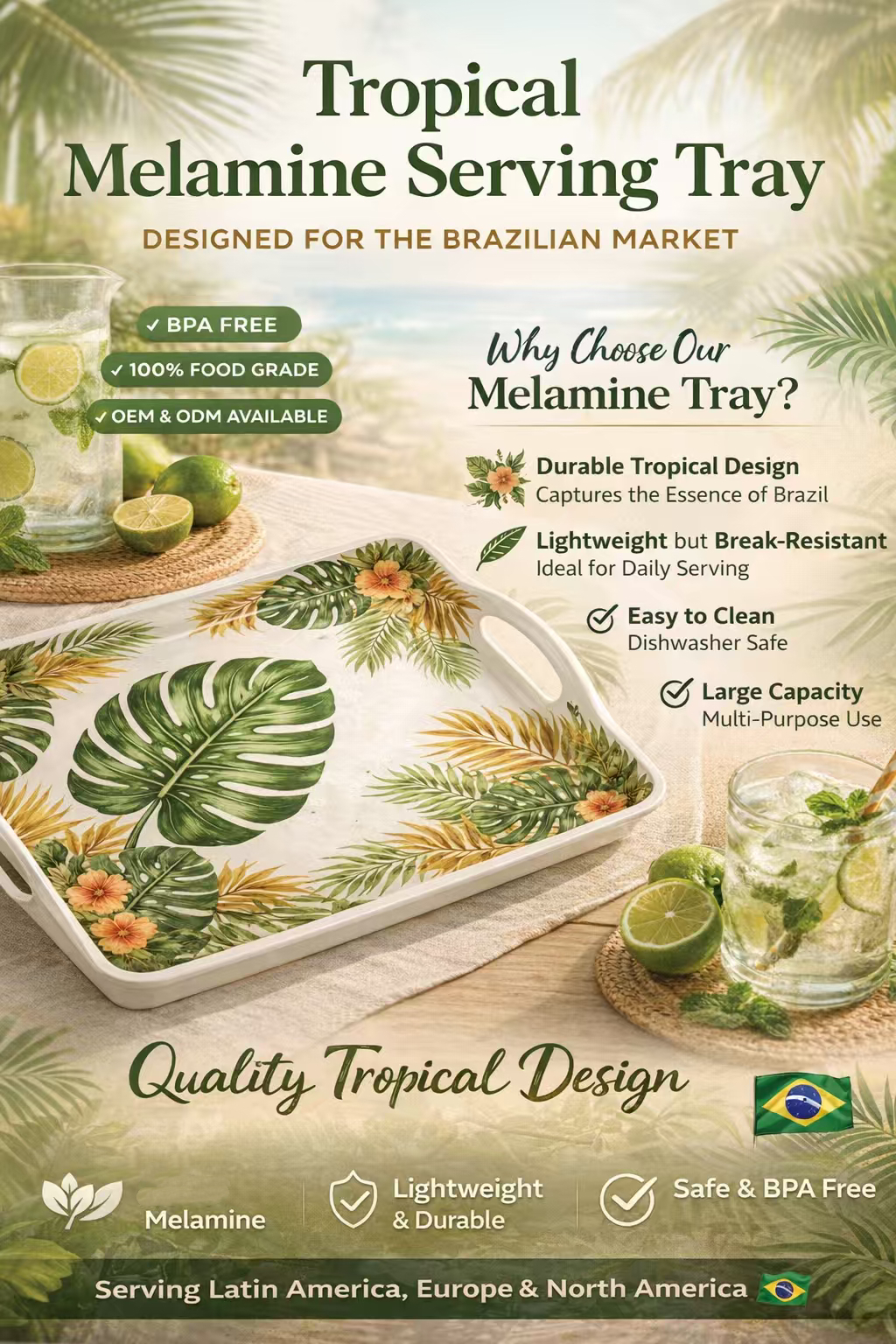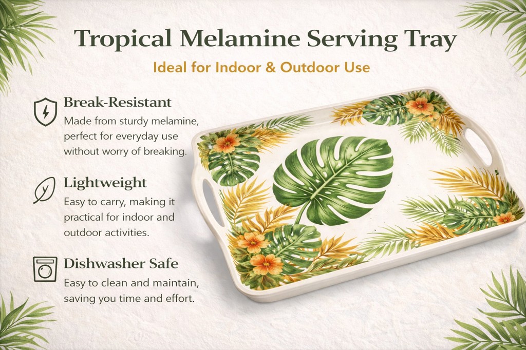 Tropical Design Concept Inspired by Brazilian tropical lifestyle, this melamine serving tray features vibrant leaf patterns perfect for outdoor and daily use.