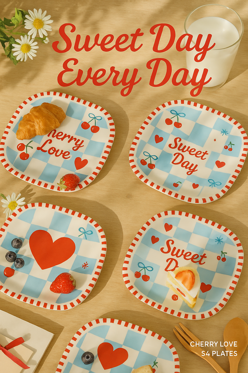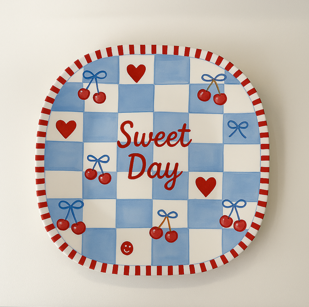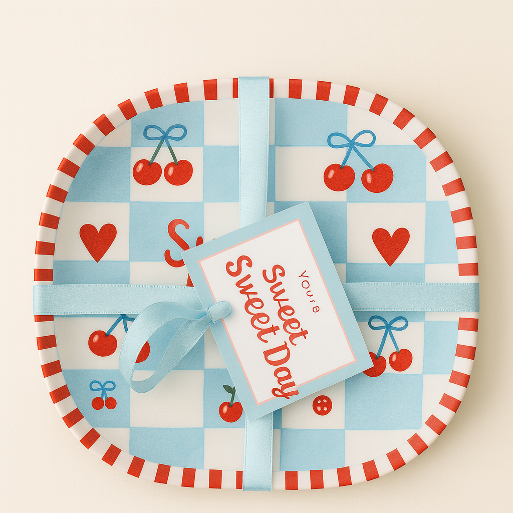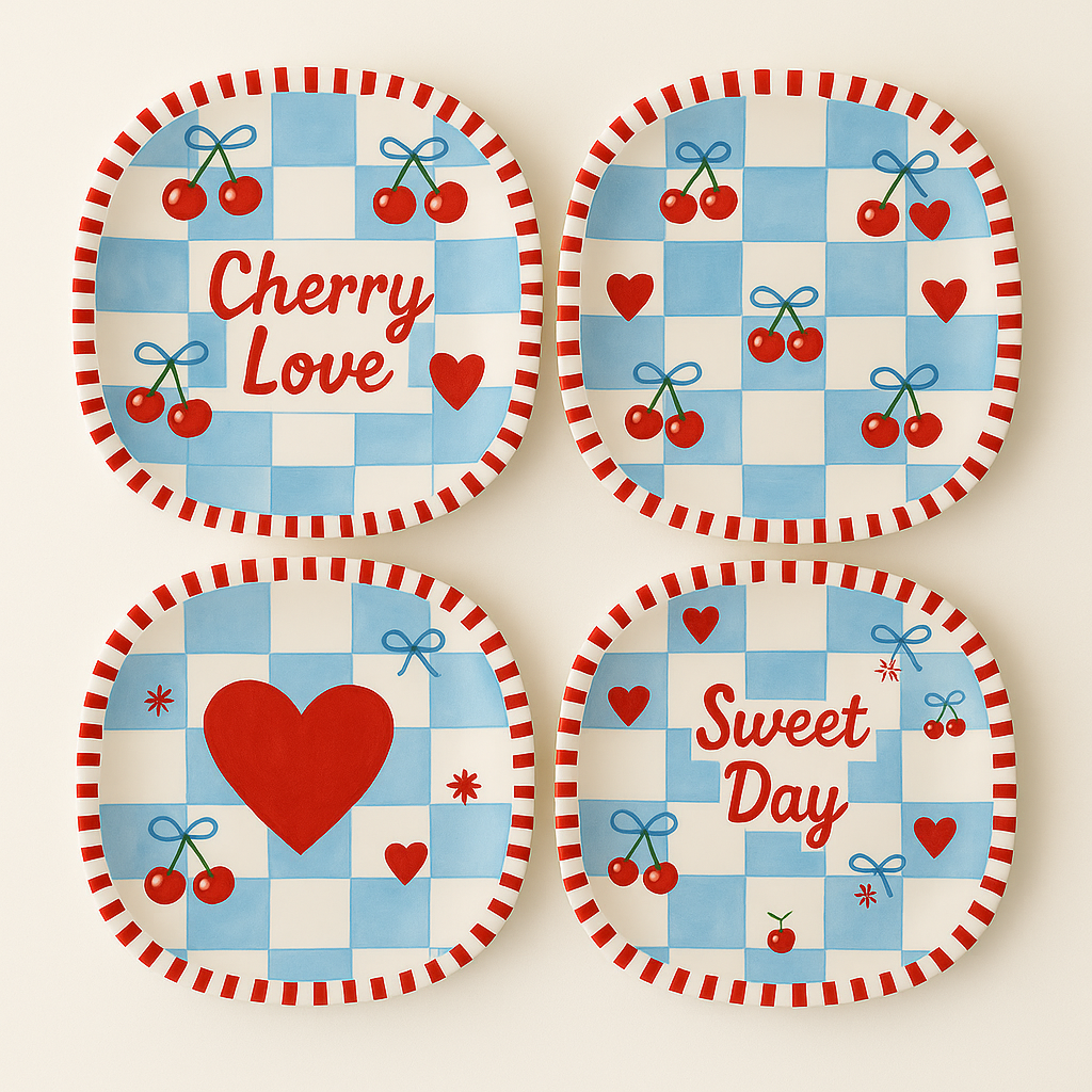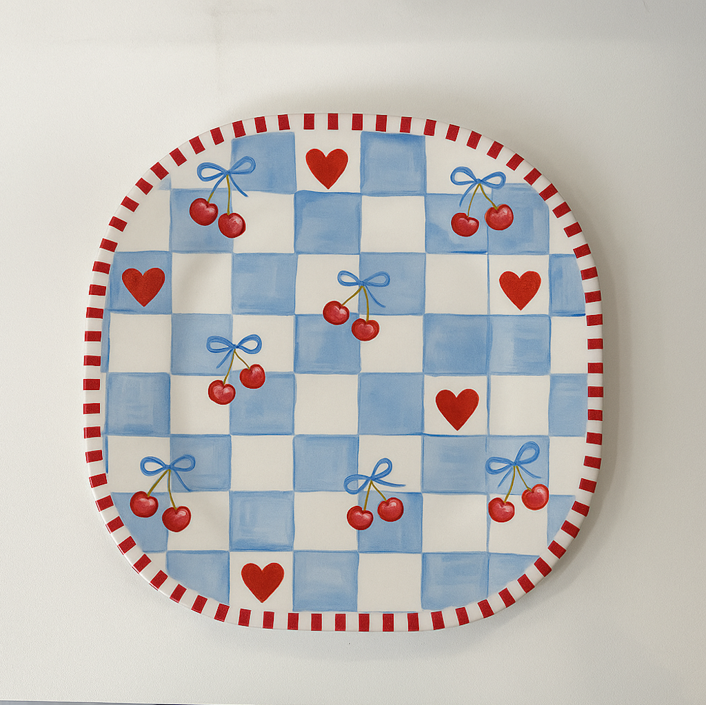 Features a charming cherry and heart pattern with classic blue checkered design, ideal for Valentine’s Day, themed parties, and seasonal table settings.